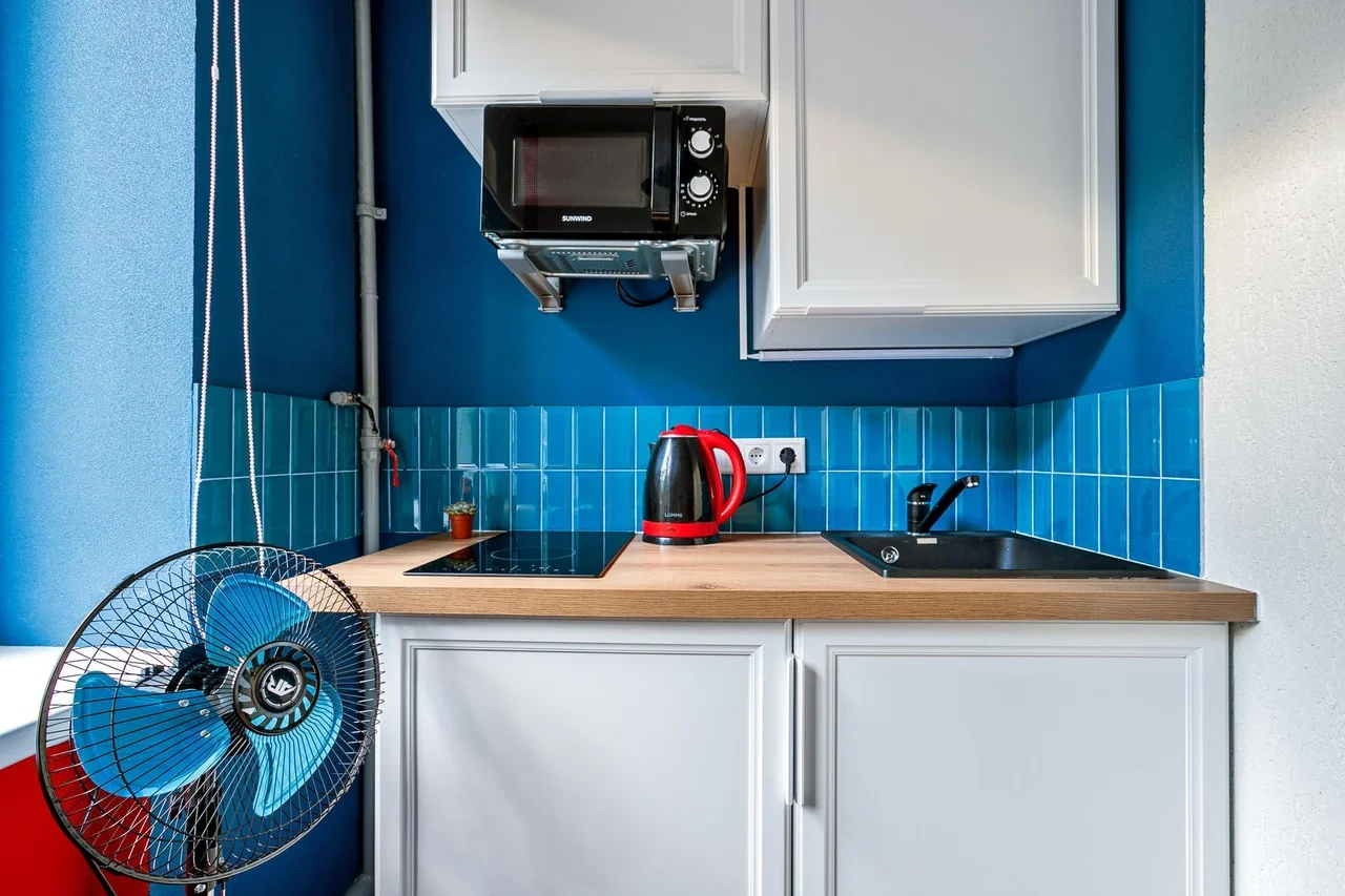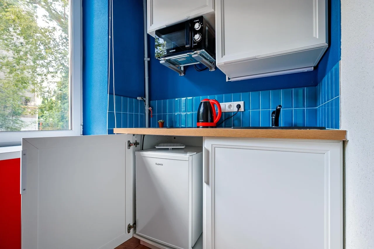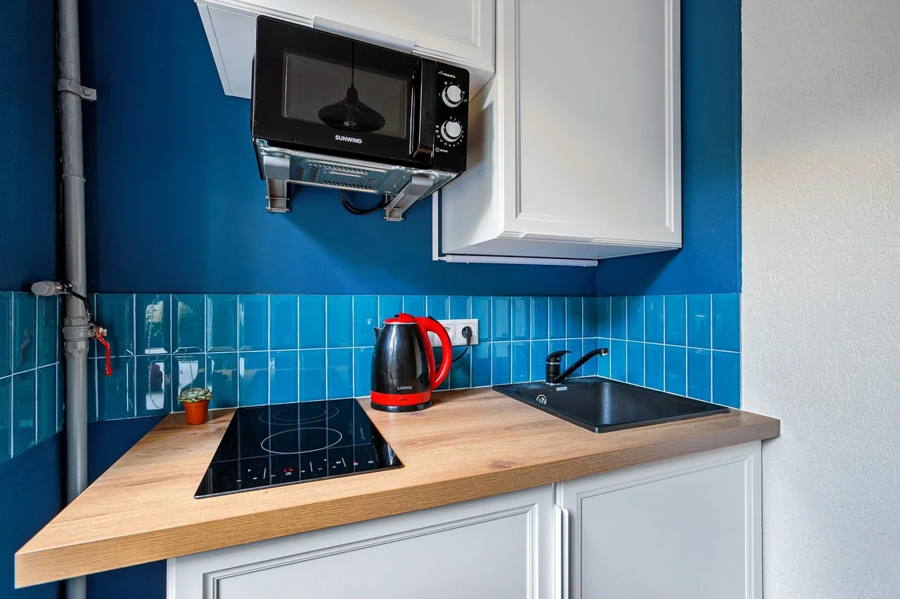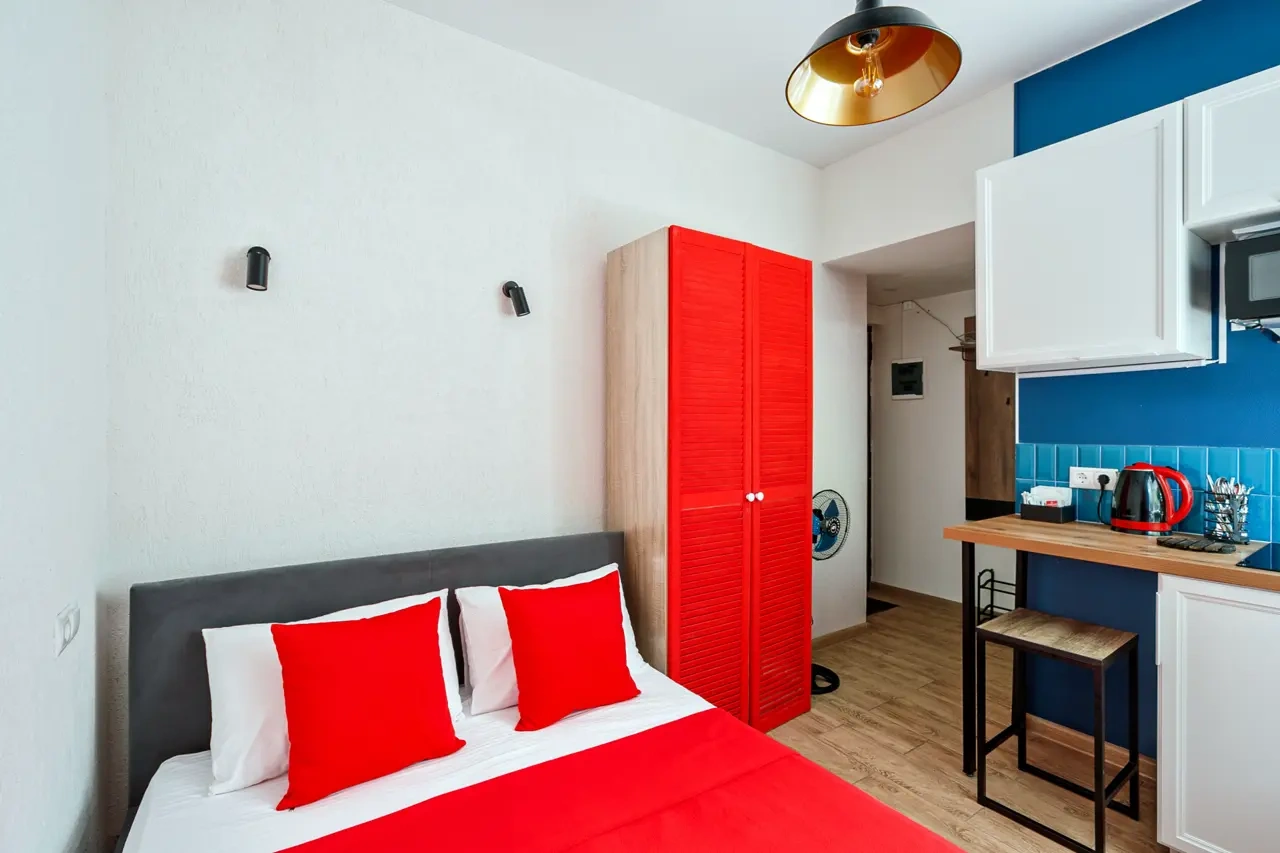 Студия небольшая и комфортная, есть маленькая кухня, пространства хватит максимум для двоих человек и может одного ребенка. Но мне одной было достаточно и места и всего, чем студия была оборудована