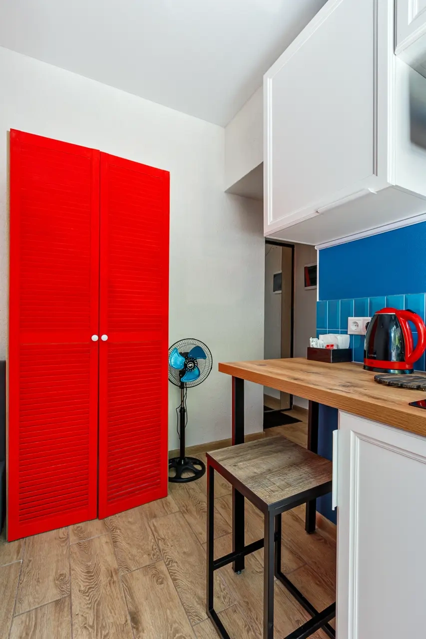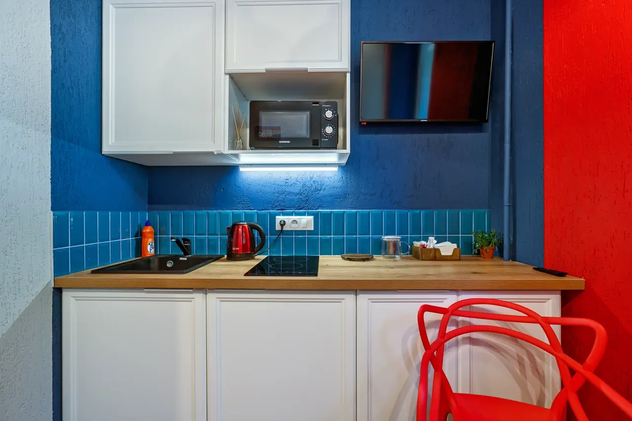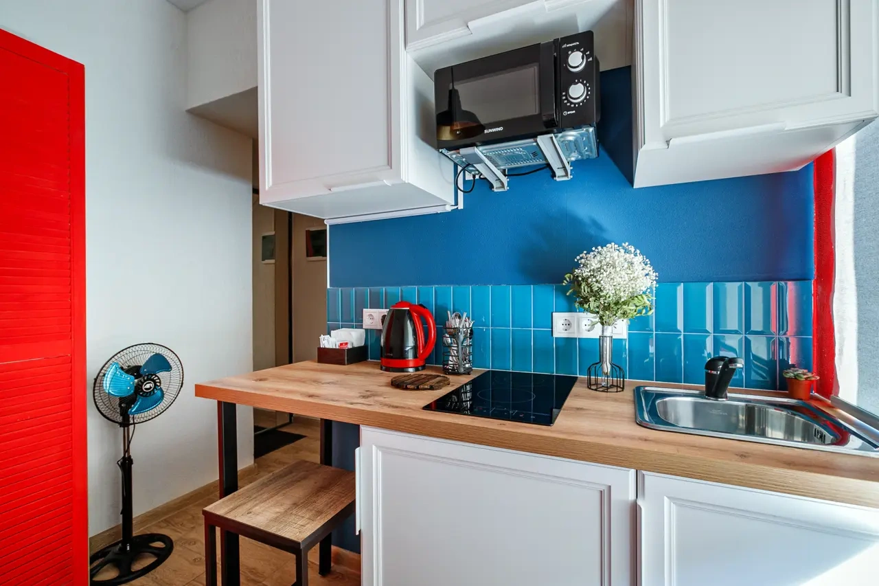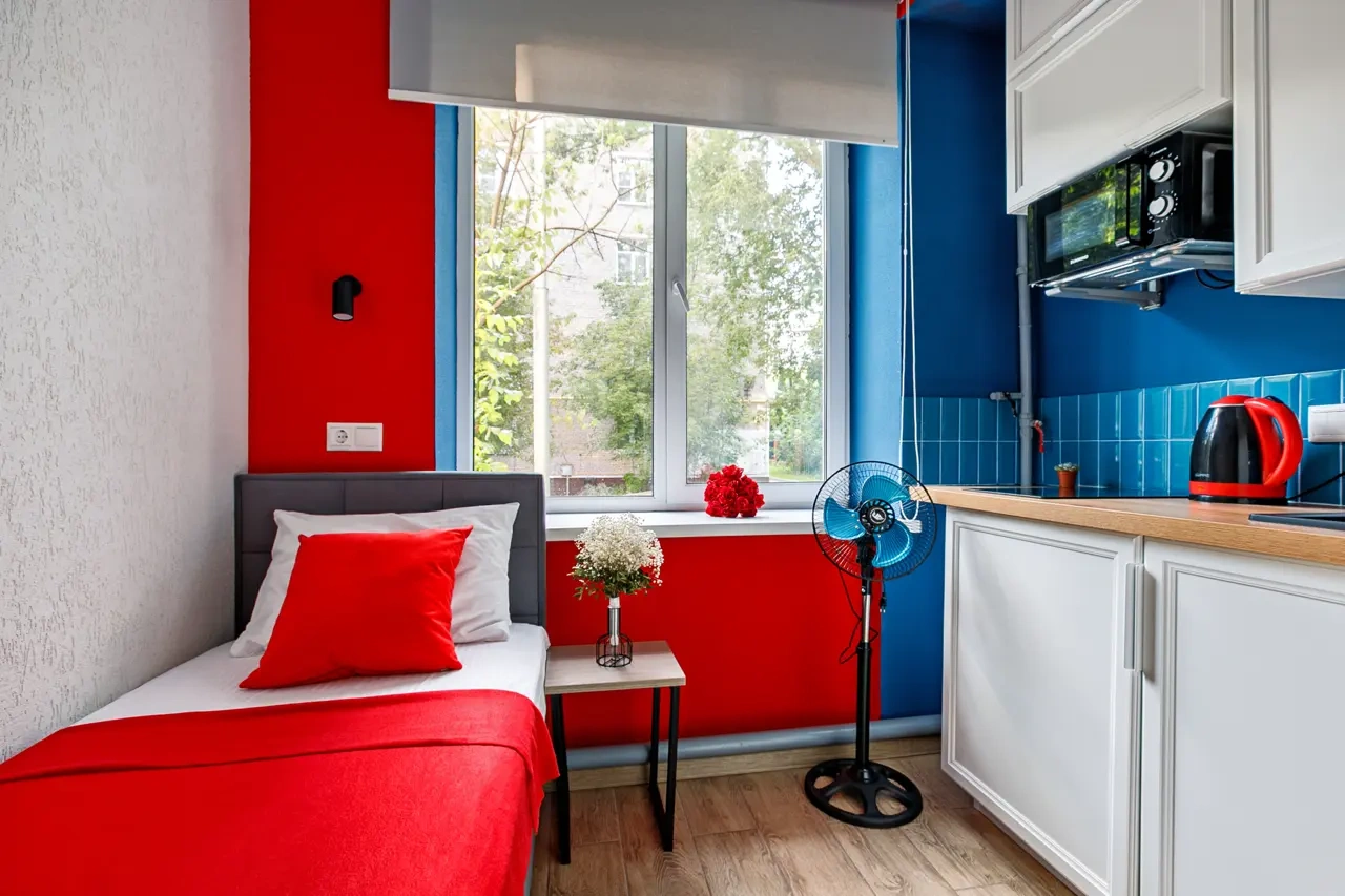 Студия небольшая и комфортная, есть маленькая кухня, пространства хватит максимум для двоих человек и может одного ребенка. Но мне одной было достаточно и места и всего, чем студия была оборудована