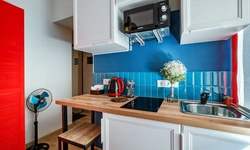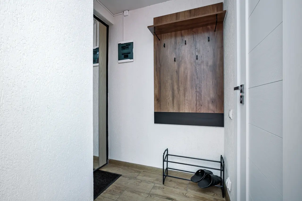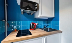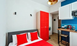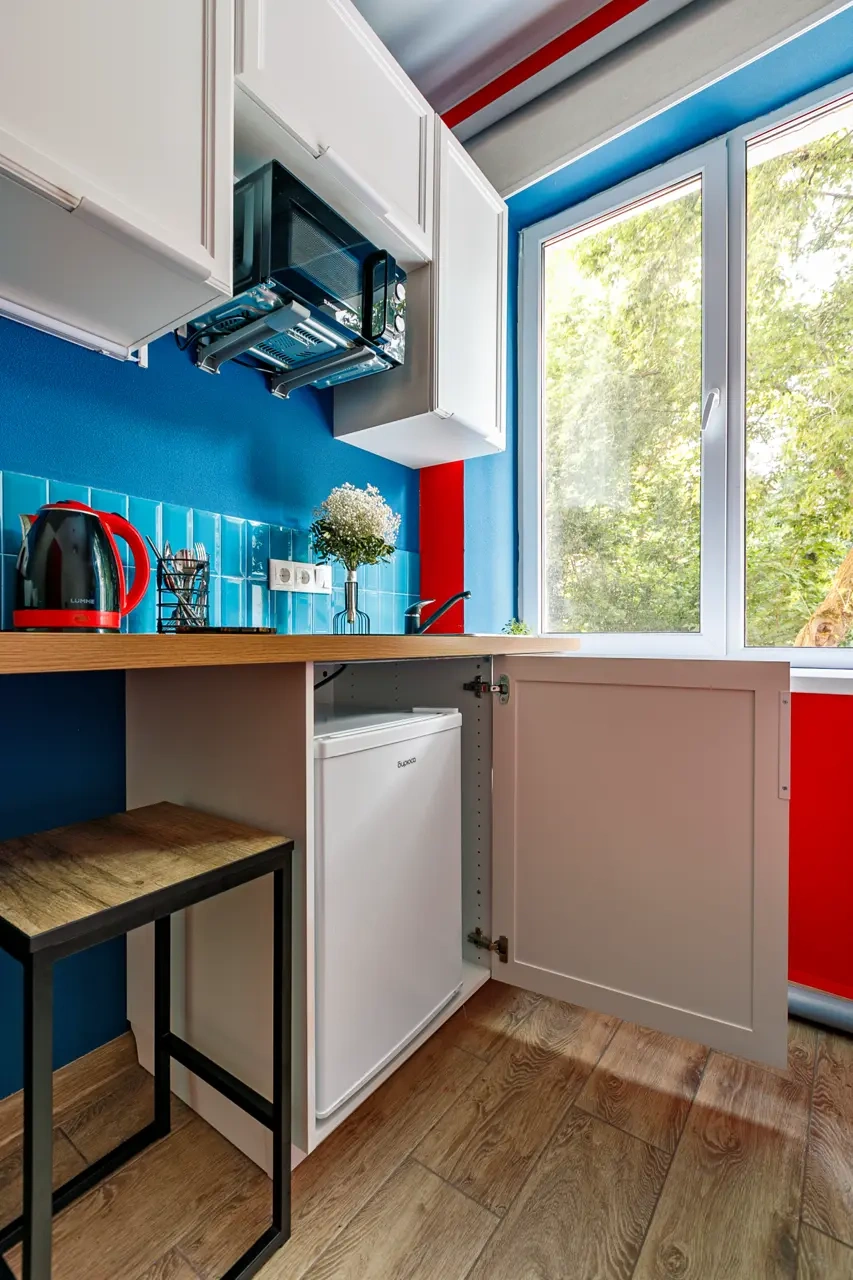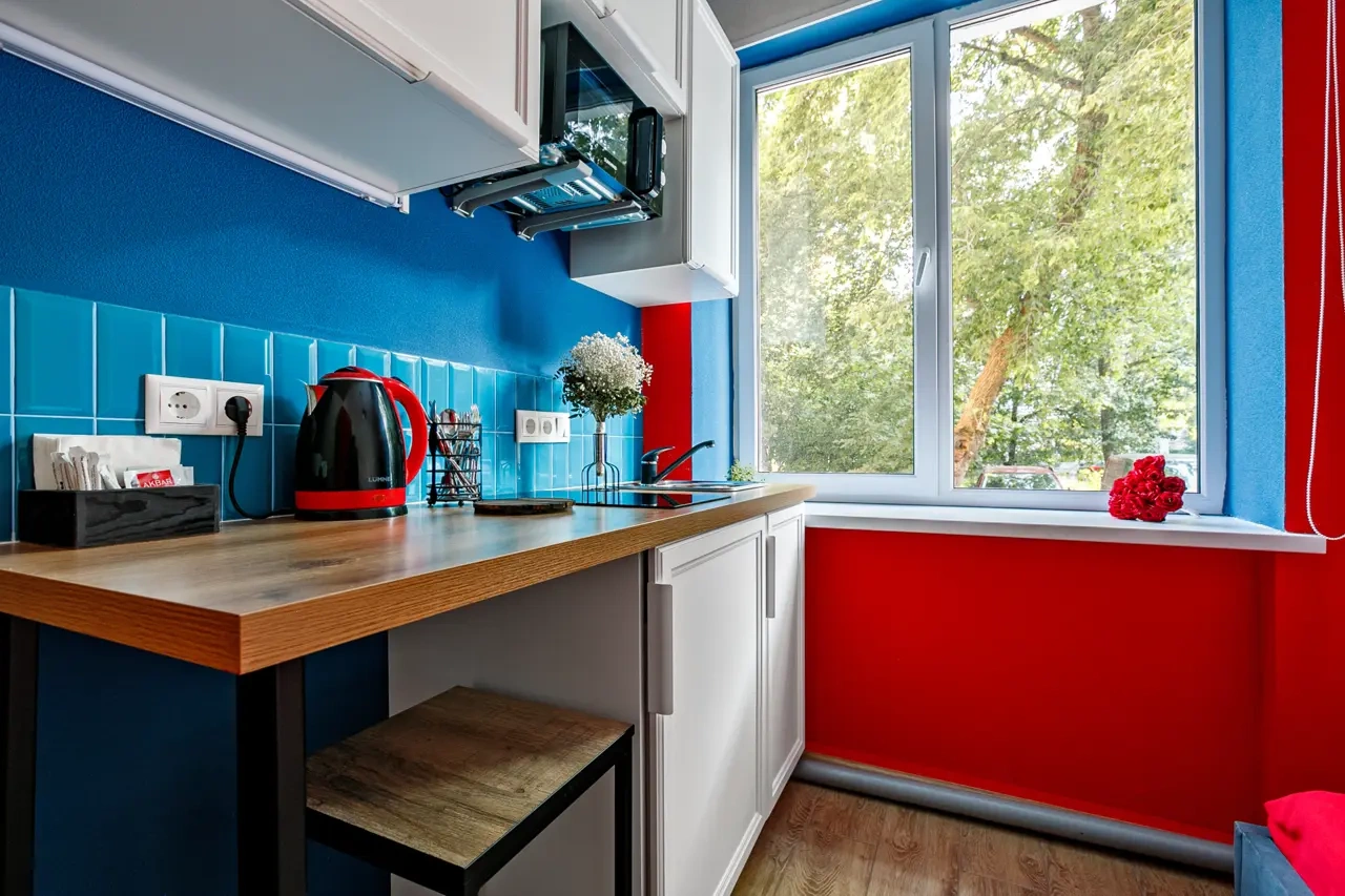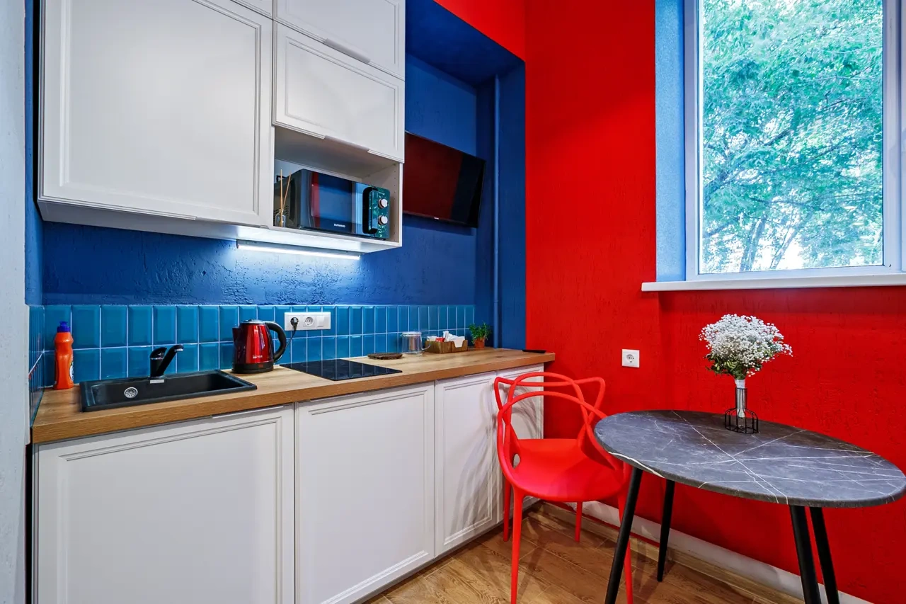 Студия небольшая и комфортная, есть маленькая кухня, пространства хватит максимум для двоих человек и может одного ребенка. Но мне одной было достаточно и места и всего, чем студия была оборудована