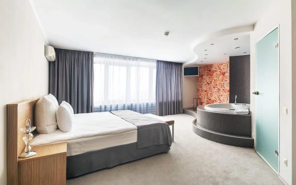 Мрачный, уставший. Лифты большинство не работают. На этаже свет плохо работает. Темные коридоры. В номере пахнет сем-то. Прокурен. Мебель дешевая. Ремонт в стиле начала 2000х. Очень депрессивное место