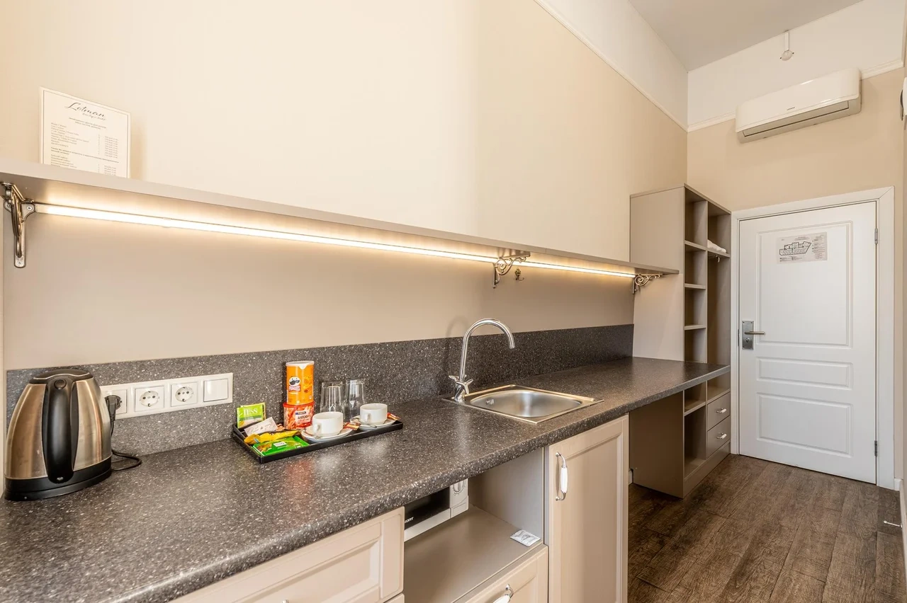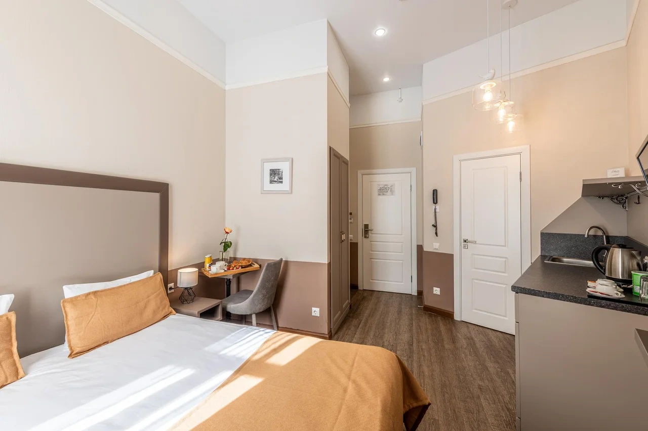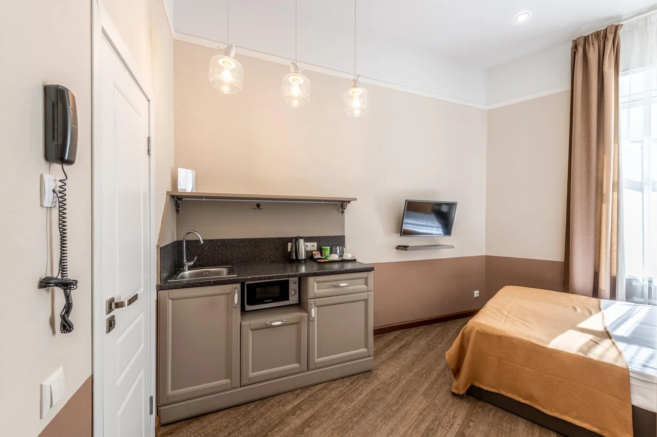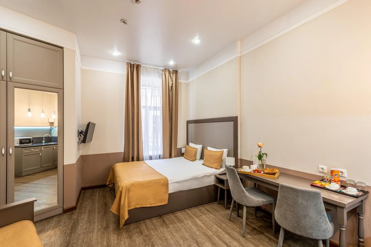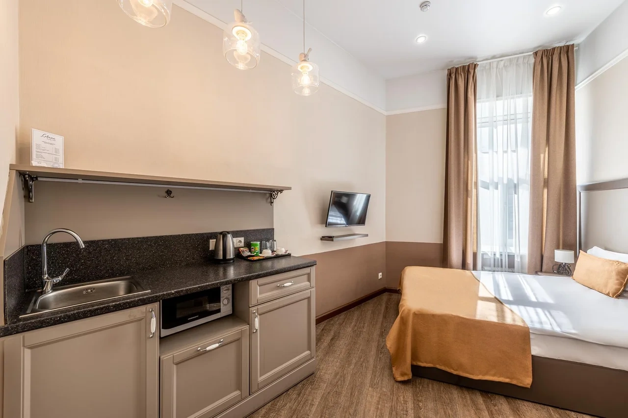 Для Вас каждый номер оснащен всем необходимым для комфортного проживания: зона отдыха и небольшая рабочая зона, мини-бар, смарт ТВ, собственная ванная комната со всеми необходимыми удобствами. В категориях "Комфорт" и "Люкс" присутствует мини-кухня и телефон.