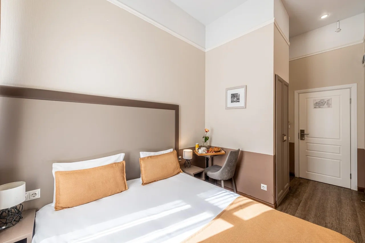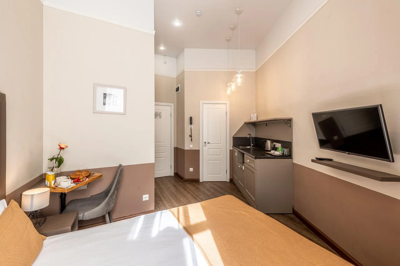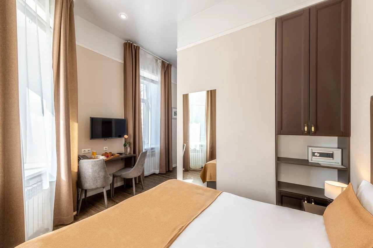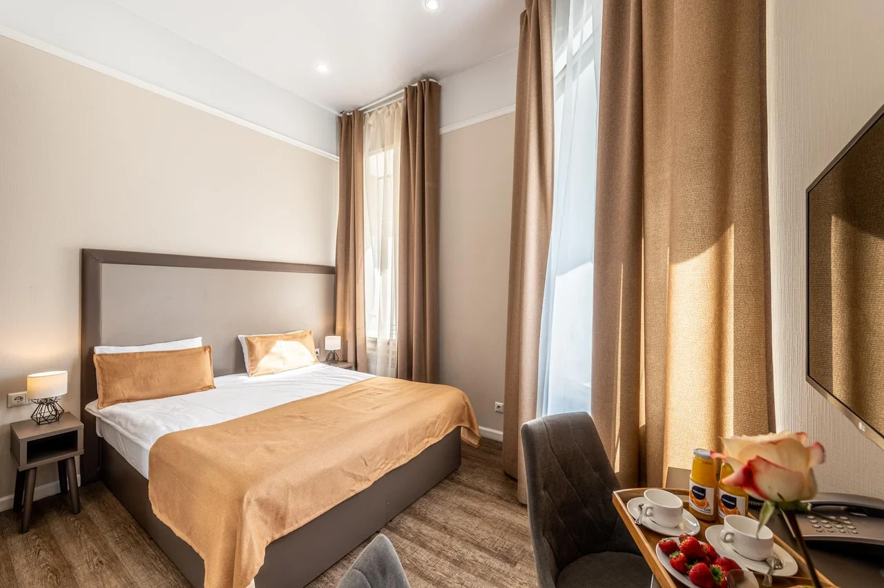 Для Вас каждый номер оснащен всем необходимым для комфортного проживания: зона отдыха и небольшая рабочая зона, мини-бар, смарт ТВ, собственная ванная комната со всеми необходимыми удобствами. В категориях "Комфорт" и "Люкс" присутствует мини-кухня и телефон.