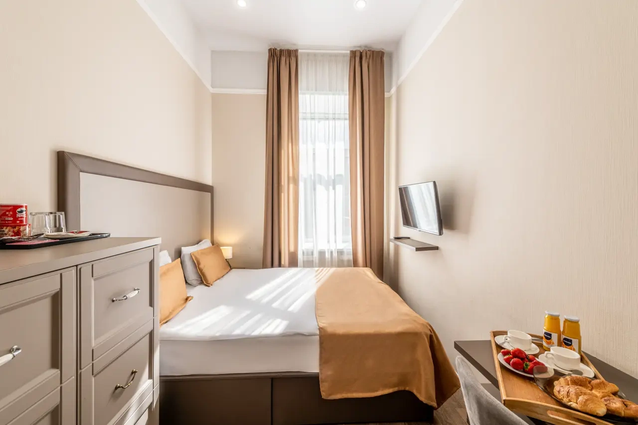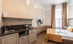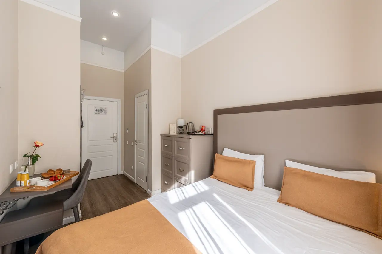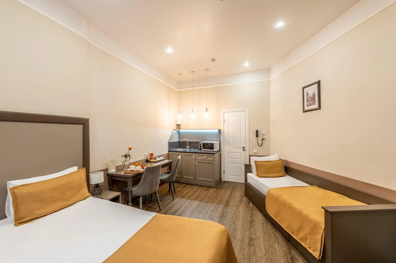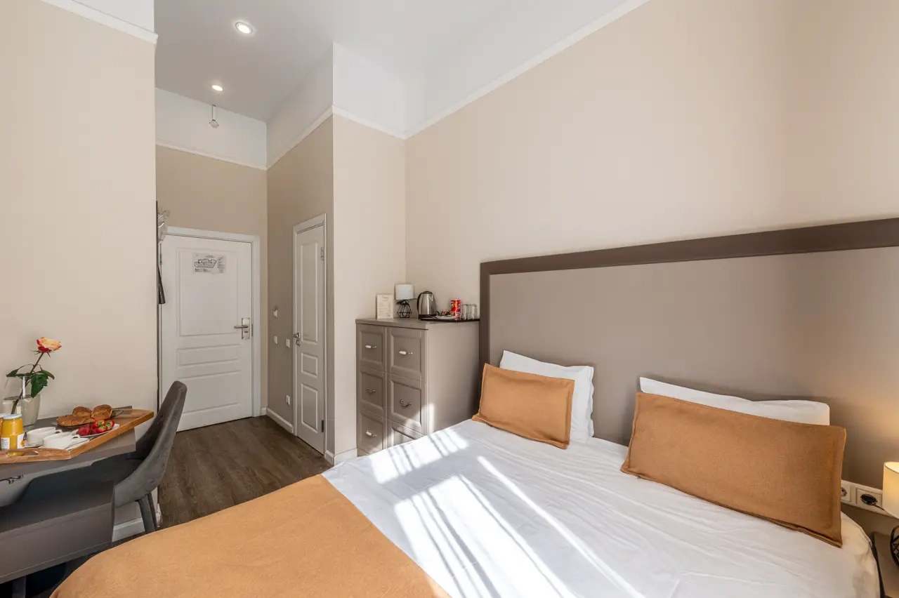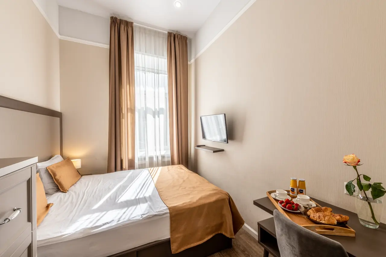 Для Вас каждый номер оснащен всем необходимым для комфортного проживания: зона отдыха и небольшая рабочая зона, мини-бар, смарт ТВ, собственная ванная комната со всеми необходимыми удобствами. В категориях "Комфорт" и "Люкс" присутствует мини-кухня и телефон.