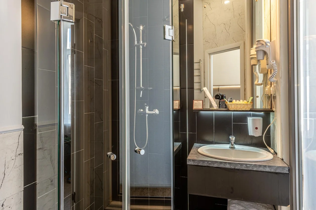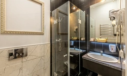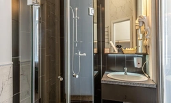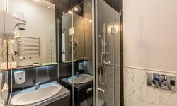 В душевой кабине течет лейка, нет полотенца для ног. Мыло для рук разбавленное водой, как и гель для душа и шампунь.