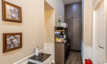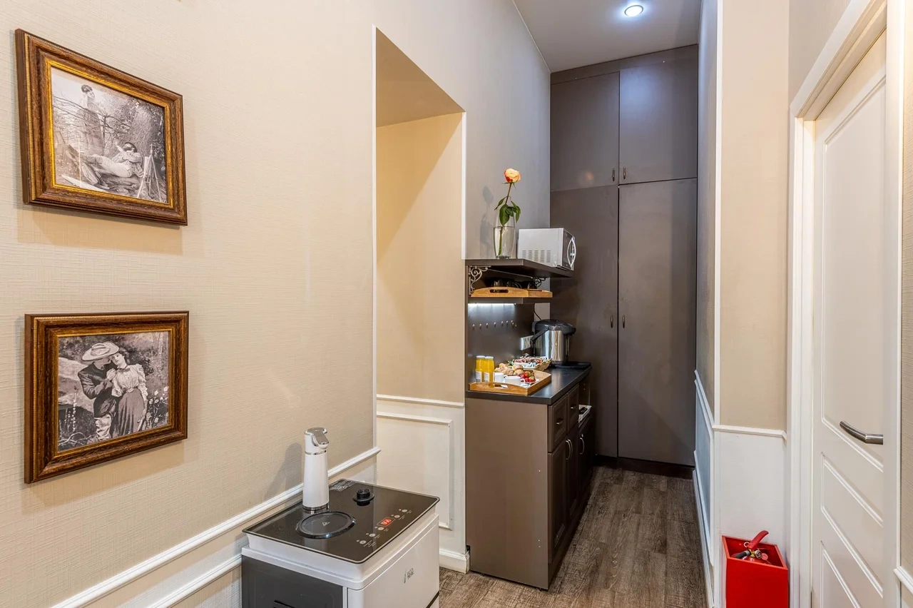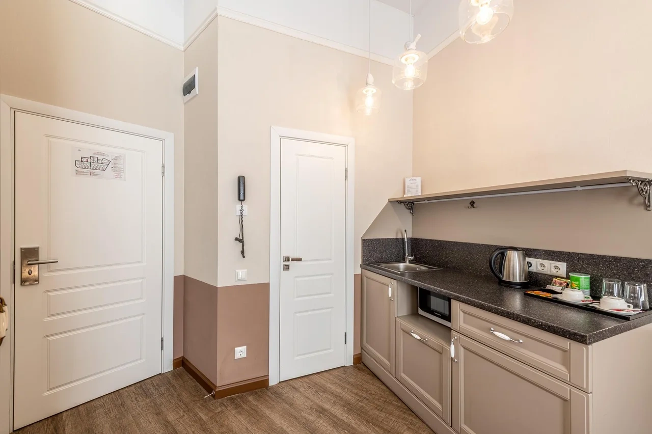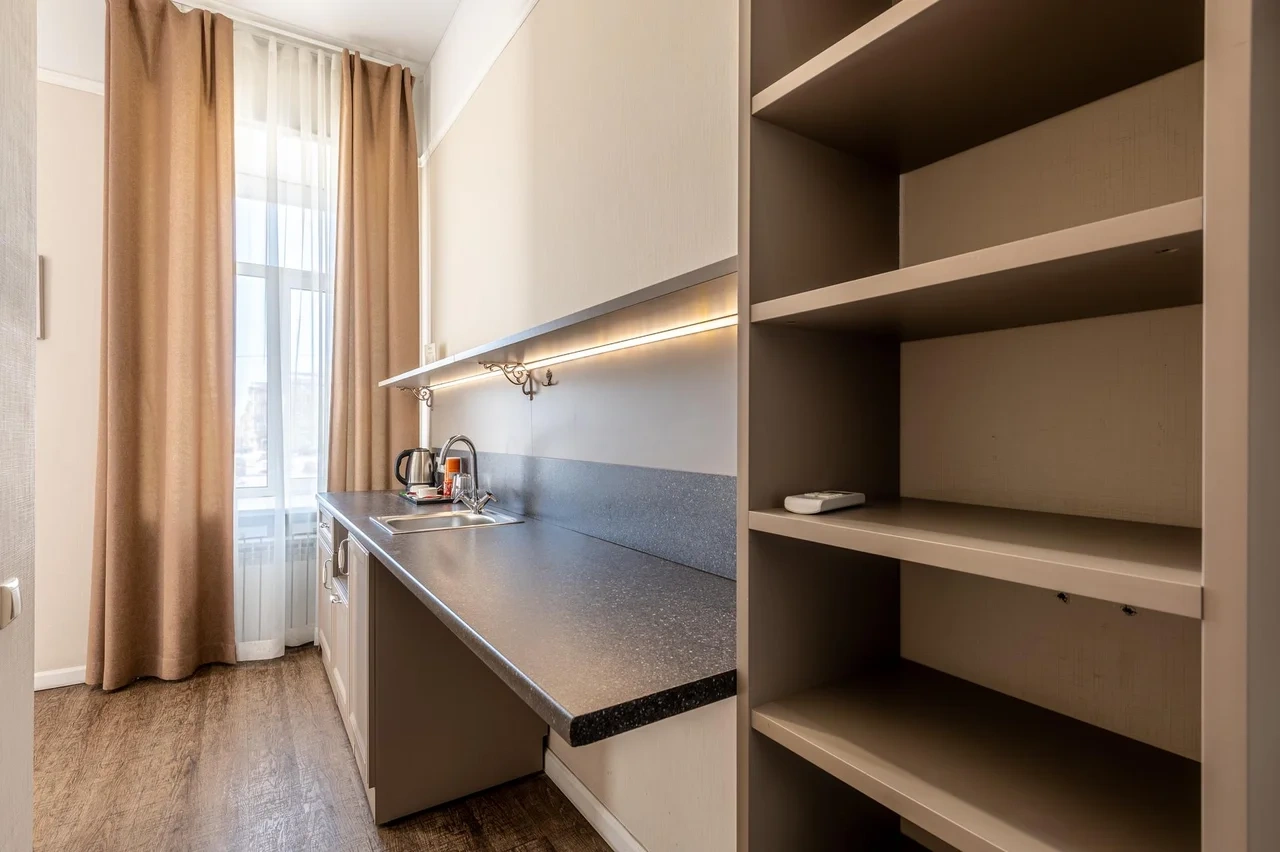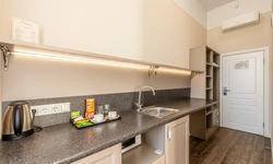 В общей зоне имеется небольшая кухня, где гостей ожидает чай, кофе в открытом доступе.