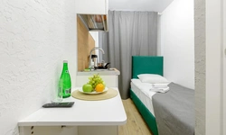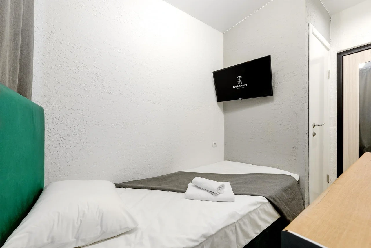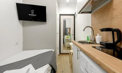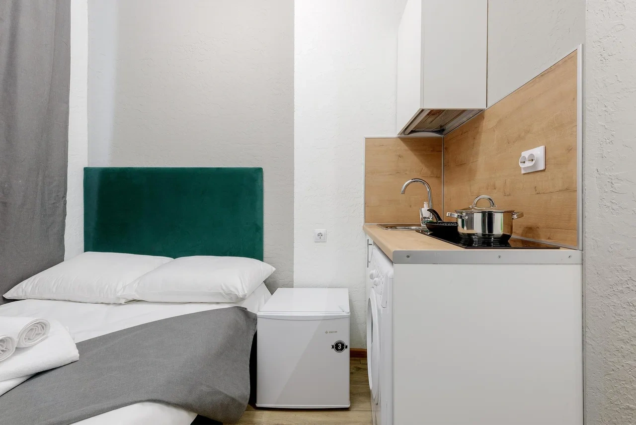 Апартаменты оснащены всем необходимым для комфортного и уютного проживания. В Вашем распоряжении: односпальная кровать 90х200 (постельное белье и полотенце входят в стоимость проживания), телевизор, беспроводной WIFI, стиральная машина, фен для волос, персональная мини кухня укомплектована всей кухонной утварью (варочная панель, электрочайник, посуда и средство для мытья посуды), собственный душ и санузел.