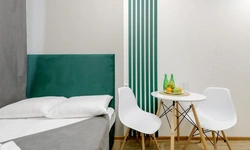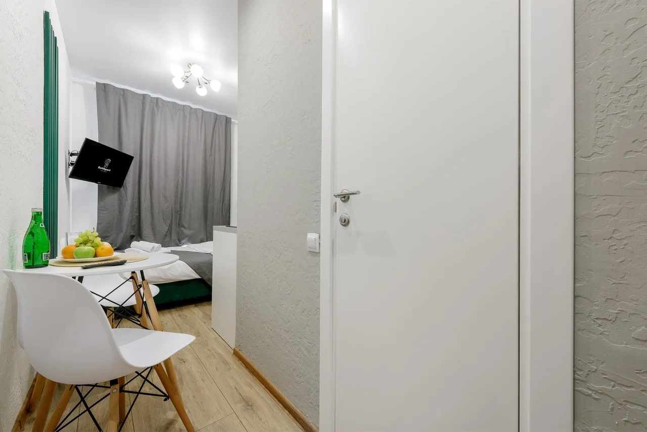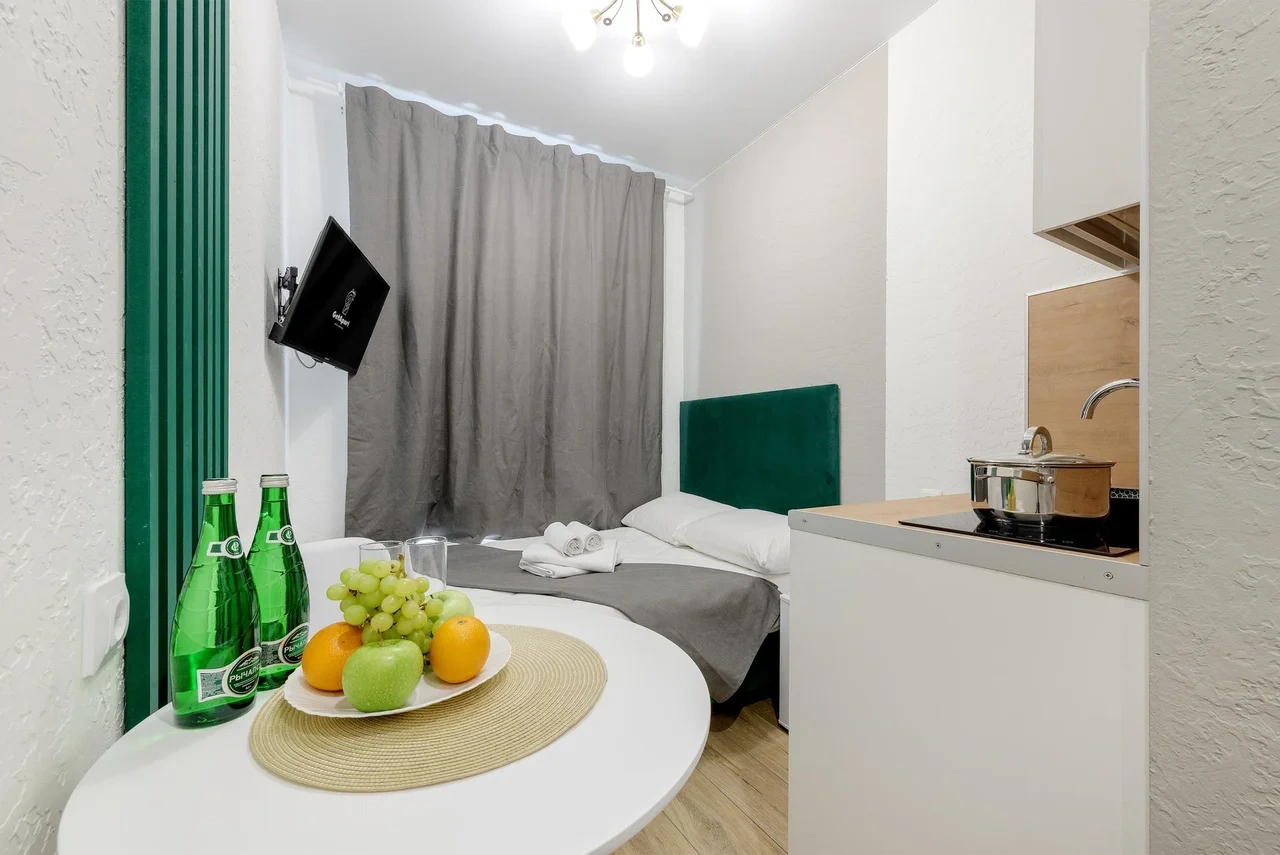 Апартаменты оснащены всем необходимым для комфортного и уютного проживания. В Вашем распоряжении: двуспальная кровать 120Х200 (постельное белье и полотенце входят в стоимость проживания), телевизор, беспроводной WIFI, стиральная машина, фен для волос, персональная мини кухня укомплектована всей кухонной утварью (варочная панель, электрочайник, посуда и средство для мытья посуды), собственный душ и санузел.