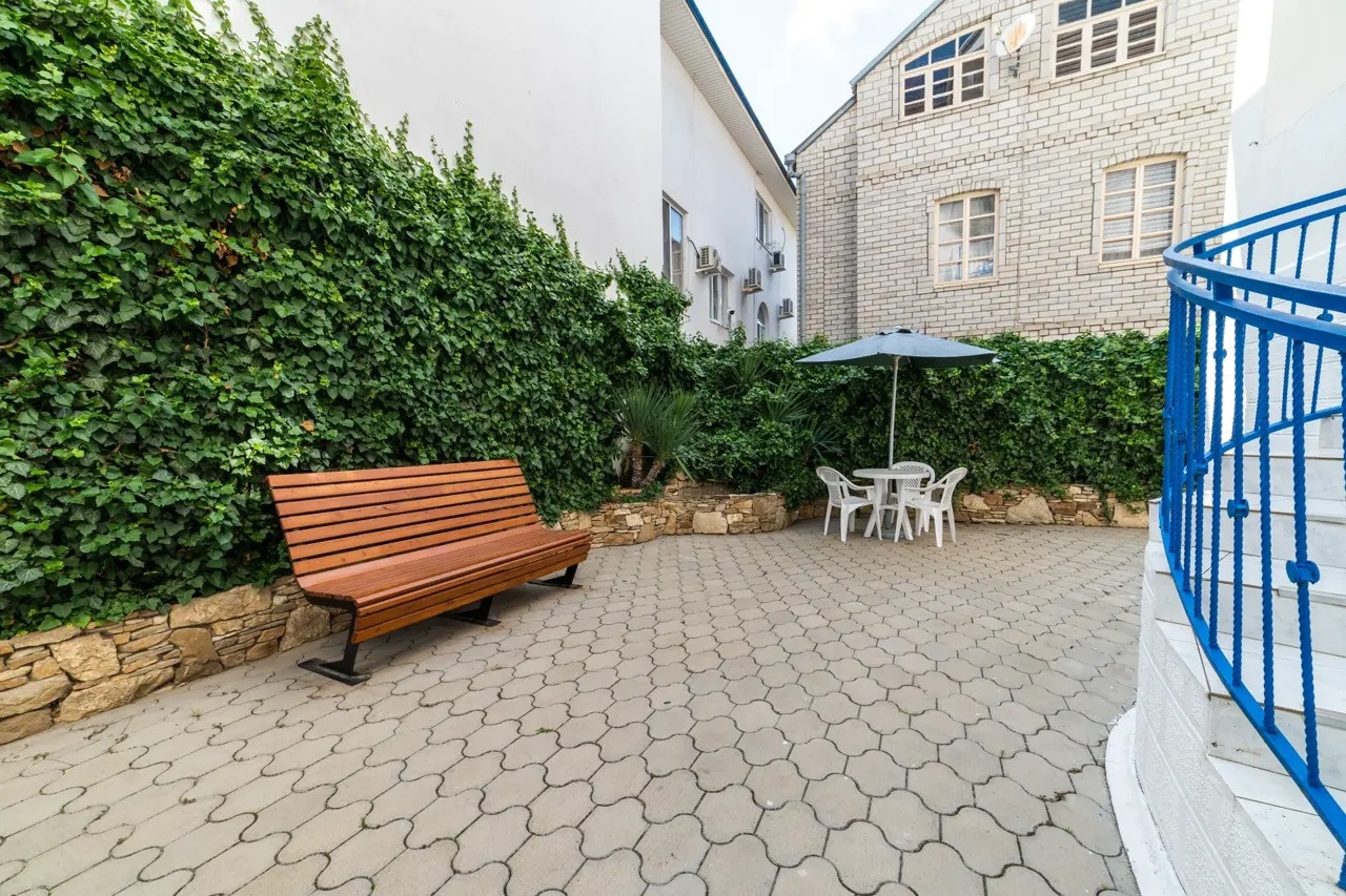 Территория огорожена, на входе - кодовый замок. Аллея колоновидных туй, вазоны с цветами, античная лужайка, столики со стульями под зонтами располагают к уютной домашней атмосфере. Для гостей, путешествующих на автомобиле, на территории имеется открытая бесплатная парковка.