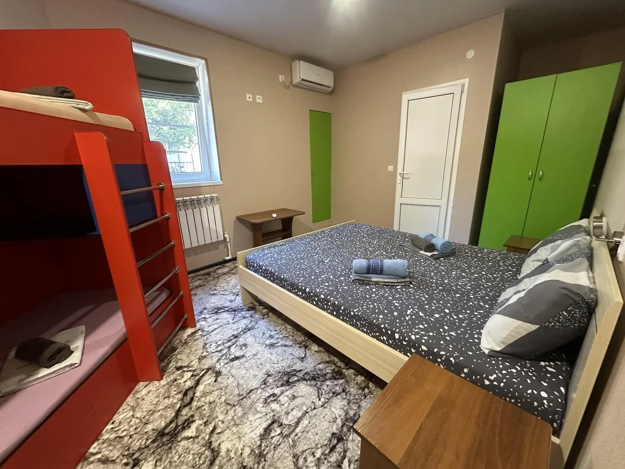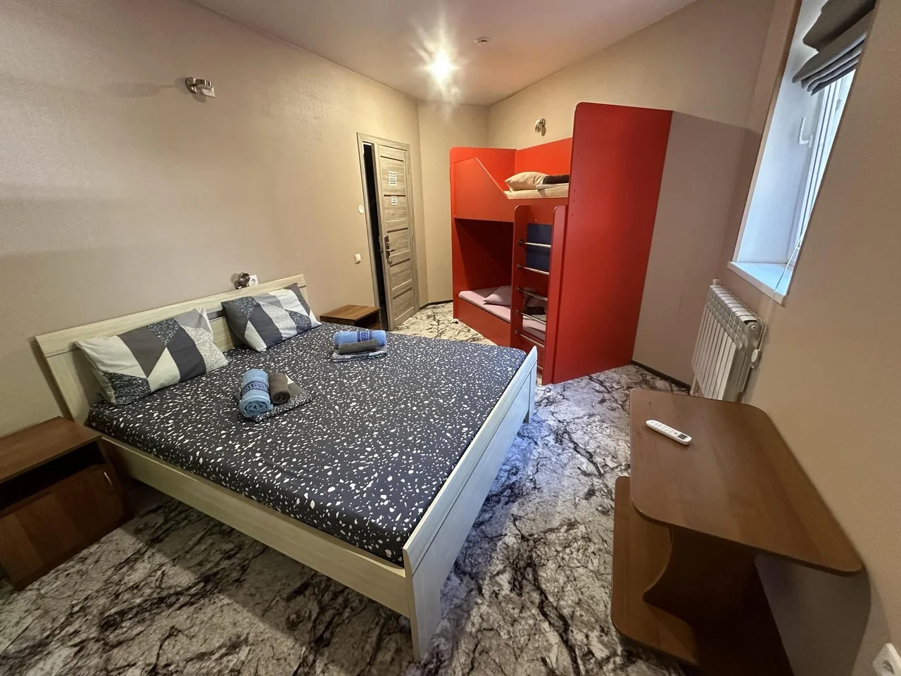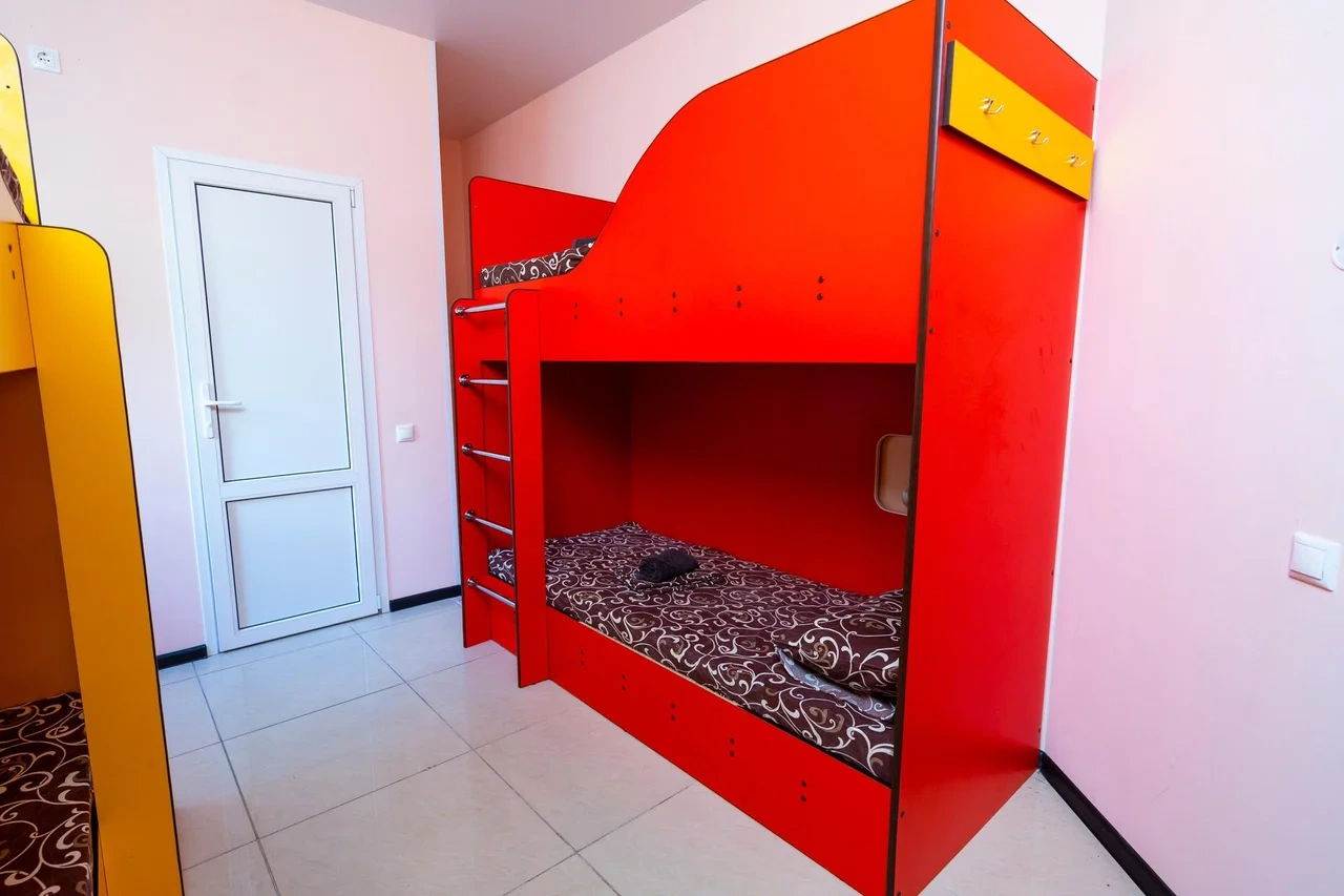 В семейном номере есть: 1 двуспальная кровать и 1 двухъярусная кровать. Шкаф, кондиционер, журнальный столик. У каждого койко-места есть своя лампа и розетка. В номере есть душ и туалет. Есть комната приема пищи и отдыха: кулер, холодильник, микроволновая печь, телевизор и диванчик