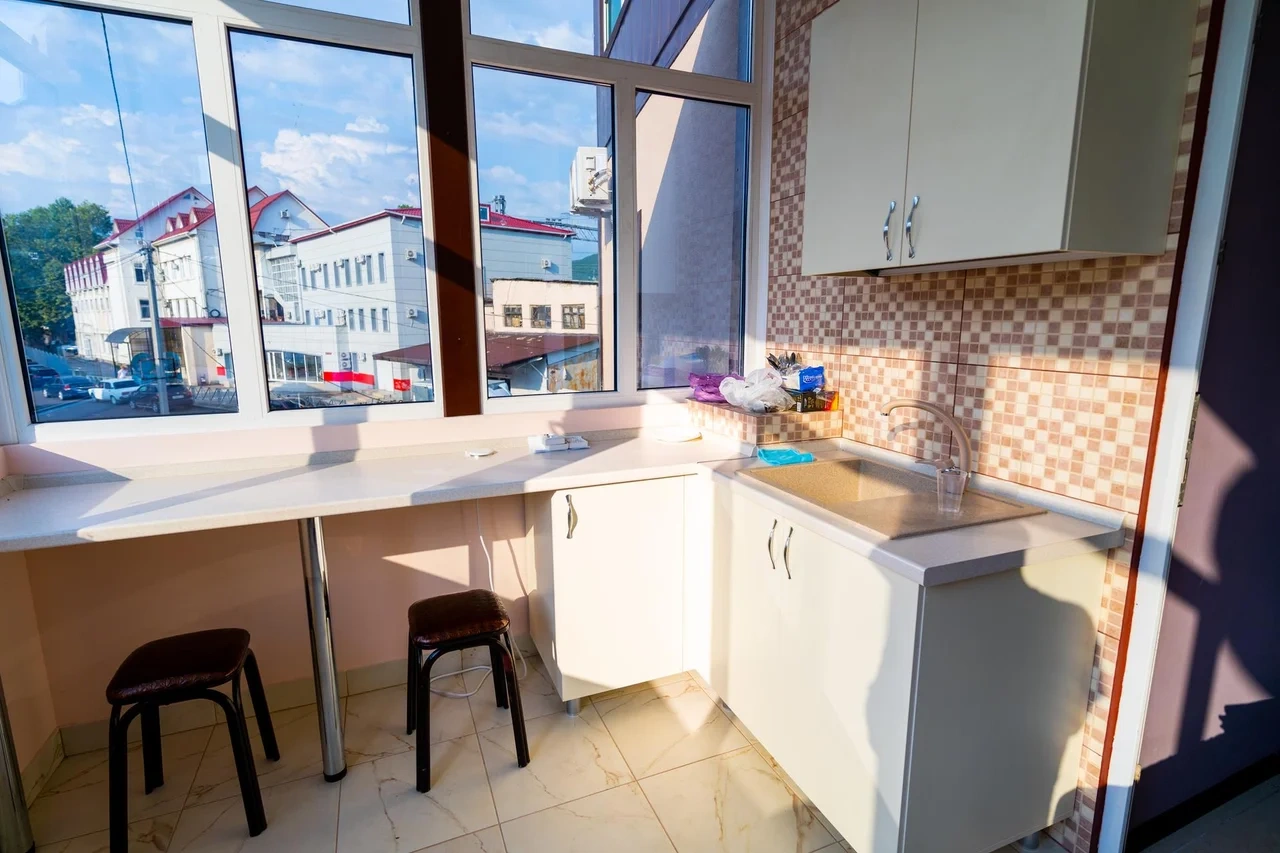 В семейном номере есть: шкаф, кондиционер, журнальный столик. У каждого койко-места есть своя лампа и розетка. В номере есть душ и туалет. Есть комната приема пищи и отдыха: кулер, холодильник, микроволновая печь, телевизор и диванчик