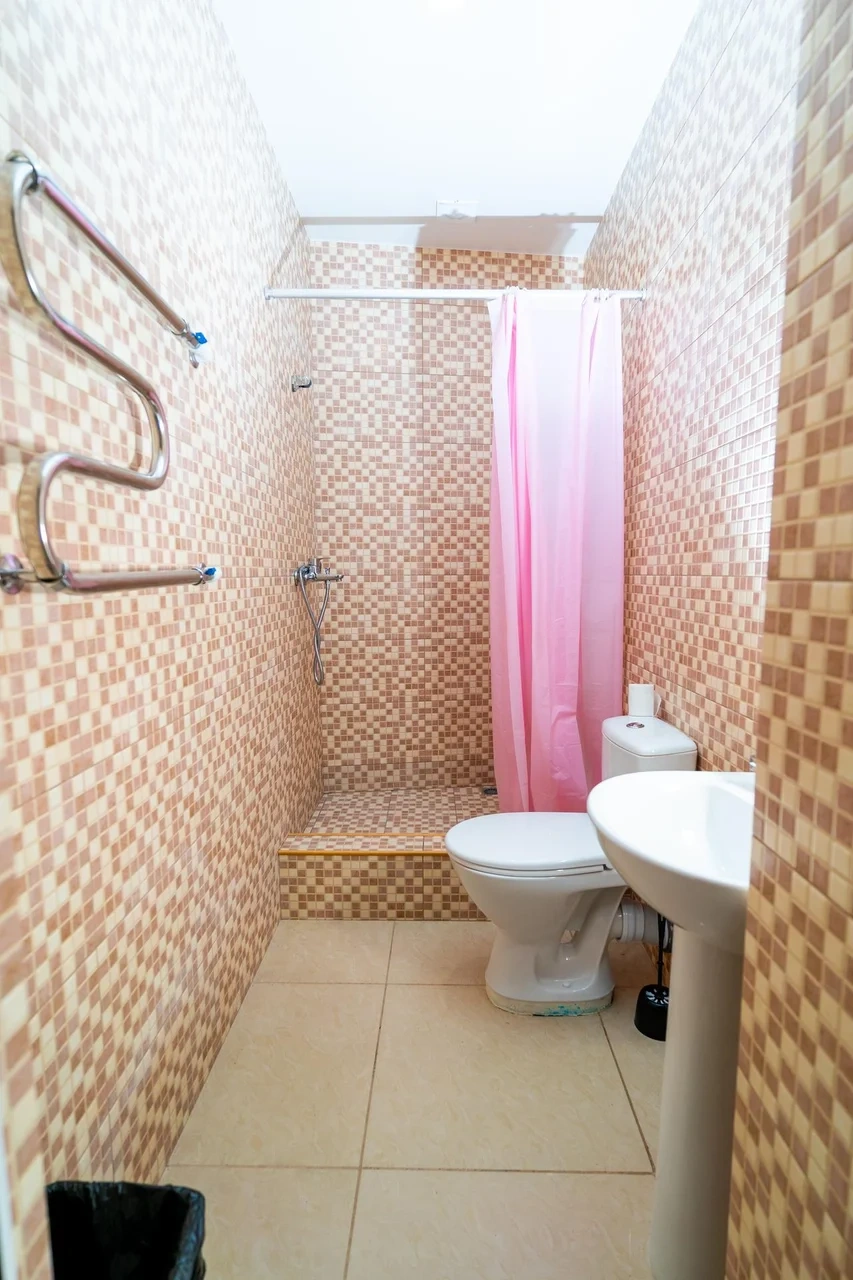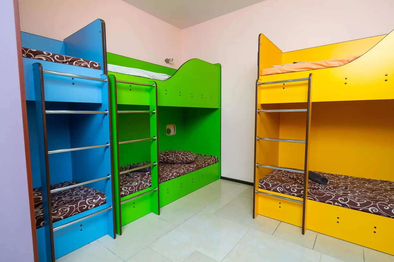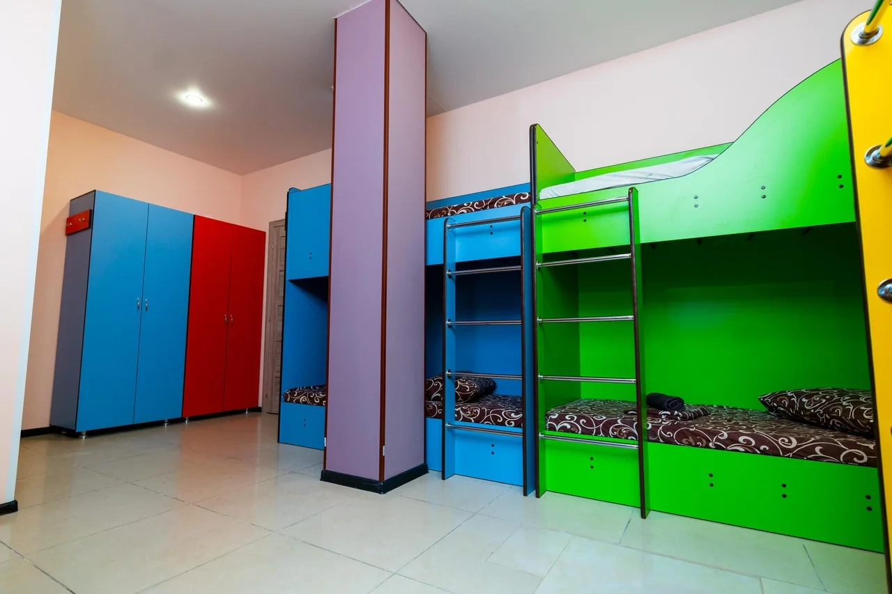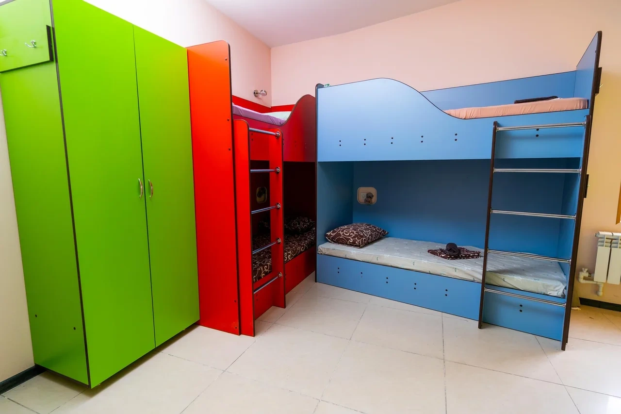 4 двухъярусные кровати. В женском номере есть: шкаф, кондиционер ,журнальный столик. у каждого койко-места есть своя лампа и розетка. В номере есть душ и туалет Есть комната приема пищи и отдыха: кулер, холодильник, микроволновая печь, телевизор и диванчик