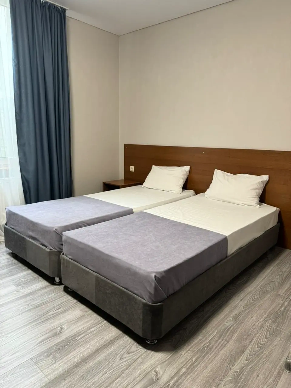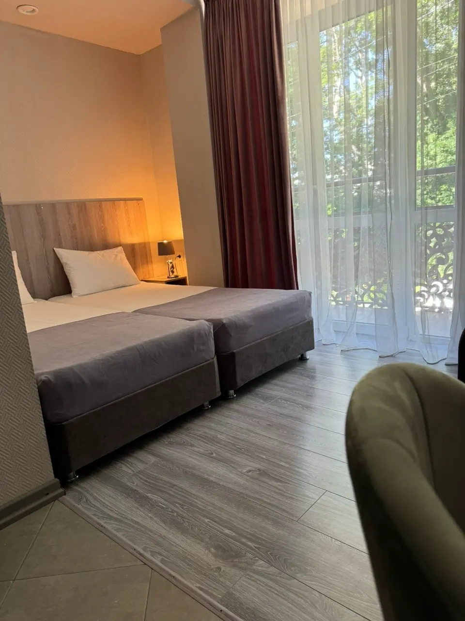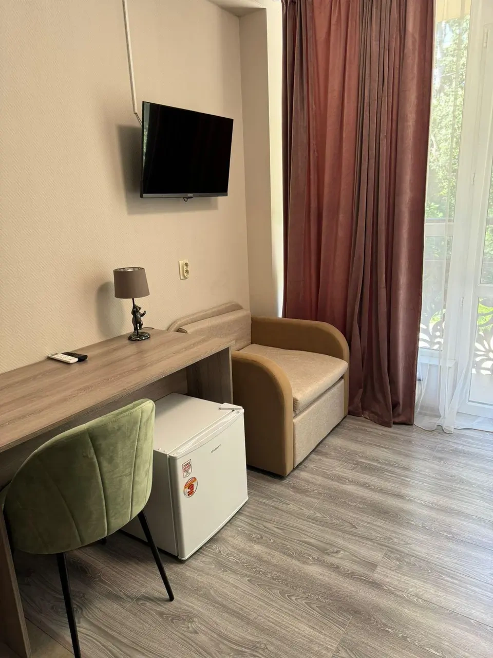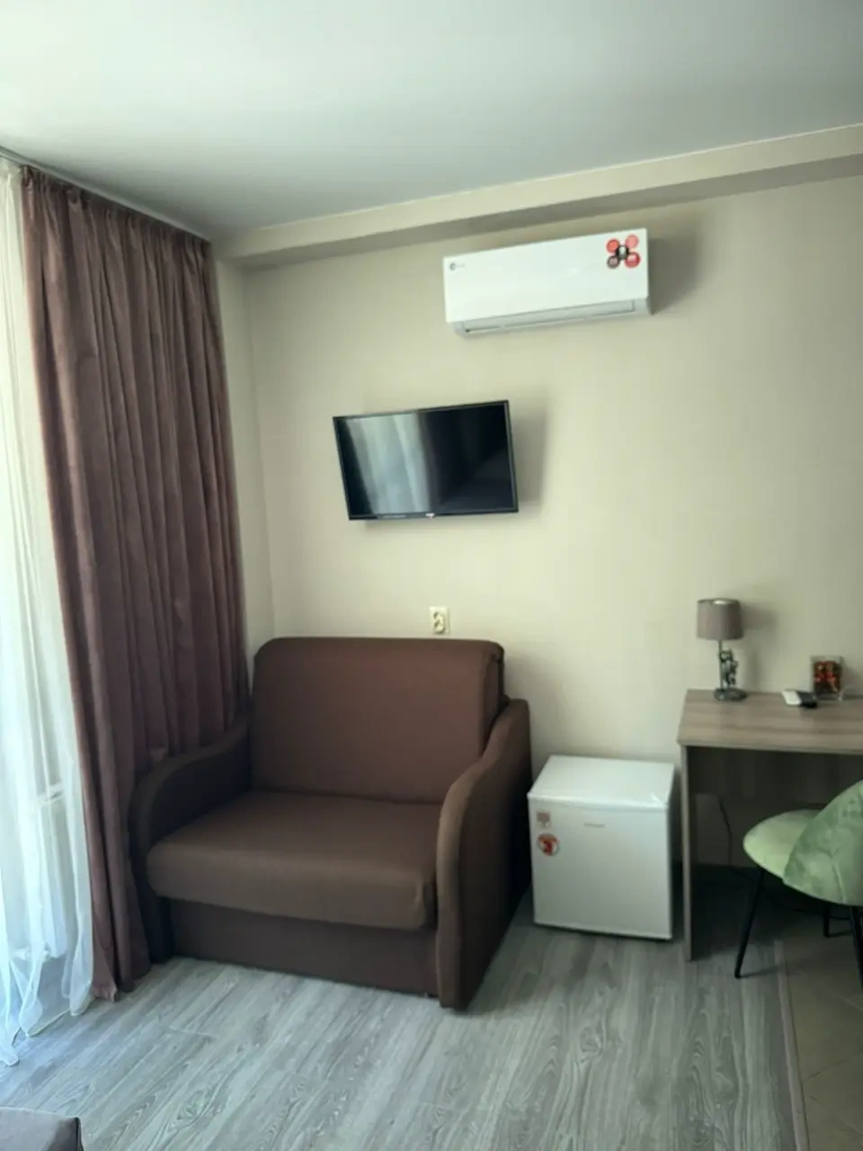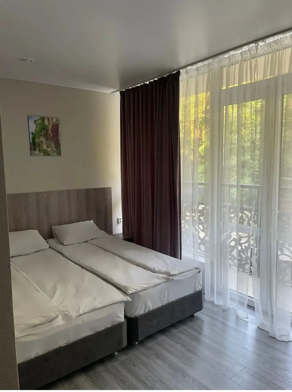 В номере расположены две широкие кровати (совмещены), двухспальный диван-кровать, холодильник, ТВ, сплит-система, санузел (душ, умывальник, унитаз),теневая сторона. S 28 кв.м. № 2 1 эт.