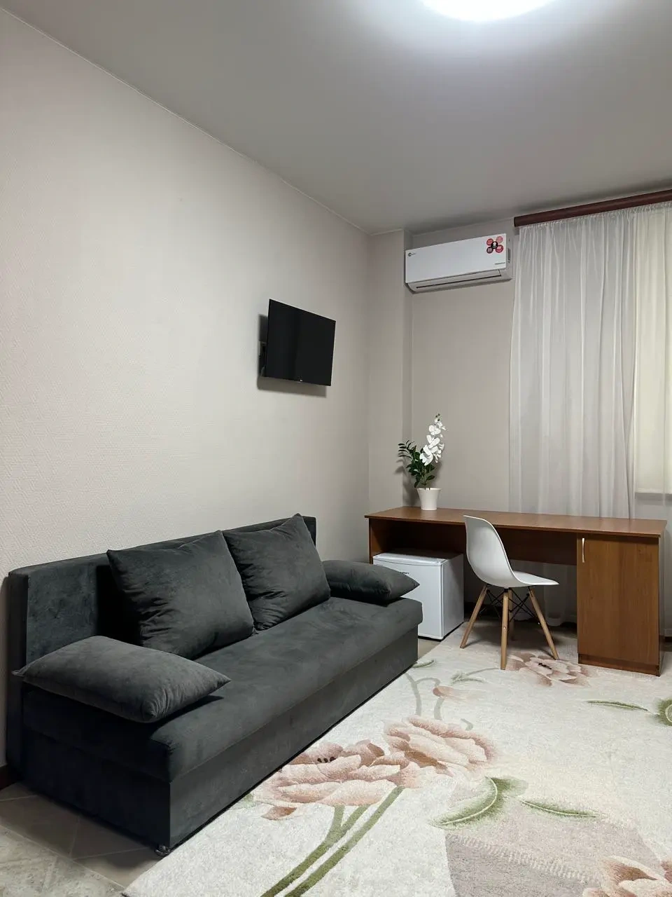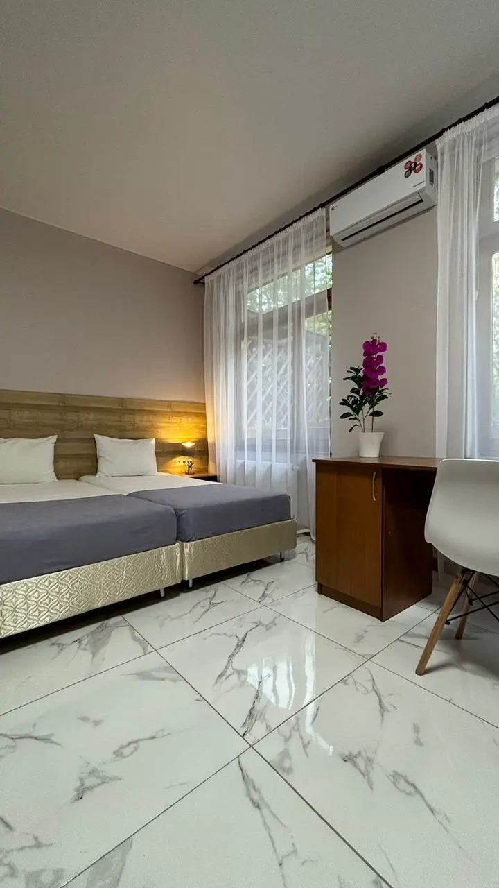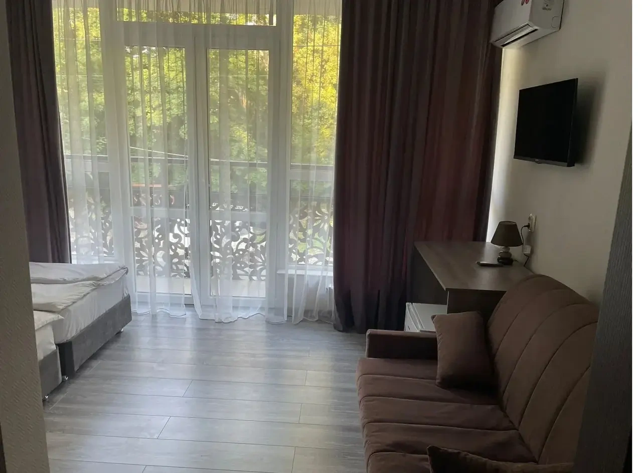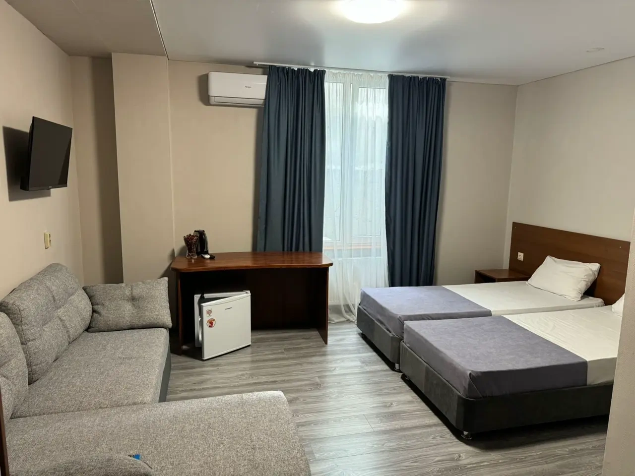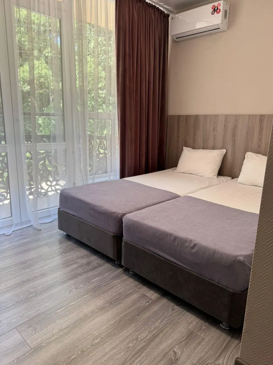 В номере расположены две широкие кровати (совмещены), двухспальный диван-кровать, холодильник, ТВ, сплит-система, санузел (душ, умывальник, унитаз),теневая сторона. S 28 кв.м. № 1 1й эт.
