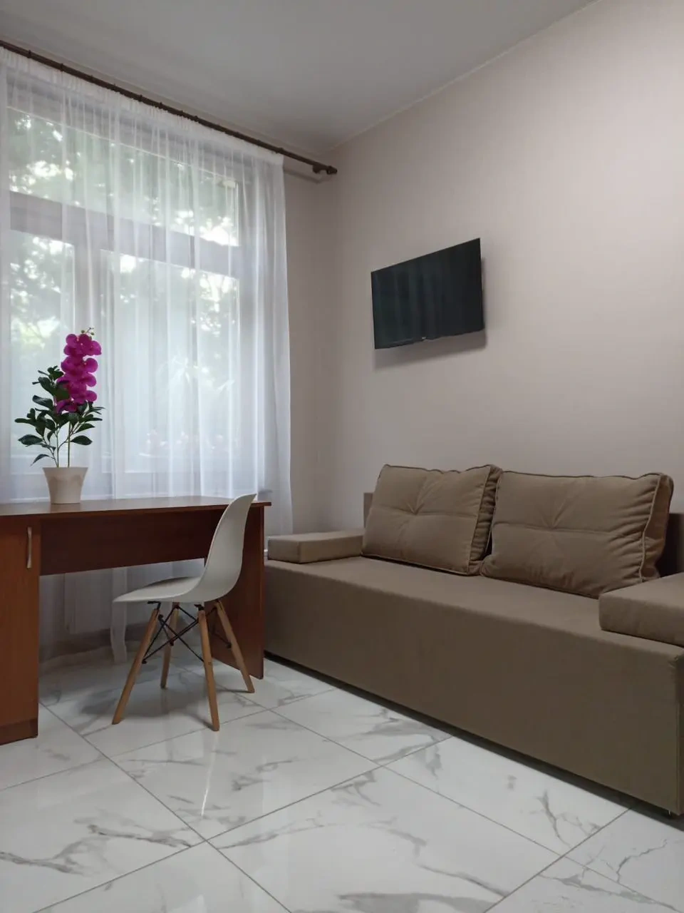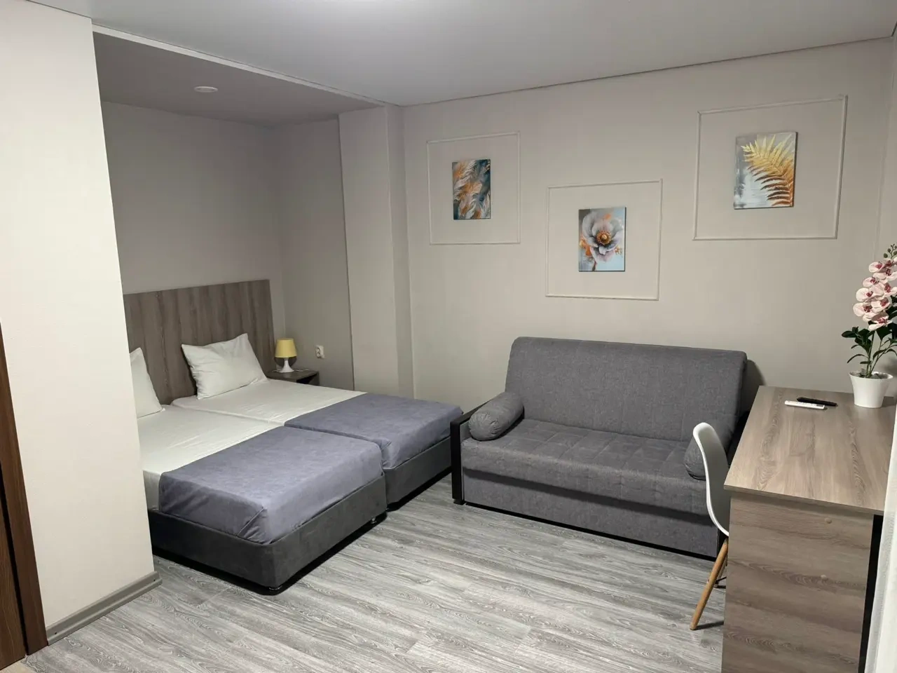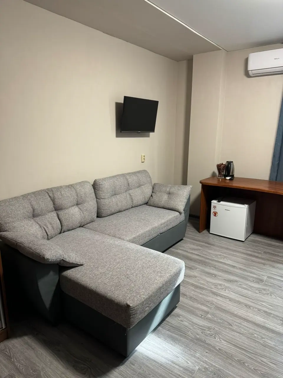 В номере расположены две широкие кровати (совмещены), диван-кровать, холодильник, ТВ, сплит-система, санузел (душ, умывальник, унитаз). S 20 кв.м. № 4 1й эт.