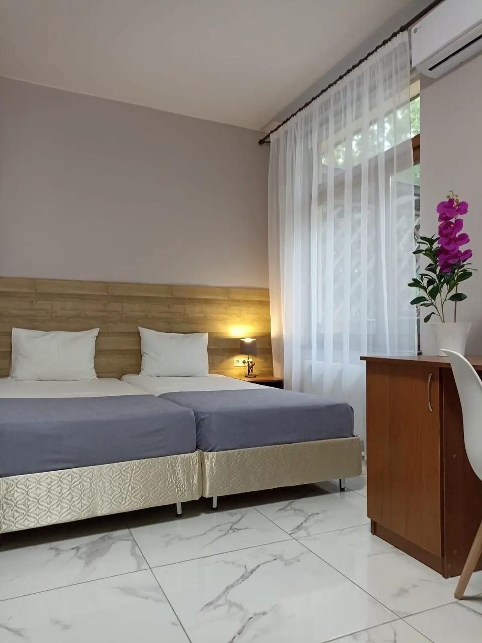 В номерах есть всё необходимое для комфортного проживания от 1 до 4 человек: односпальные, двуспальные кровати, а так же трёхместный и четырёхместный номер, диван-кровать. В каждом номере свой санузел (душ и туалет),wi-fi, сплит-система, холодильник. Чайник, утюг, микроволновка, теннисный стол, беседка, мангал.