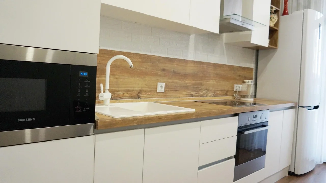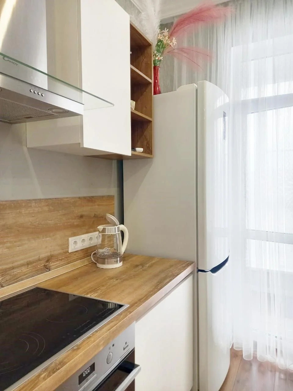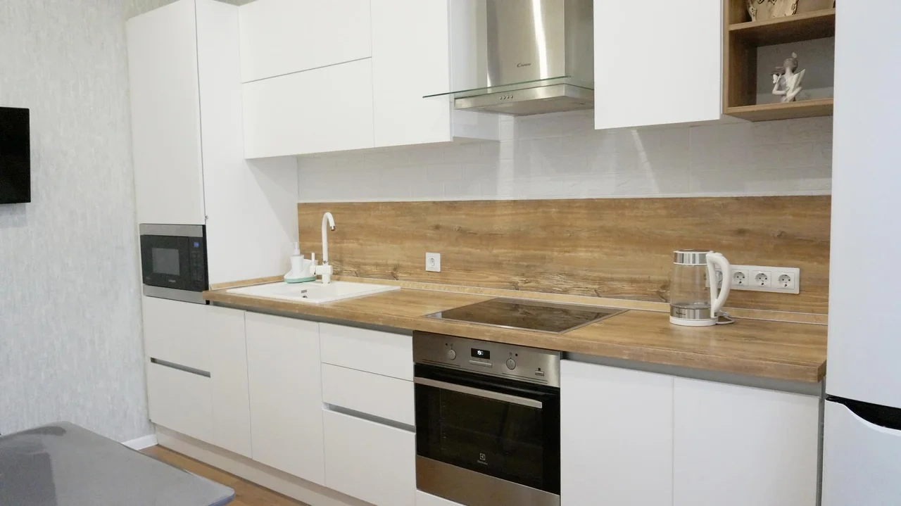 Кухня со всем необходимым для приготовления пищи (варочная поверхность, духовой шкаф, микроволновая печь, чайник, холодильник, посуда и прочее). Кондиционер. Стиральная машина. Обеденная зона.