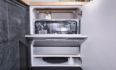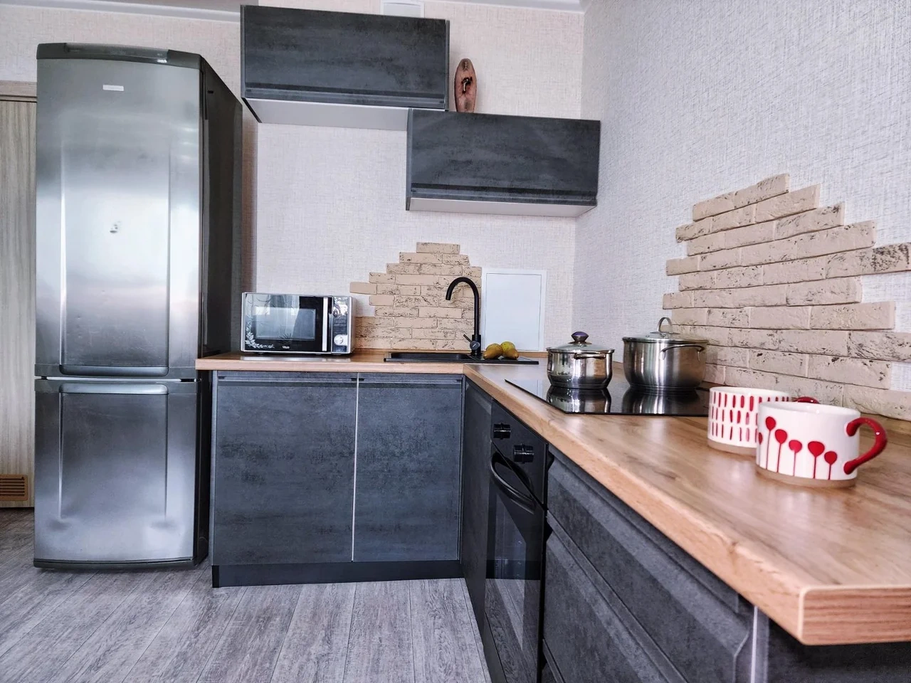 -полностью оборудованная посудой и техникой кухня: плита, духовой шкаф, СВЧ, чайник, посудомоечная машина