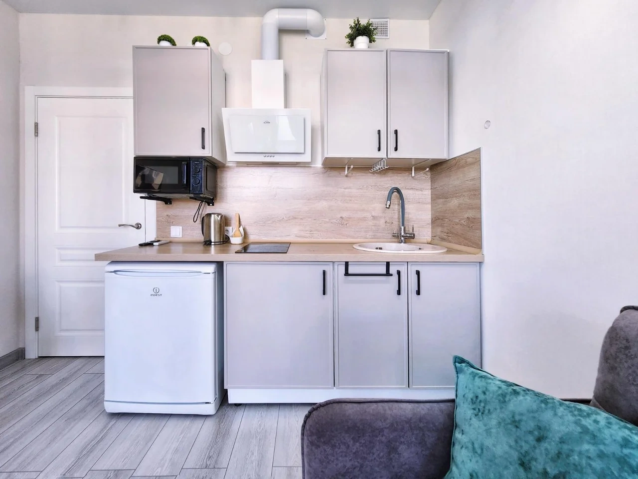 -Оборудованная посудой и техникой кухня, где есть варочная панель, духовой шкаф, холодильник, свч и чайник
