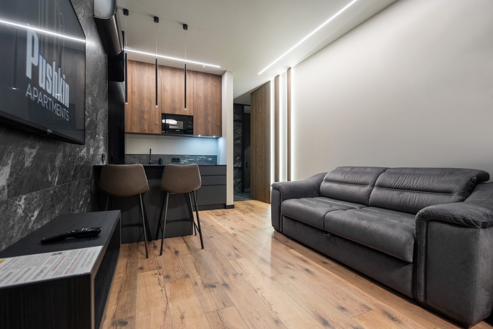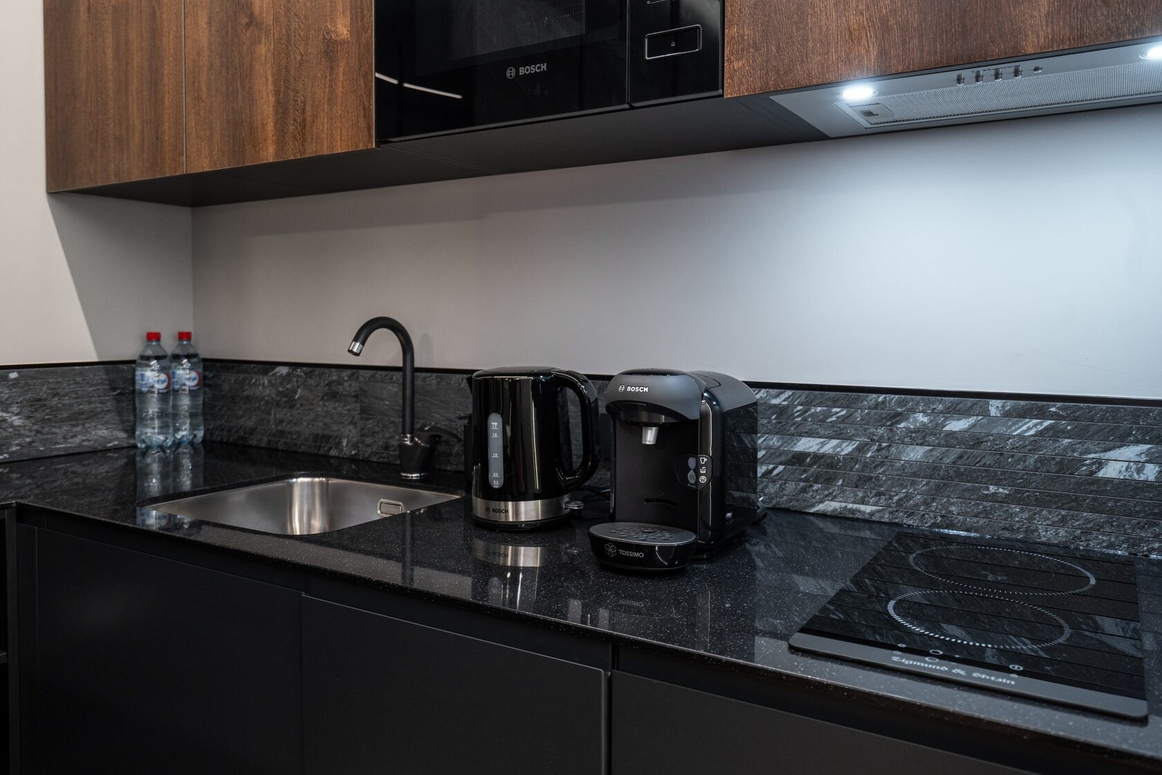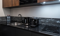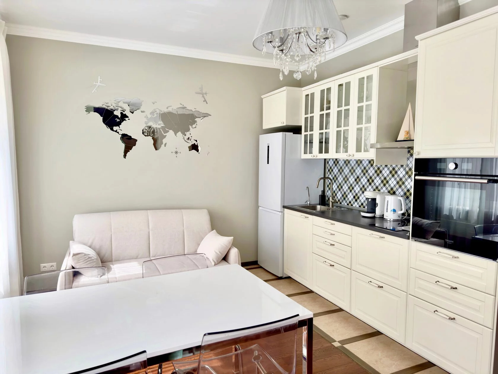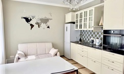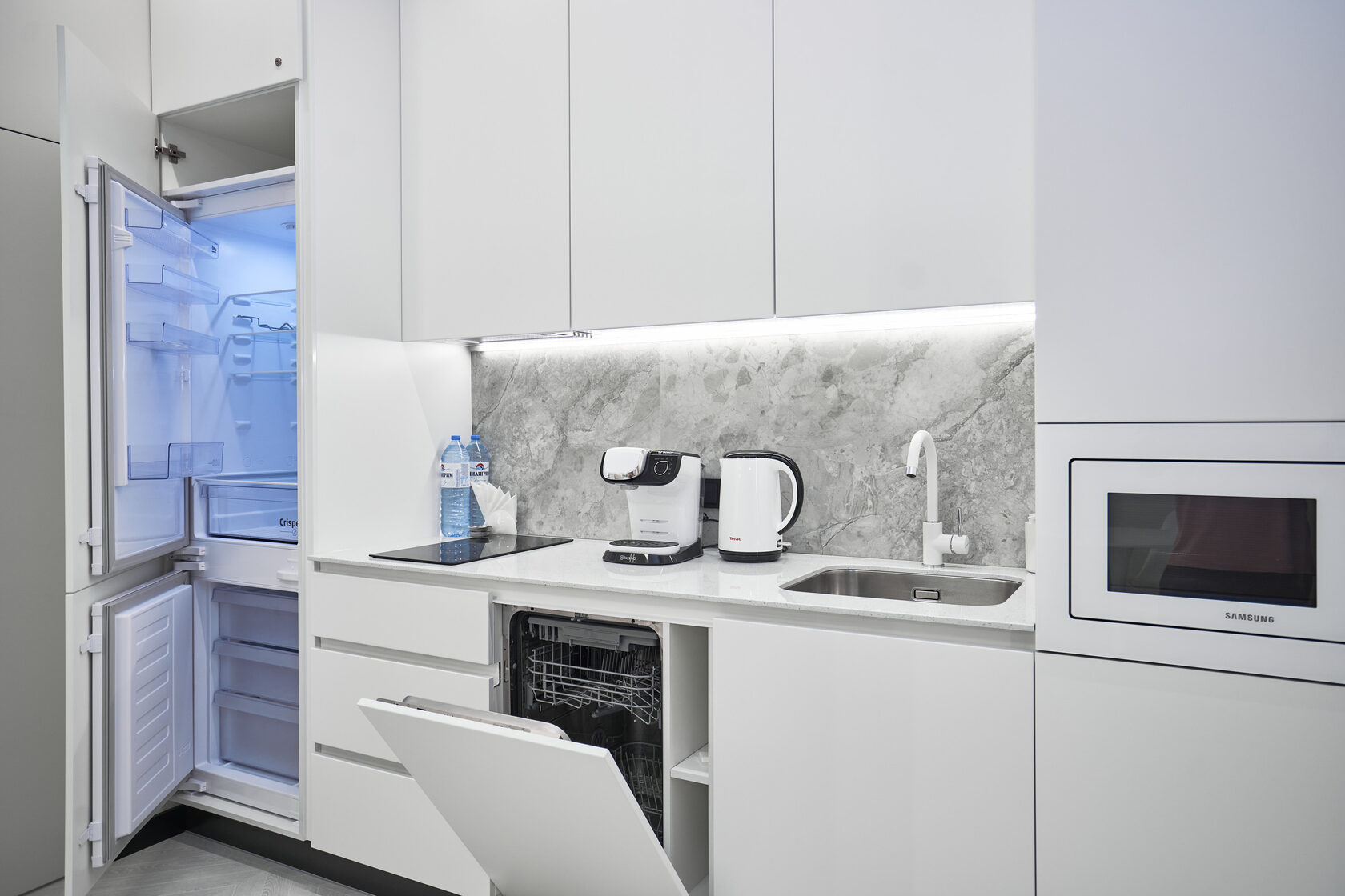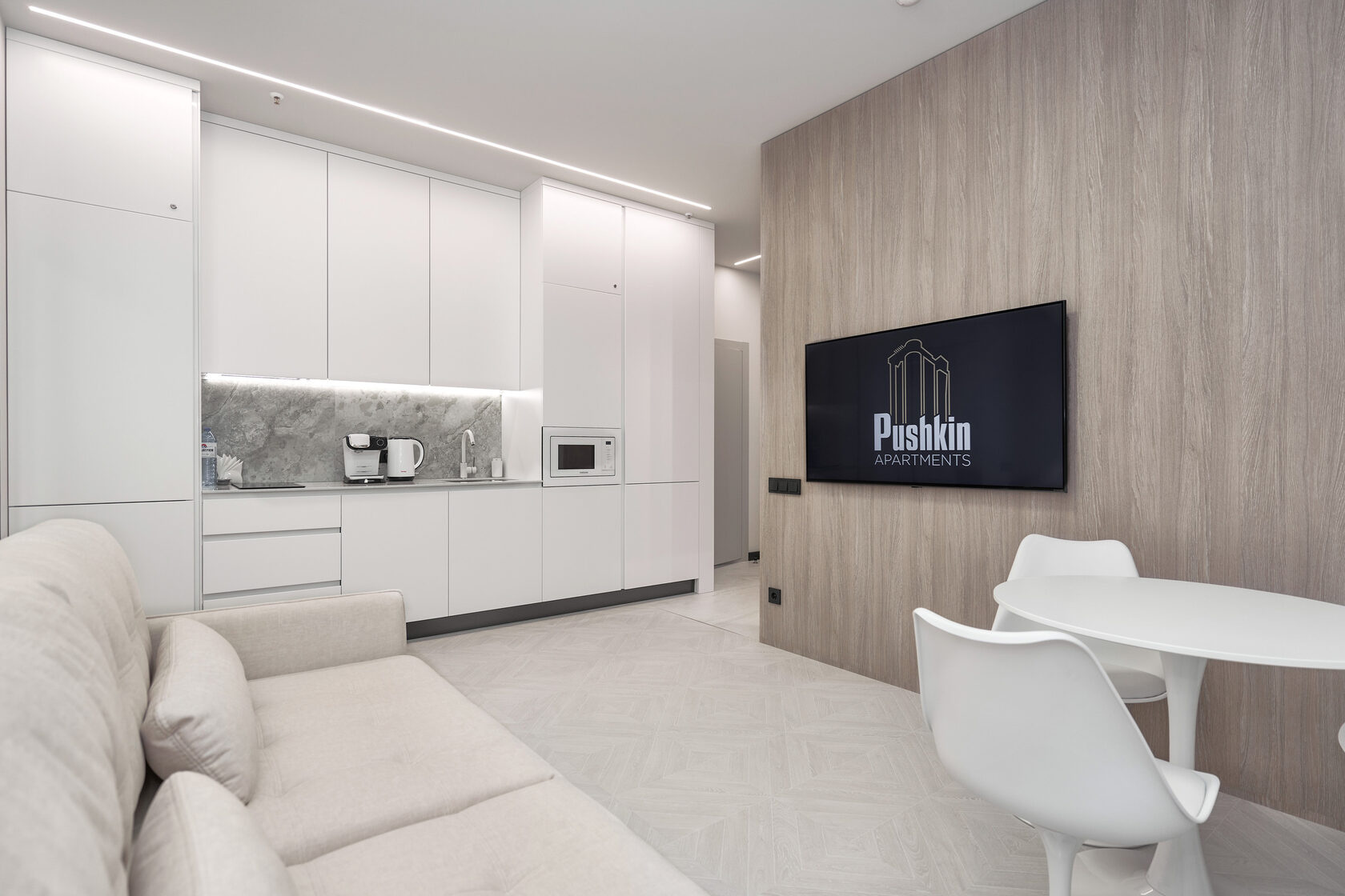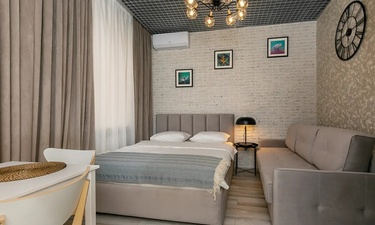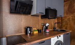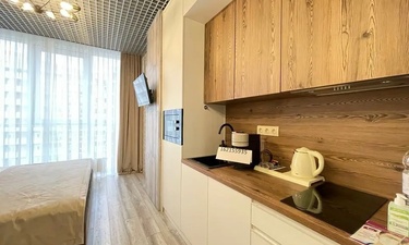 Апартаменты оформлены в современном стиле, в приятной цветовой гамме. Оборудованы мини-кухней со встроенным холодильником, микроволновой печью, варочной поверхностью, вытяжкой, есть кофе-машина и электрочайник. Имеются все необходимые кухонные принадлежности. Для удобства гостей в апартаментах есть гладильная доска, утюг, фен, халаты, одноразовые тапочки, туалетно-косметические принадлежности. Кроме того, для вашего удобства, есть телевизор с большим экраном и доступом к большому количеству каналов, Wi-Fi.