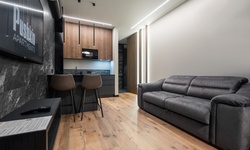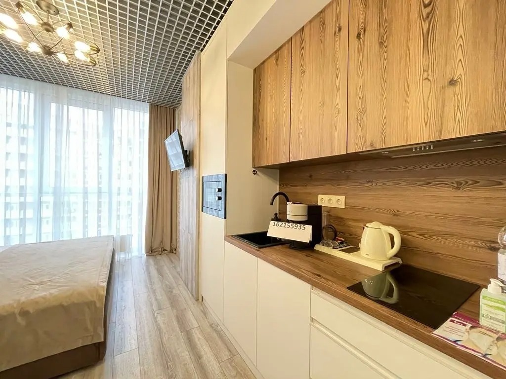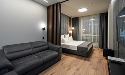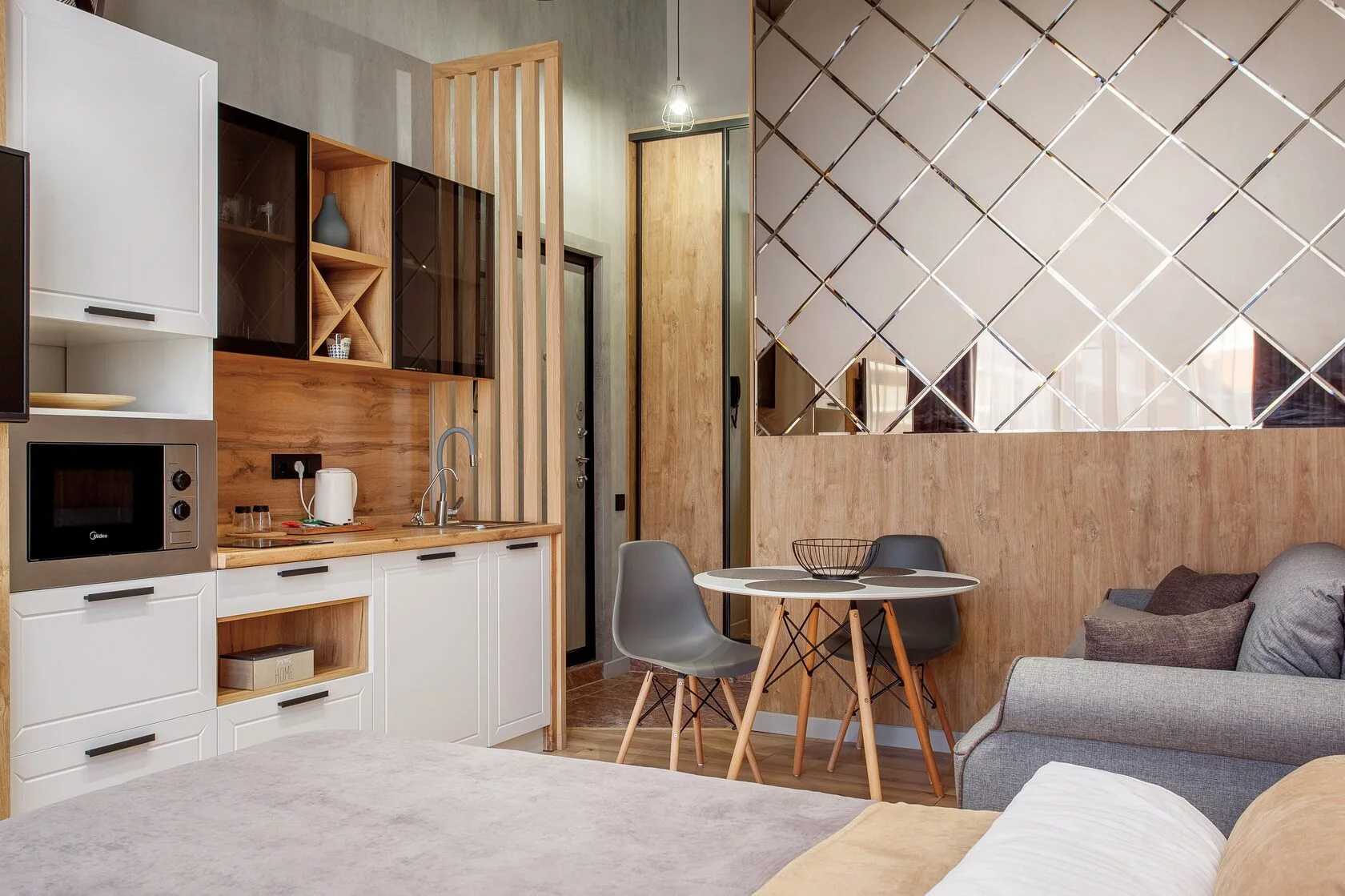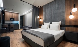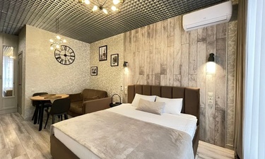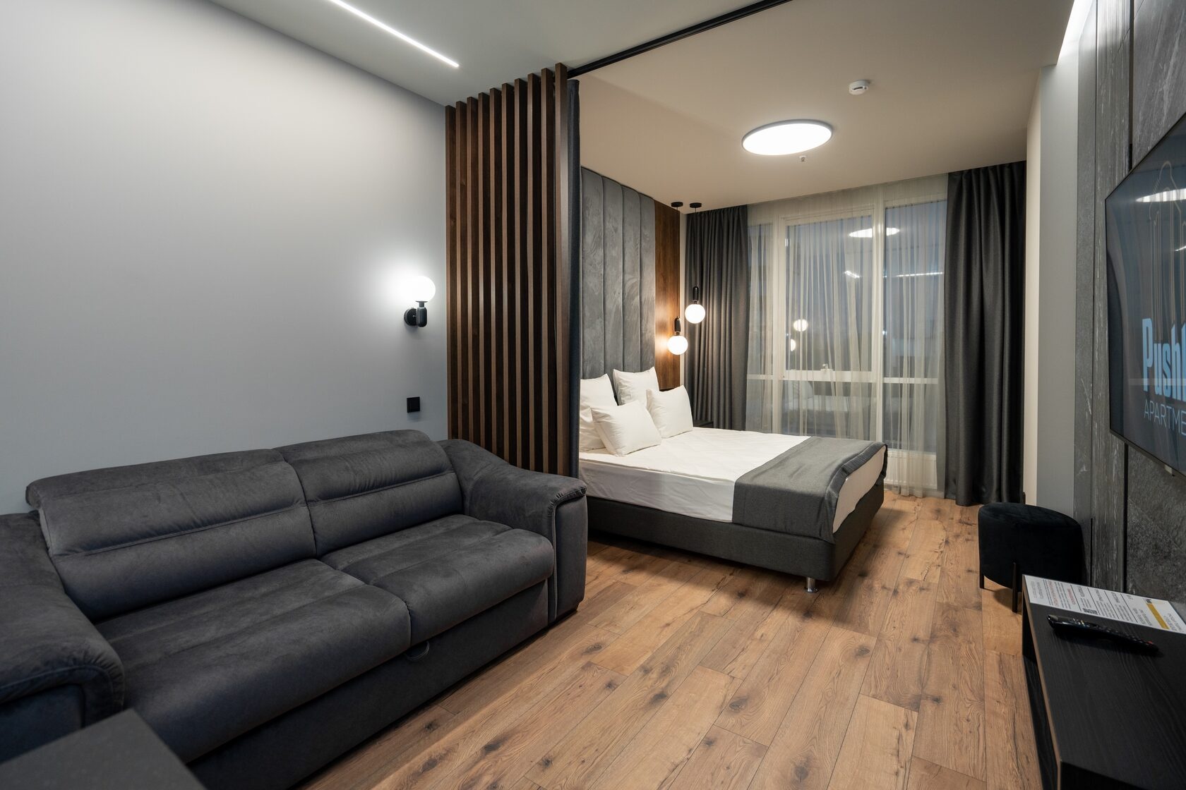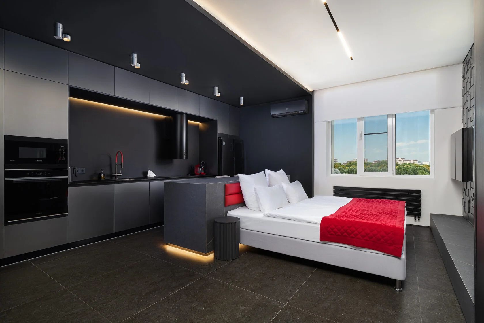 Апартаменты оформлены в современном стиле, в приятной цветовой гамме. Оборудованы мини-кухней со встроенным холодильником, микроволновой печью, варочной поверхностью, вытяжкой, есть кофе-машина и электрочайник. Имеются все необходимые кухонные принадлежности. Для удобства гостей в апартаментах есть гладильная доска, утюг, фен, халаты, одноразовые тапочки, туалетно-косметические принадлежности. Кроме того, для вашего удобства, есть телевизор с большим экраном и доступом к большому количеству каналов, Wi-Fi.