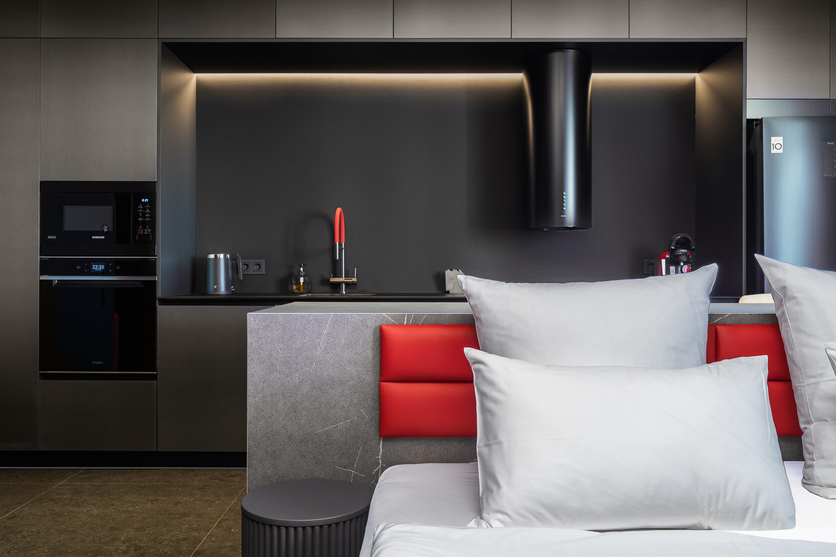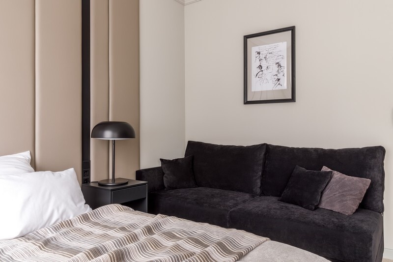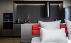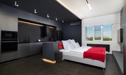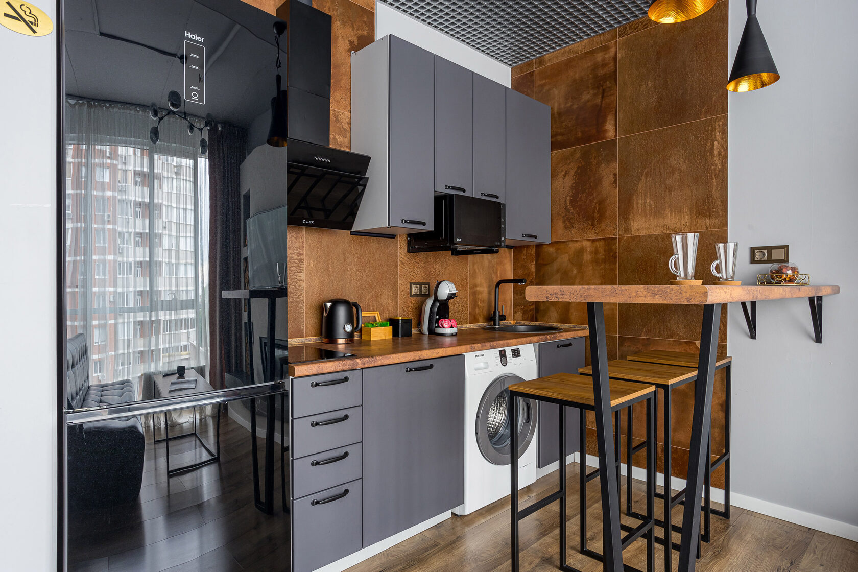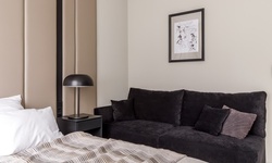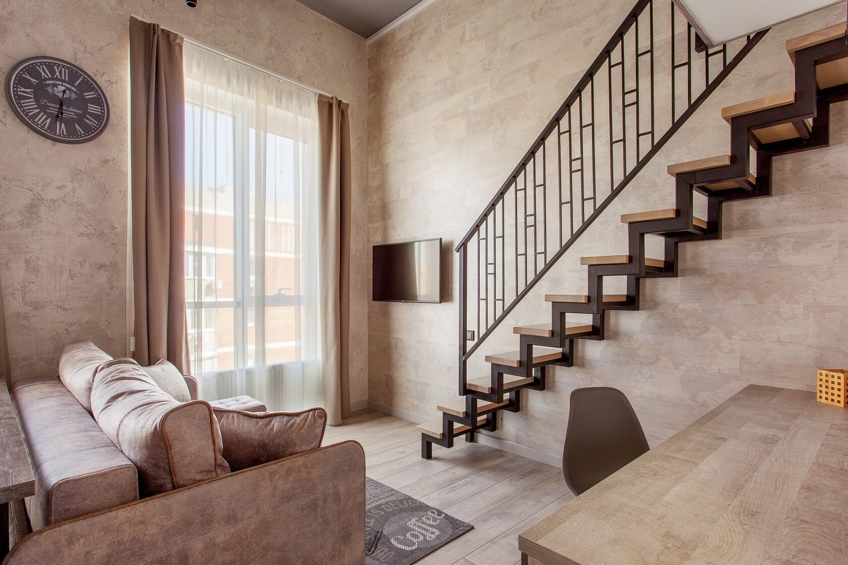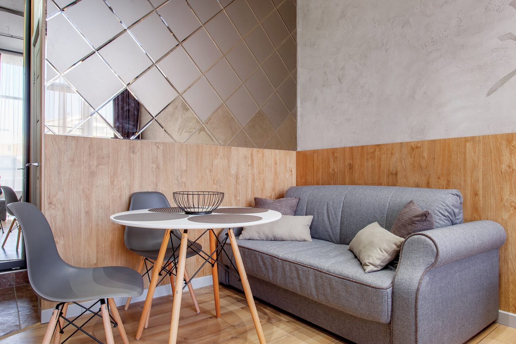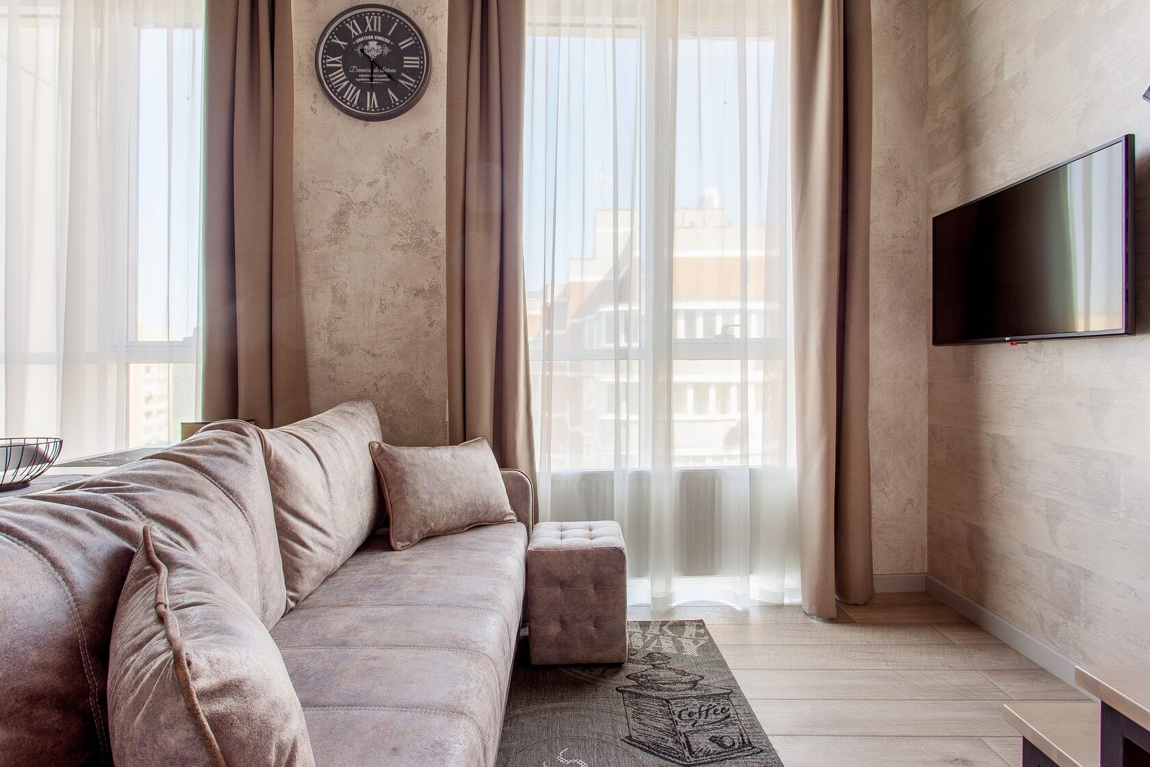 Апартаменты оформлены в современном стиле, в приятной цветовой гамме. Оборудованы мини-кухней со встроенным холодильником, микроволновой печью, варочной поверхностью, вытяжкой, есть кофе-машина и электрочайник. Имеются все необходимые кухонные принадлежности. Для удобства гостей в апартаментах есть гладильная доска, утюг, фен, халаты, одноразовые тапочки, туалетно-косметические принадлежности. Кроме того, для вашего удобства, есть телевизор с большим экраном и доступом к большому количеству каналов, Wi-Fi.