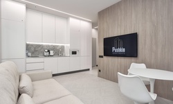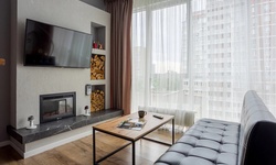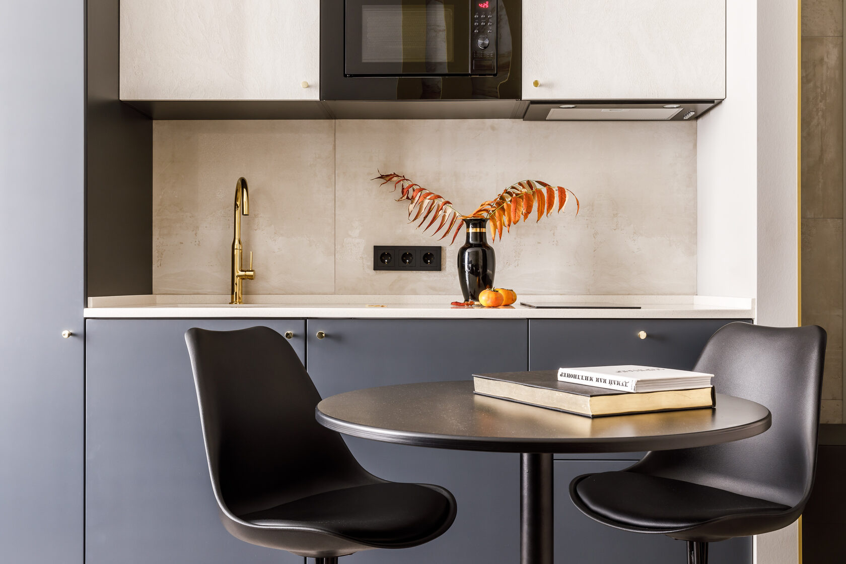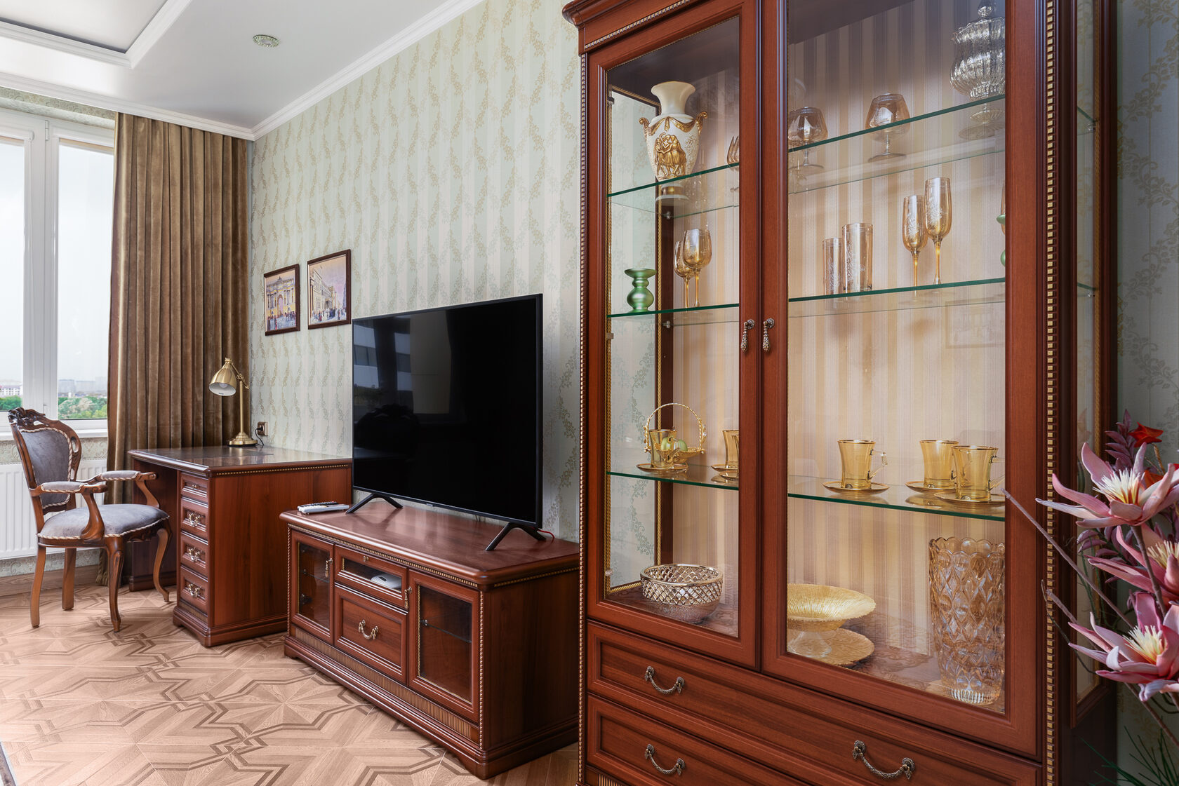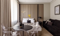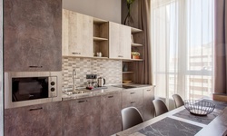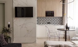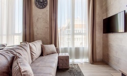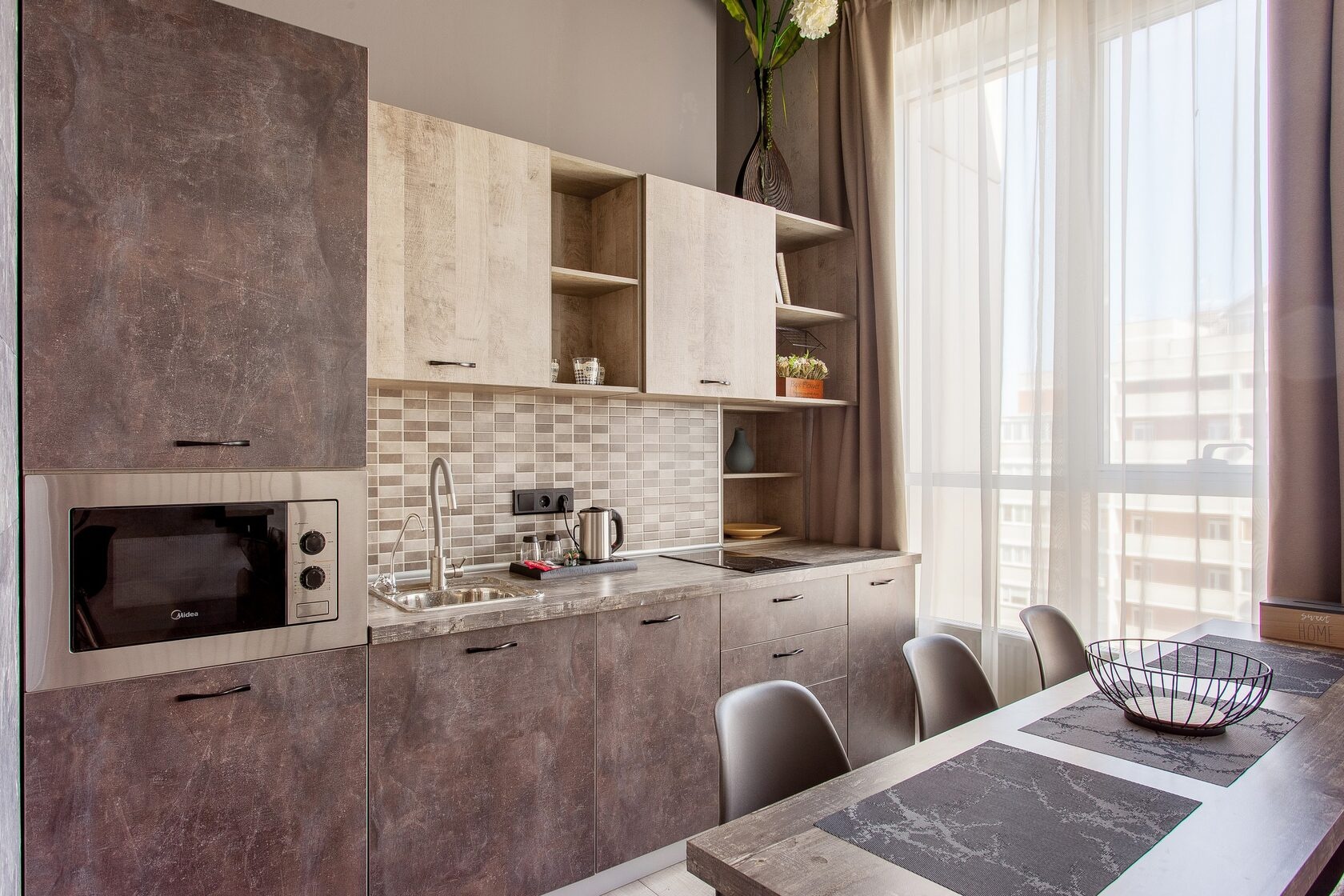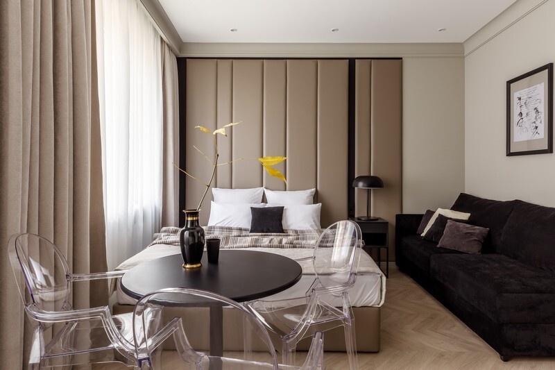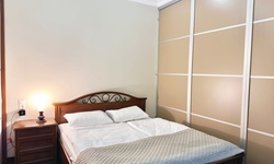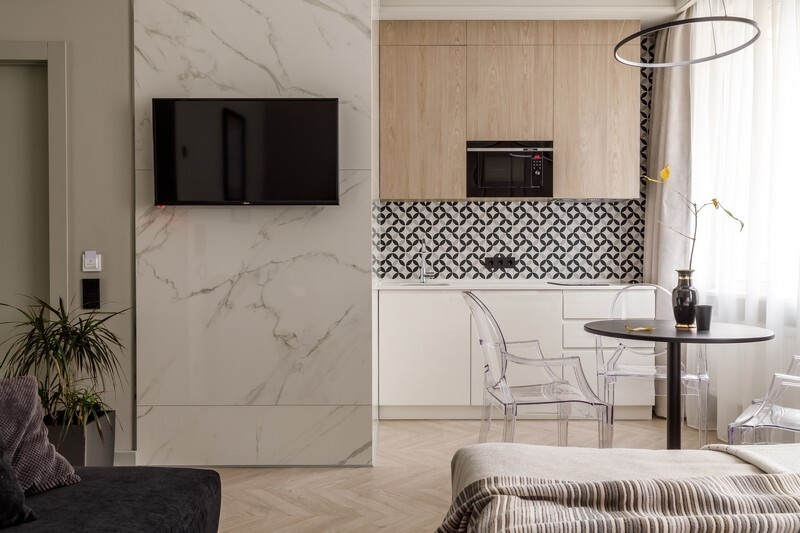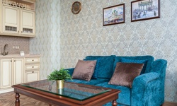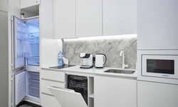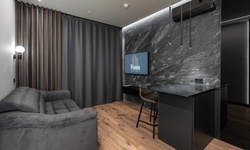 Апартаменты оформлены в современном стиле, в приятной цветовой гамме. Оборудованы мини-кухней со встроенным холодильником, микроволновой печью, варочной поверхностью, вытяжкой, есть кофе-машина и электрочайник. Имеются все необходимые кухонные принадлежности. Для удобства гостей в апартаментах есть гладильная доска, утюг, фен, халаты, одноразовые тапочки, туалетно-косметические принадлежности. Кроме того, для вашего удобства, есть телевизор с большим экраном и доступом к большому количеству каналов, Wi-Fi.