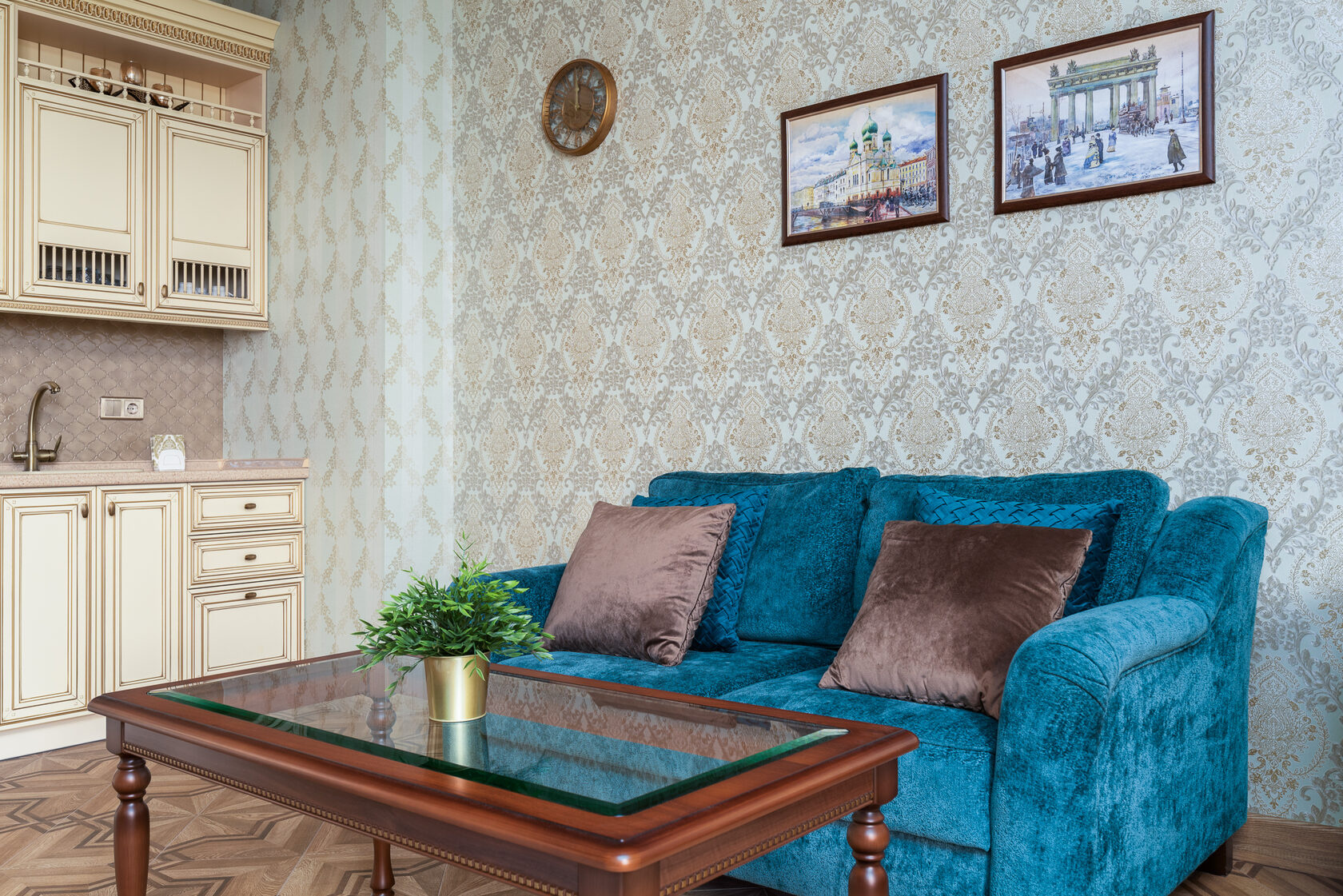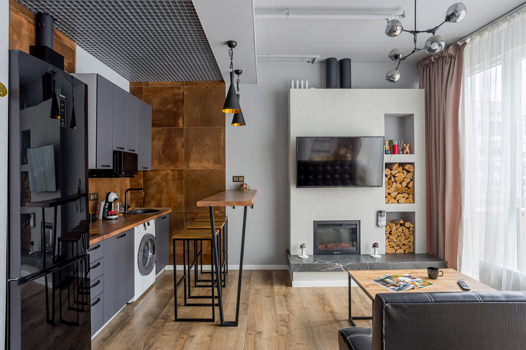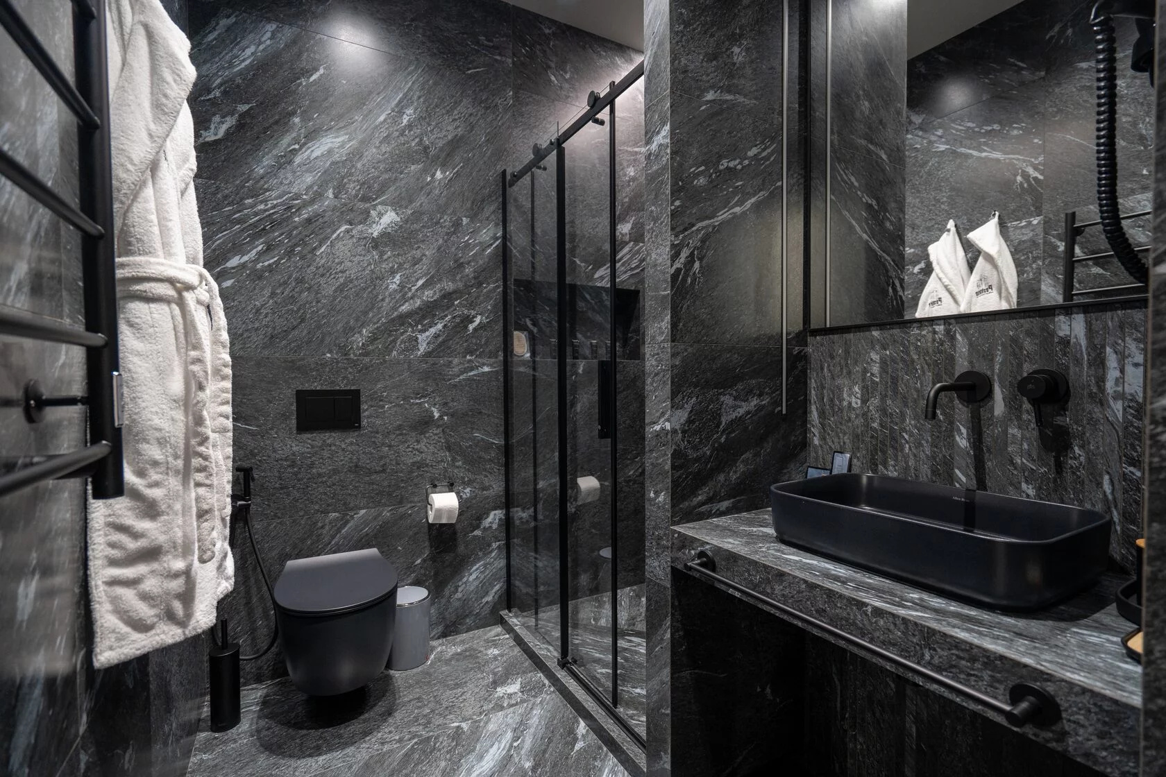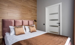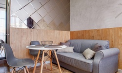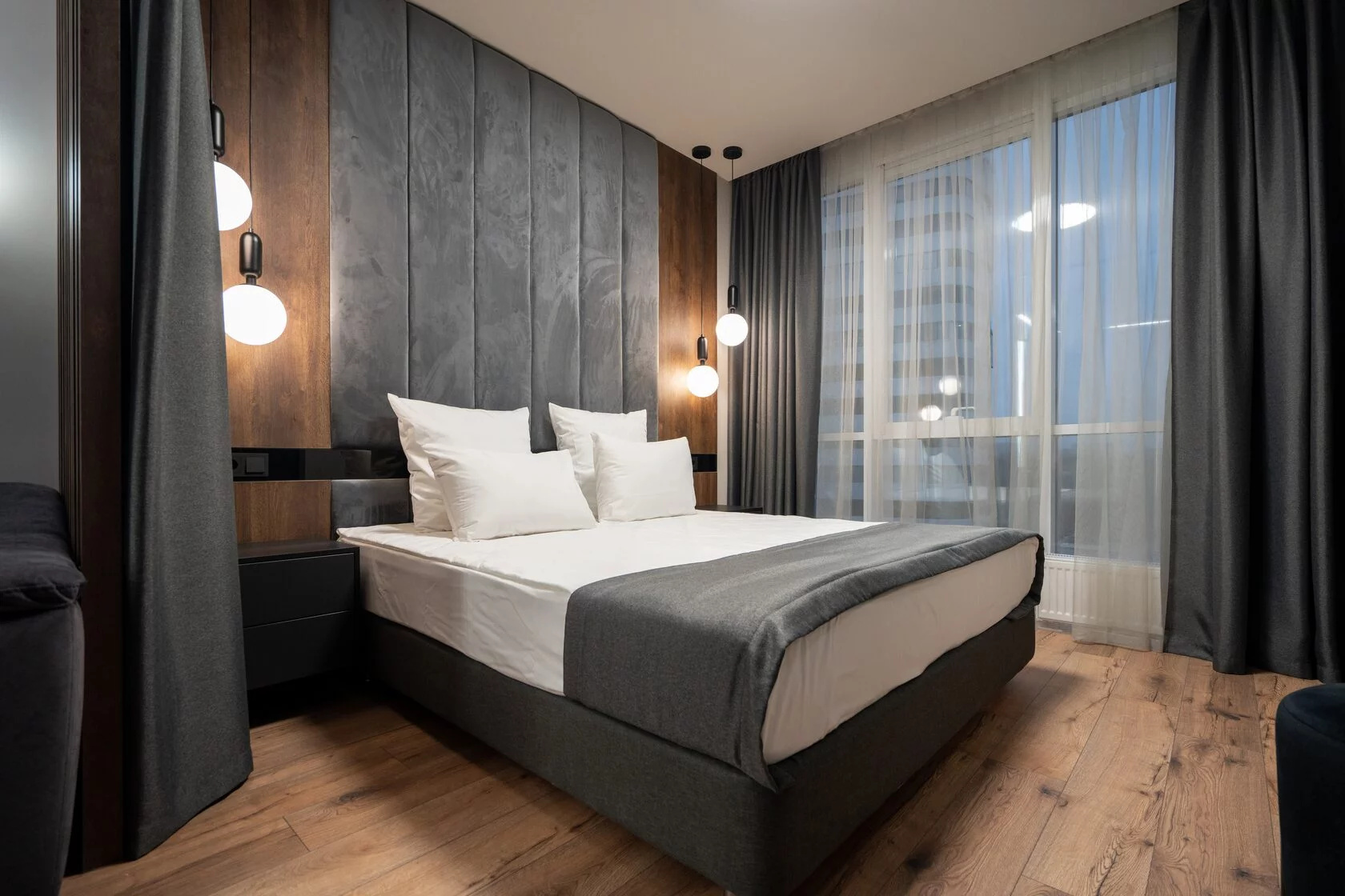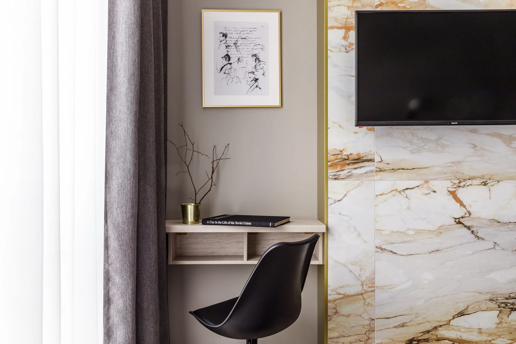 Апартаменты оформлены в современном стиле, в приятной цветовой гамме. Оборудованы мини-кухней со встроенным холодильником, микроволновой печью, варочной поверхностью, вытяжкой, есть кофе-машина и электрочайник. Имеются все необходимые кухонные принадлежности. Для удобства гостей в апартаментах есть гладильная доска, утюг, фен, халаты, одноразовые тапочки, туалетно-косметические принадлежности. Кроме того, для вашего удобства, есть телевизор с большим экраном и доступом к большому количеству каналов, Wi-Fi.