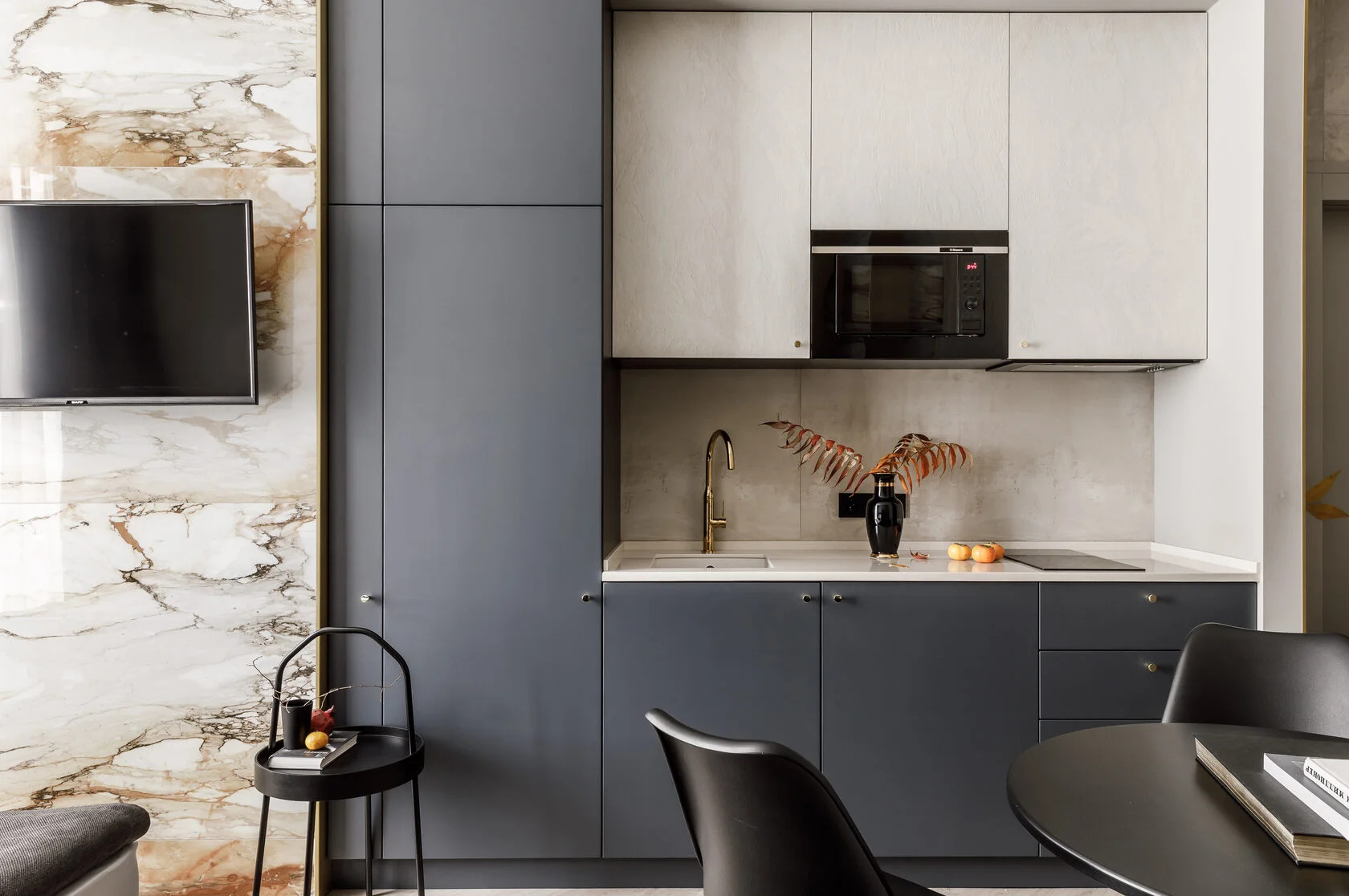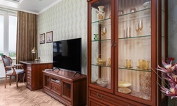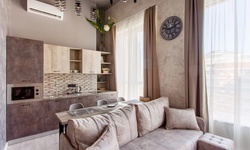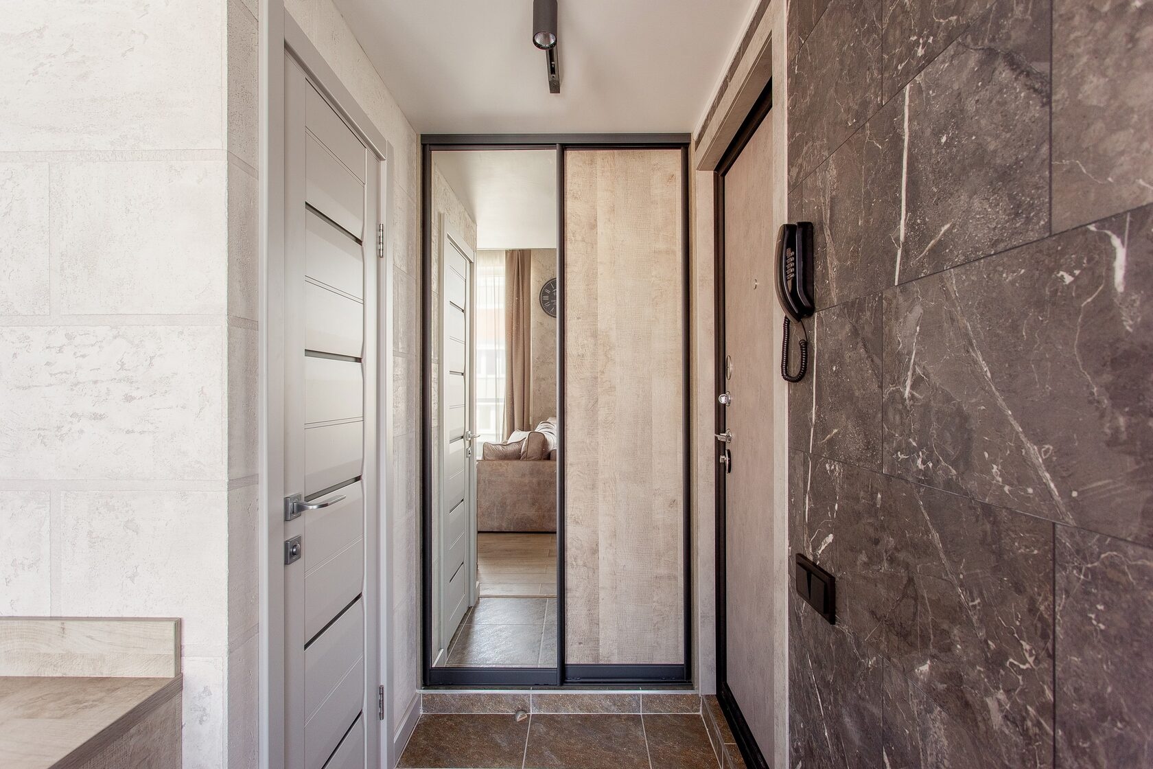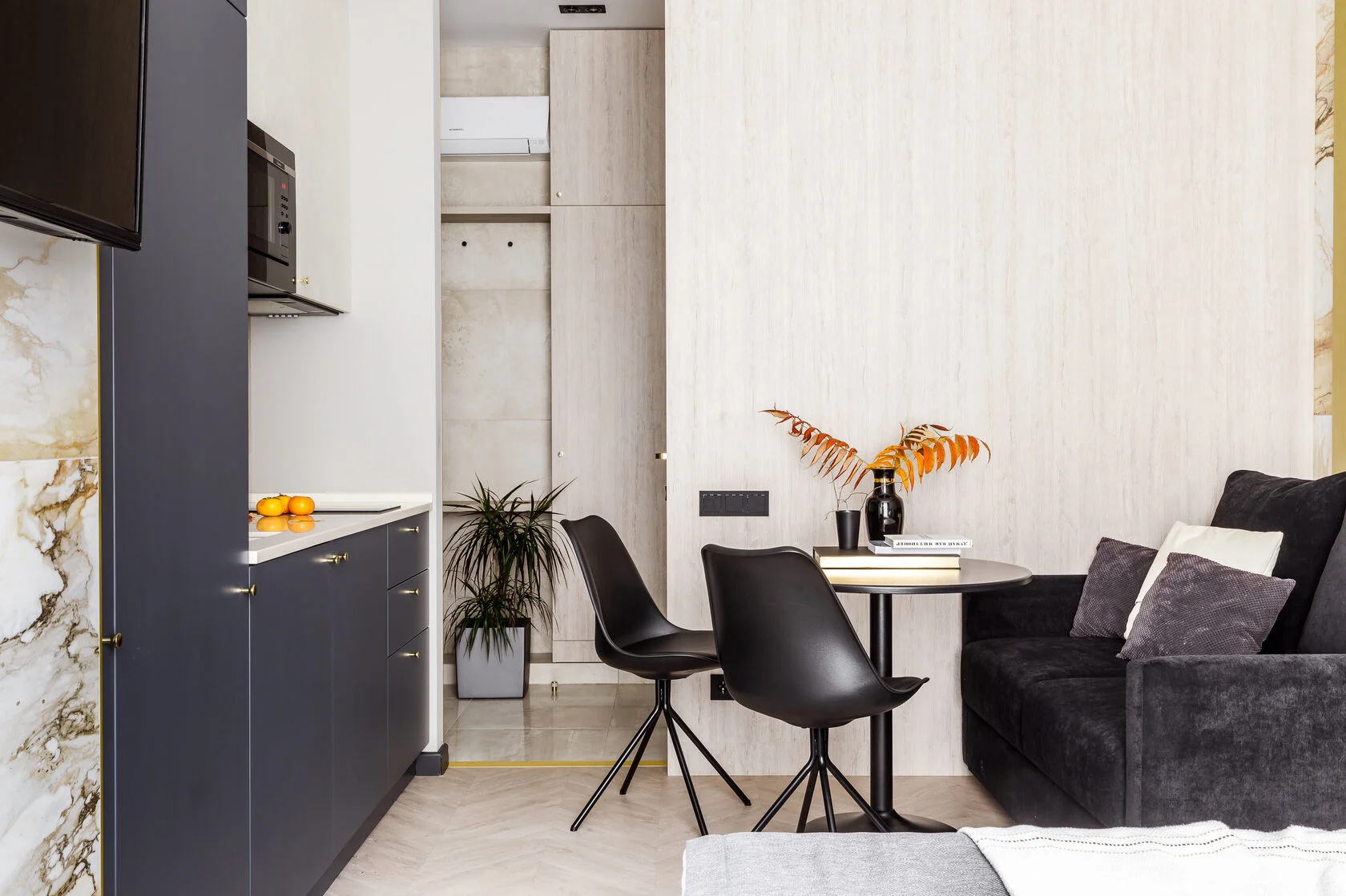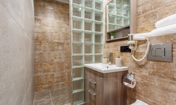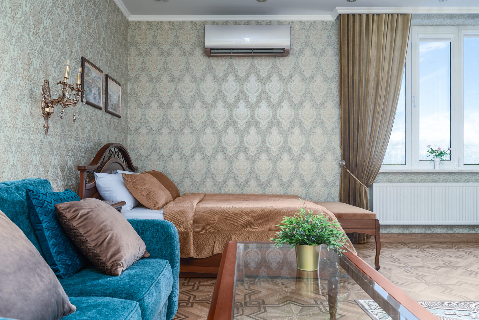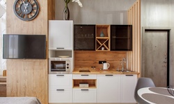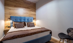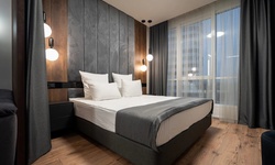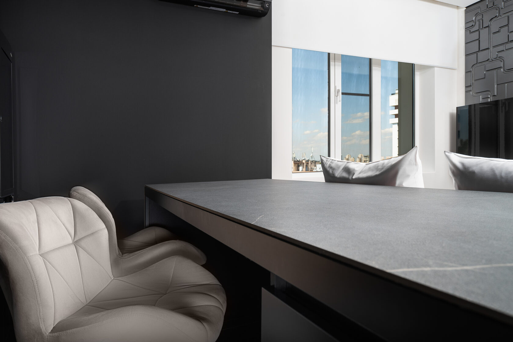 Апартаменты оформлены в современном стиле, в приятной цветовой гамме. Оборудованы мини-кухней со встроенным холодильником, микроволновой печью, варочной поверхностью, вытяжкой, есть кофе-машина и электрочайник. Имеются все необходимые кухонные принадлежности. Для удобства гостей в апартаментах есть гладильная доска, утюг, фен, халаты, одноразовые тапочки, туалетно-косметические принадлежности. Кроме того, для вашего удобства, есть телевизор с большим экраном и доступом к большому количеству каналов, Wi-Fi.