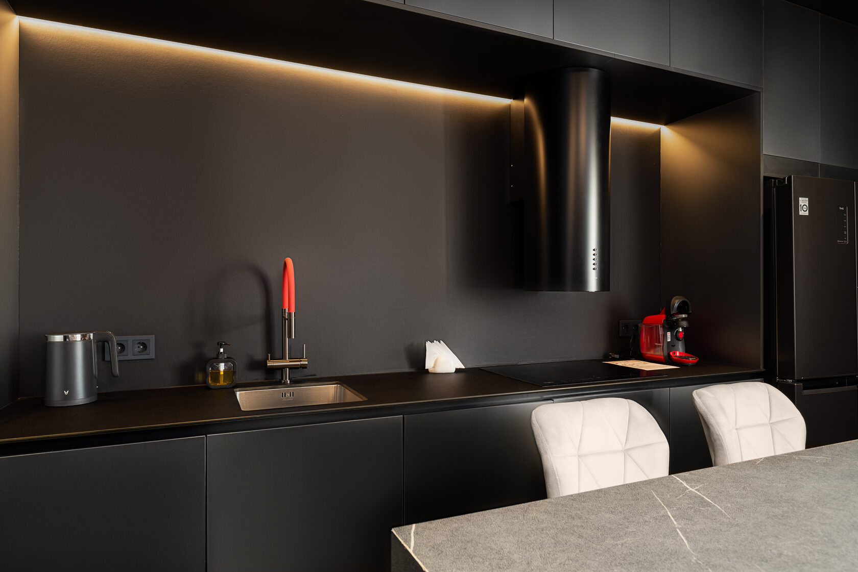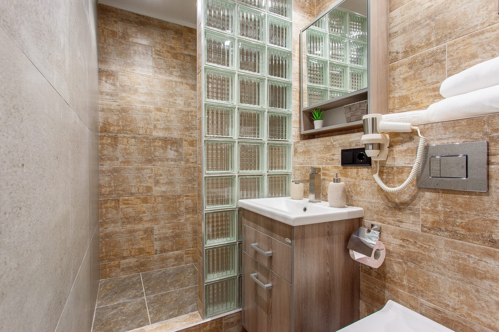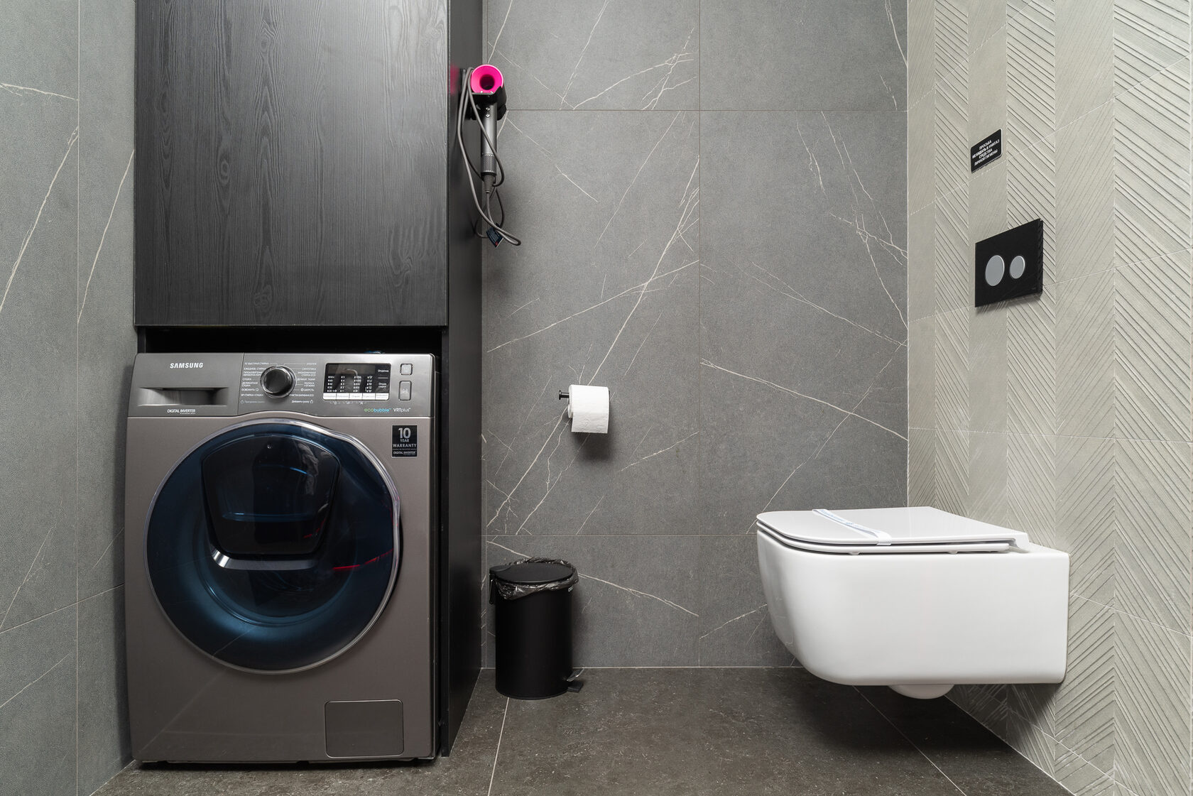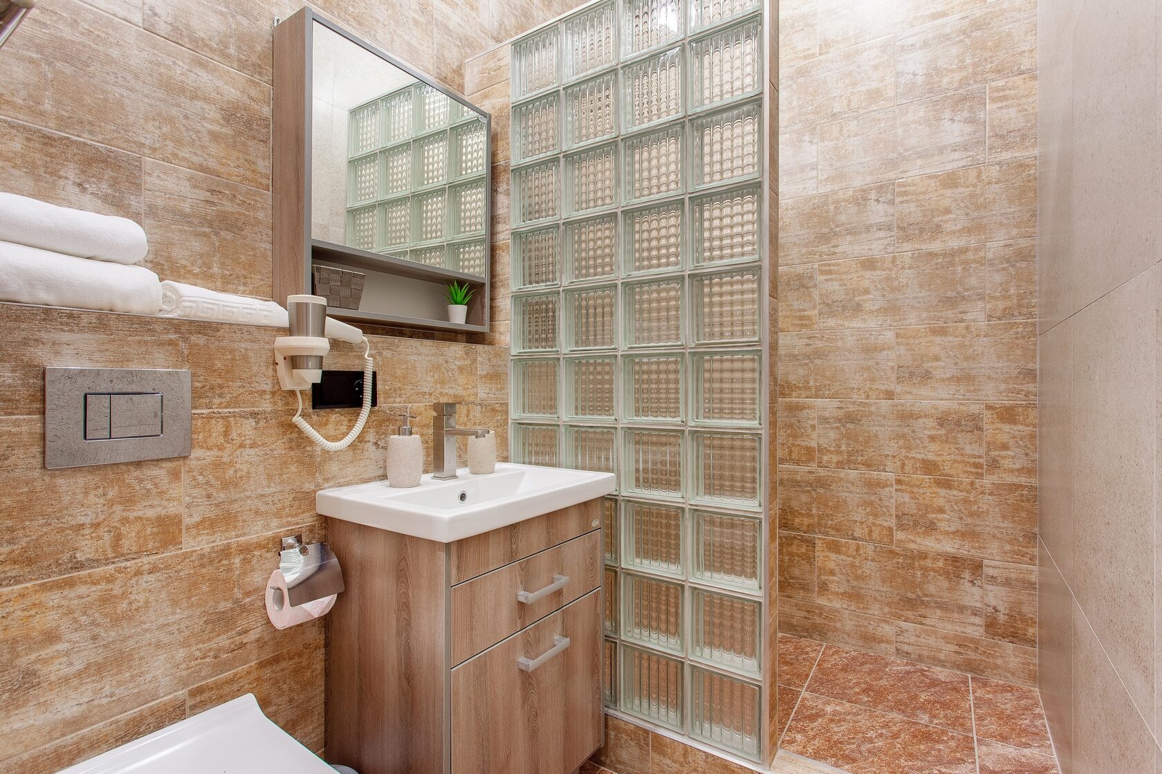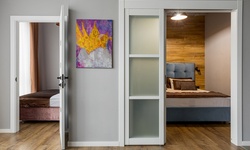Апартаменты оформлены в современном стиле, в приятной цветовой гамме. Оборудованы мини-кухней со встроенным холодильником, микроволновой печью, варочной поверхностью, вытяжкой, есть кофе-машина и электрочайник. Имеются все необходимые кухонные принадлежности. Для удобства гостей в апартаментах есть гладильная доска, утюг, фен, халаты, одноразовые тапочки, туалетно-косметические принадлежности. Кроме того, для вашего удобства, есть телевизор с большим экраном и доступом к большому количеству каналов, Wi-Fi.