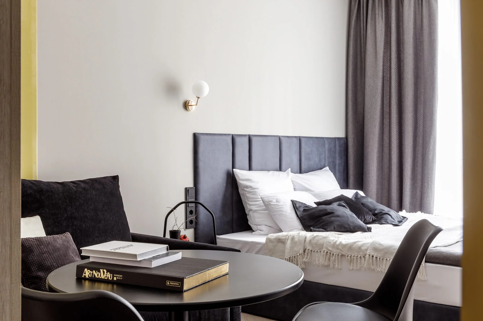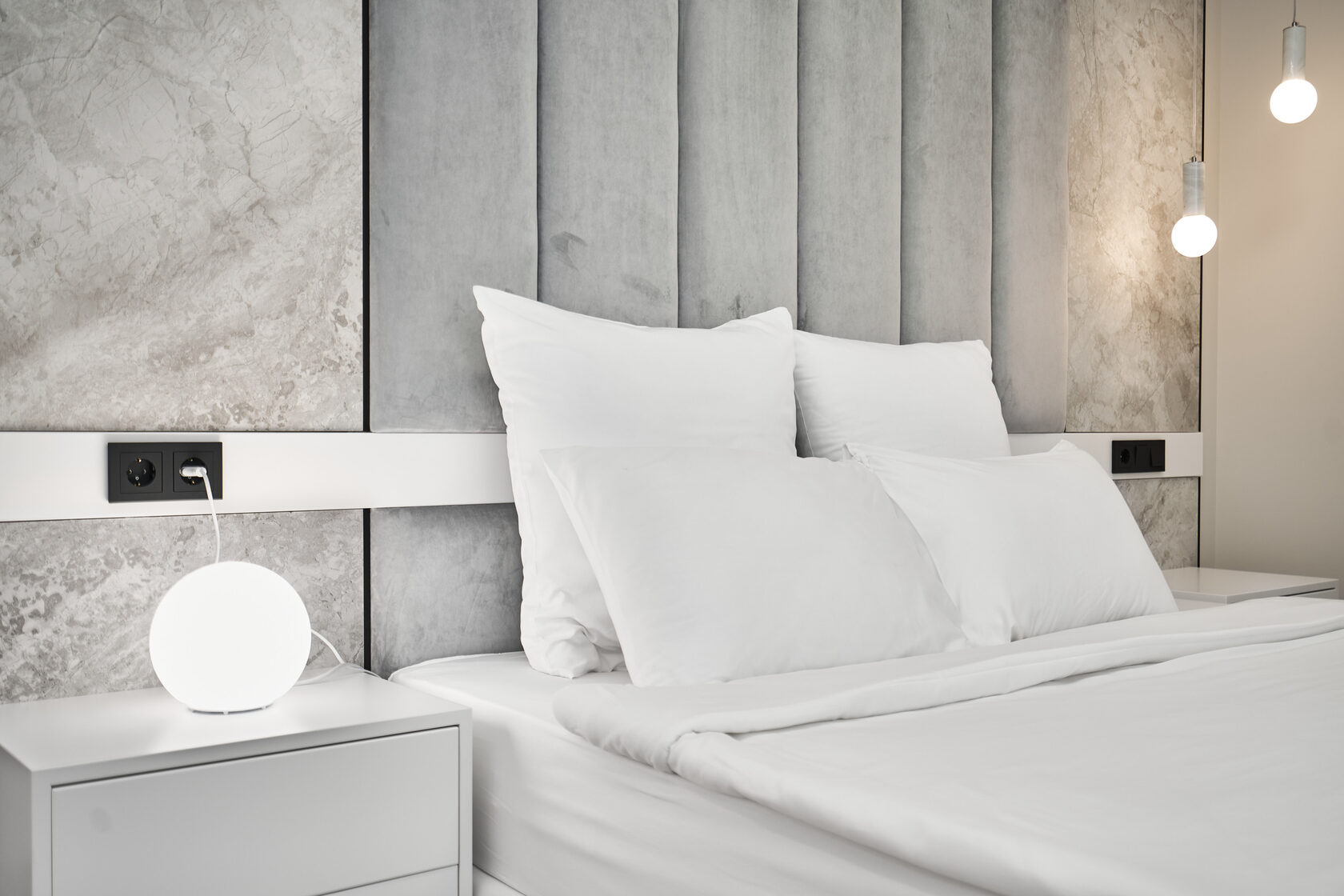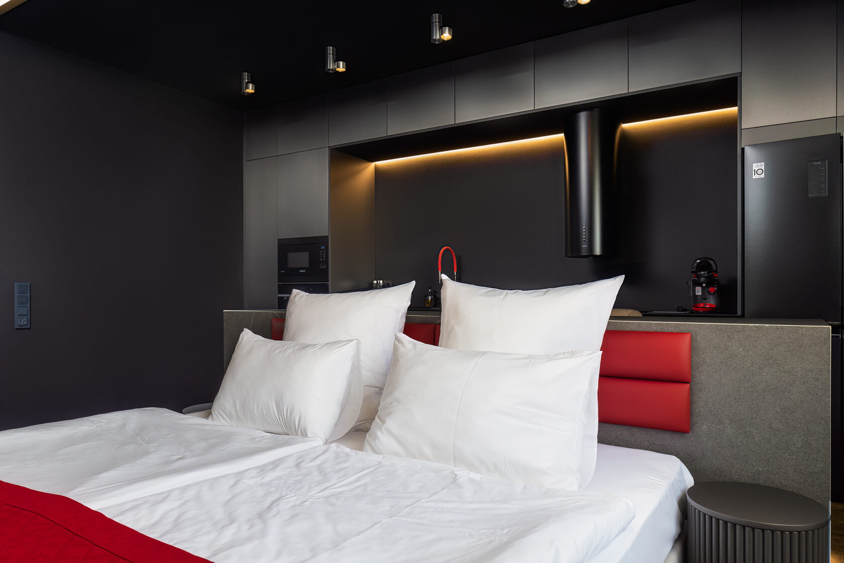 Уютный номер, есть вся необходимая посуда. Кофе можно приготовить в капсульной кофемашине. Отличный интернет. Особенно понравилось, что постельное и полотенца белоснежные. Есть аптечка первой помощи. В номере так же есть колонка Алиса, с ней детям будет нескучно.