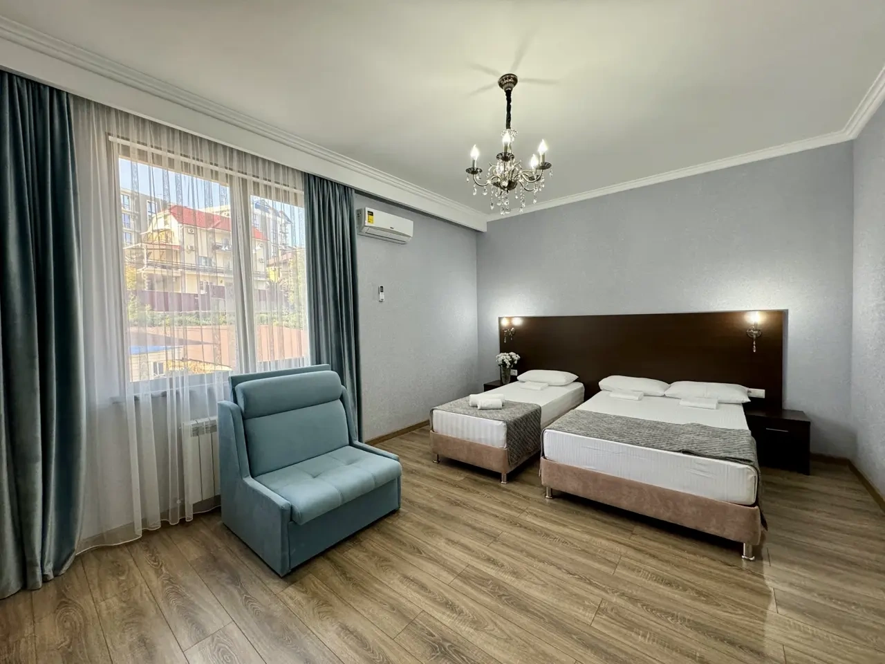 Относительно далеко до моря,в спальном районе,но номера очень чистые,сантехника вся в идеальном состоянии,все новое современное ,без посторонних запахов,очень свежий ремонт,завтрак хороший континентальный,кофе с машины ,все очень чисто и аккуратно в 5 минутах есть магазины до 5 и магнита минут 10 ,до вокзала 15 минут пешком!вообщем очень достойно