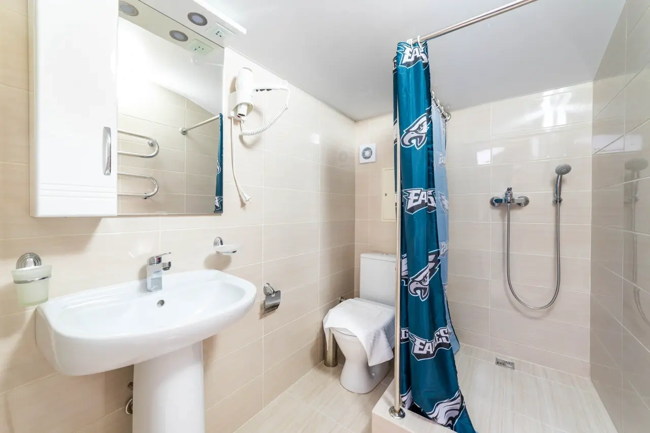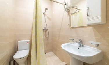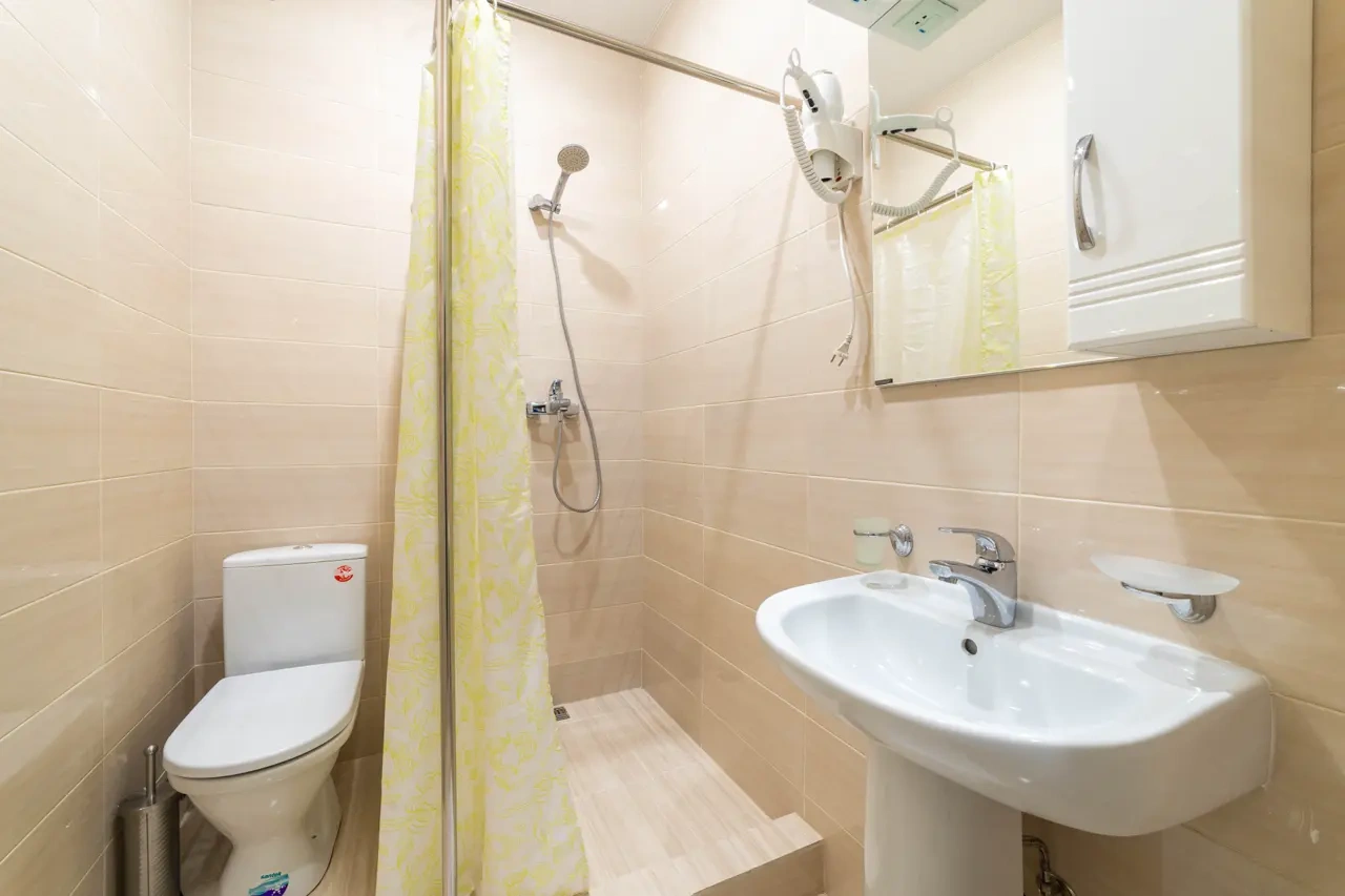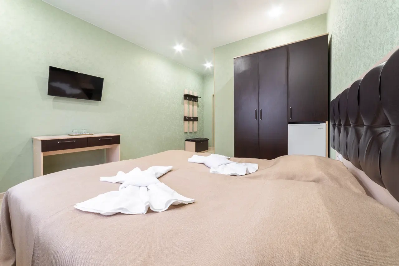 Все чисто, большая удобная кровать, холодильник, чайник, телевизор, фен. Все работает, душ чистый. Мыло, шампунь все есть.
