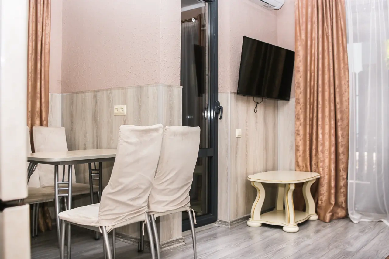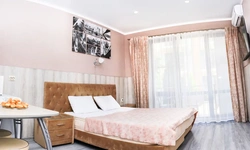 Апартаменты данного класса комфортности обеспечены всем необходимым для приятного времяпровождения. В наполнение апартаментов входят: Мини-кухня Шкаф/Гардероб Электрический чайник Микроволновая печь Плита для приготовления пищи и холодильник двуспальная кровать раскладной диван стиральная машина фен 2 телевизора с плоским экраном и кабельным ТВ, Wi-Fi. А встретить рассвет или проводить закат Вы сможете на небольшом и уютном балконе.
