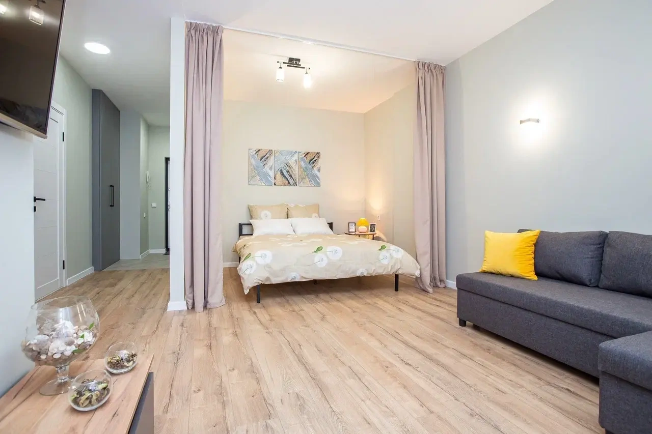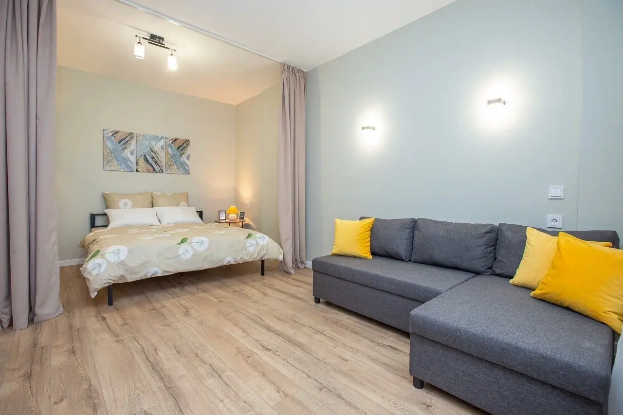 Студия большая с большой удобной кроватью, есть стиральная машина. Бесконтактное заселение.