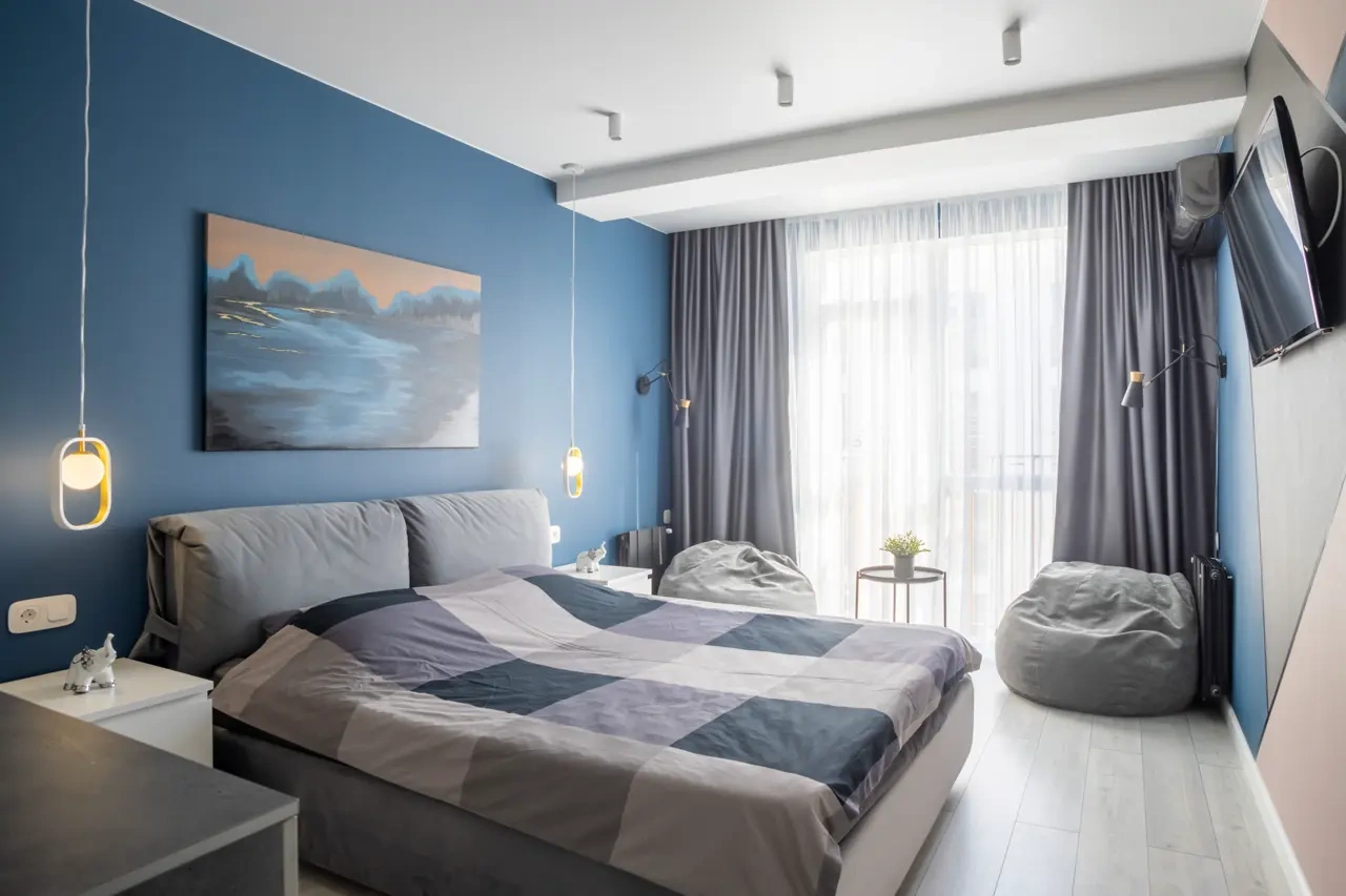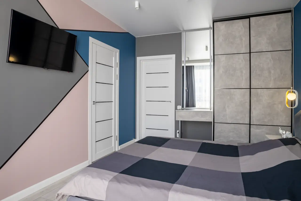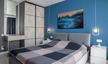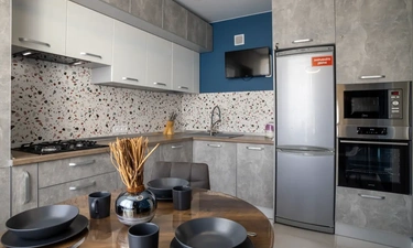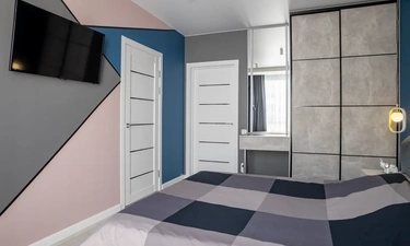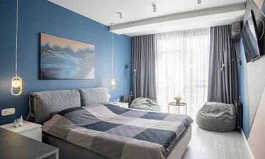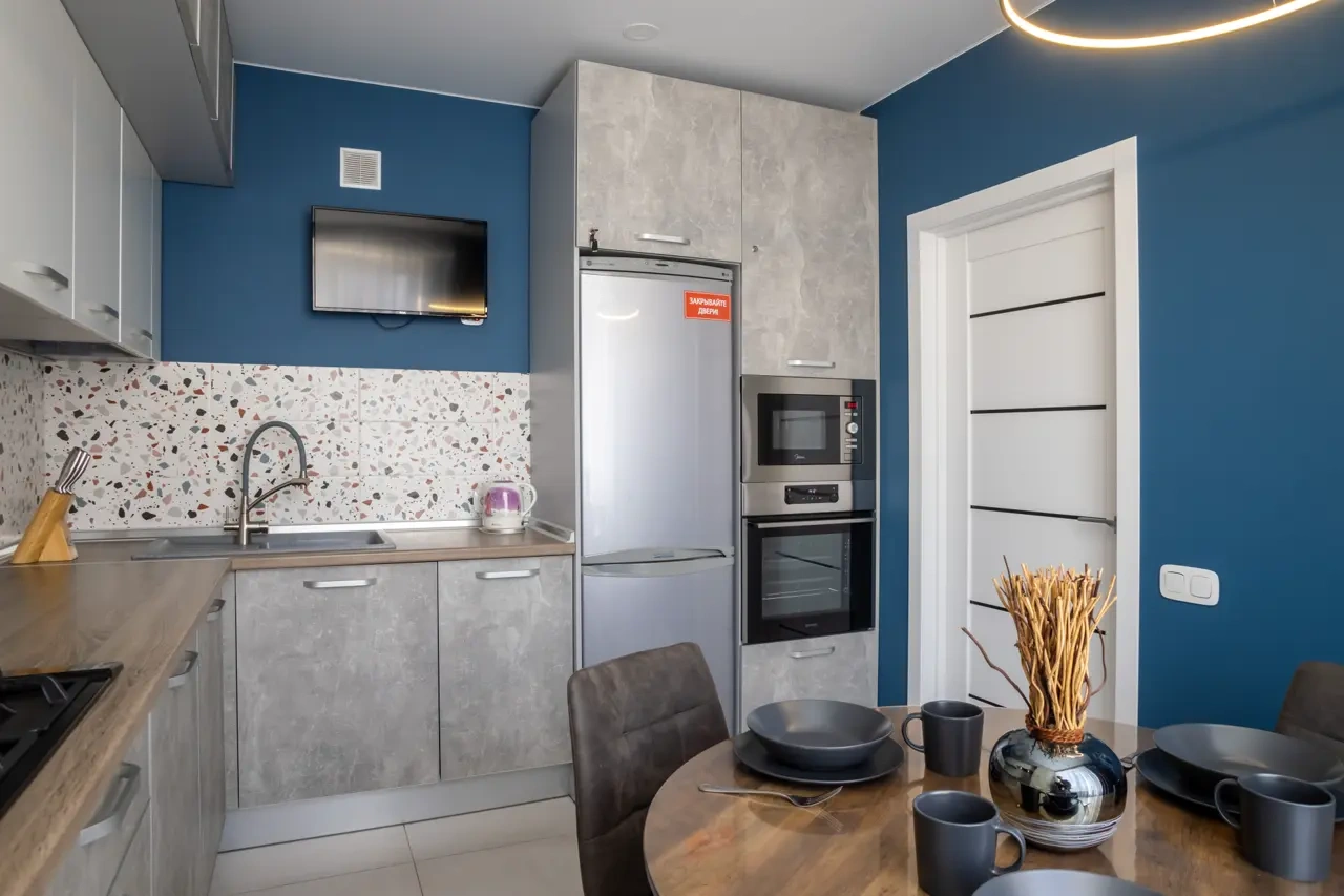 В комнате двуспальная кровать, ЖК-ТВ (smart-tv), WI-FI интернет, кондиционер, кухня 12 м. кв. (встроенная мебель), электрочайник, газ. плита, СВЧ-печь, посудомойка, духовка.