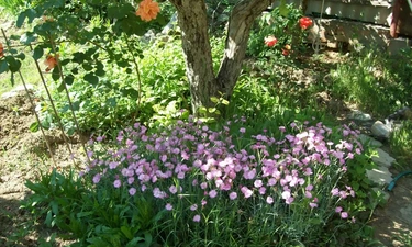 Летняя столовая под тентом примыкает к двум кухням и продувается прохладой, с неё видно обилие цветов и зелени!