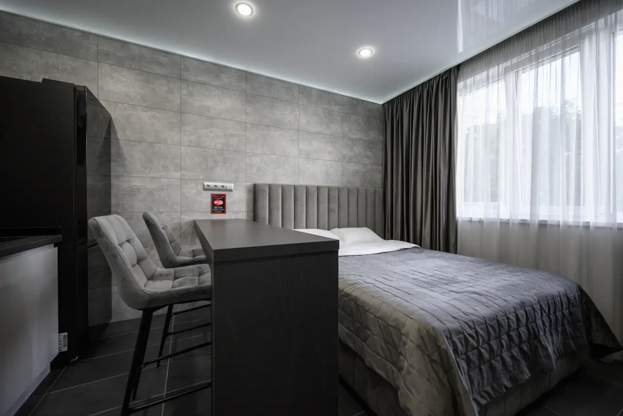 Номер с повышенной комфортностью с одной двуспальной кроватью, большей площади состоящий из спальни, собственной кухни и ванной. В номере большой телевизор, кондиционер, сейф, стиральная машина, плита, холодильник, много посуды и есть даже кофемашина. Двуспальная кровать с удобным ортопедическим матрасом, также имеется дополнительная раскладная кровать с матрасом для одного ребёнка или взрослого. Идеально подходит для семейной пары и одного ребёнка.