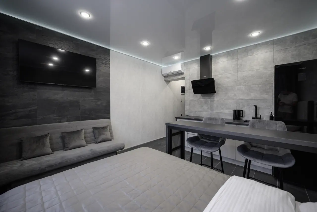 Комфортный просторный номер с одной двуспальная кровать, состоящий из спальни, собственной кухни и ванной. В номере большой телевизор, кондиционер, сейф, стиральная машина, плита, холодильник, много посуды и есть даже кофемашина. Двуспальная кровать с удобным ортопедическим матрасом, также имеется дополнительная раскладная кровать с матрасом для одного ребёнка или взрослого. Идеально подходит для семейной пары и одного ребёнка.