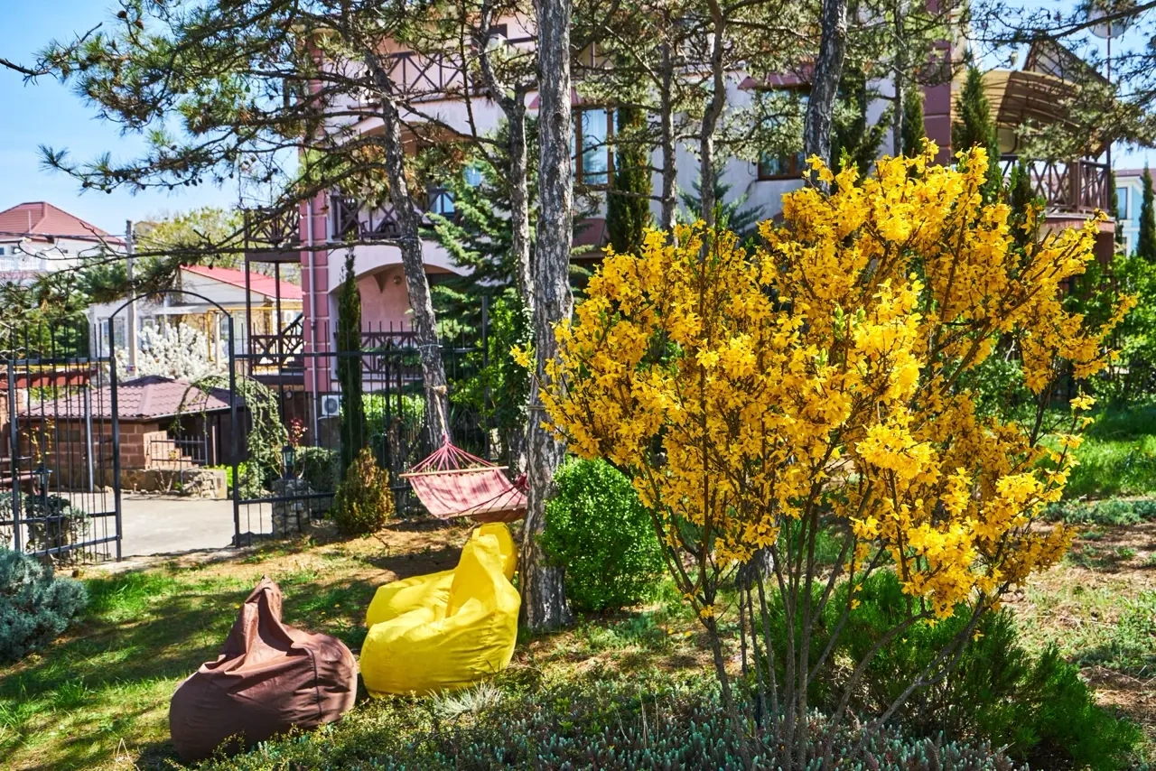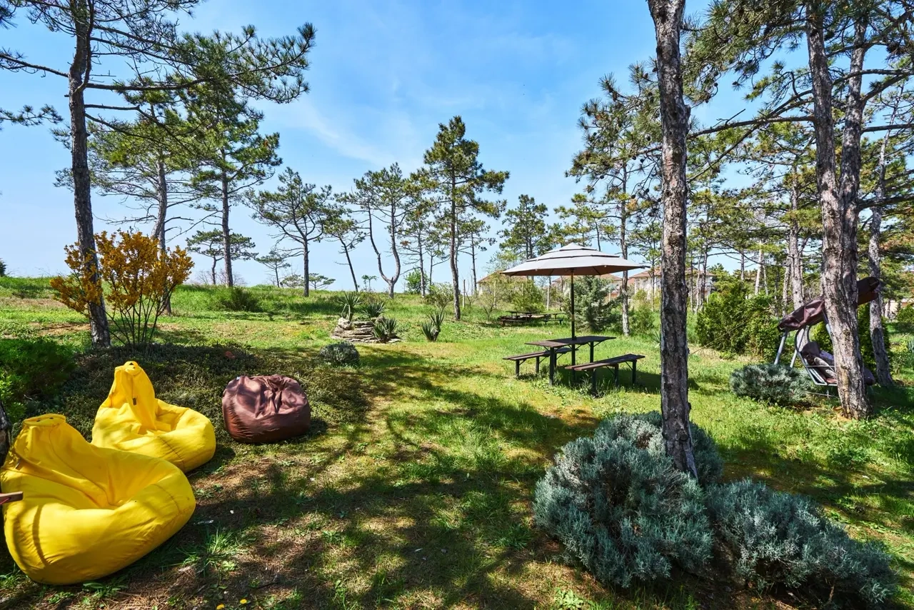 - Удобно расположенные места для экологичного отдыха в сосняке и внутренних двориках.