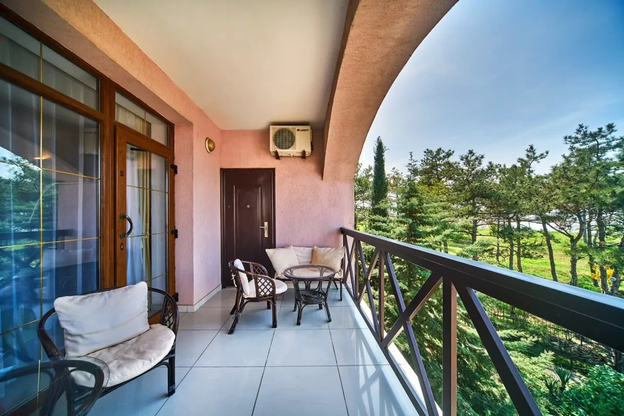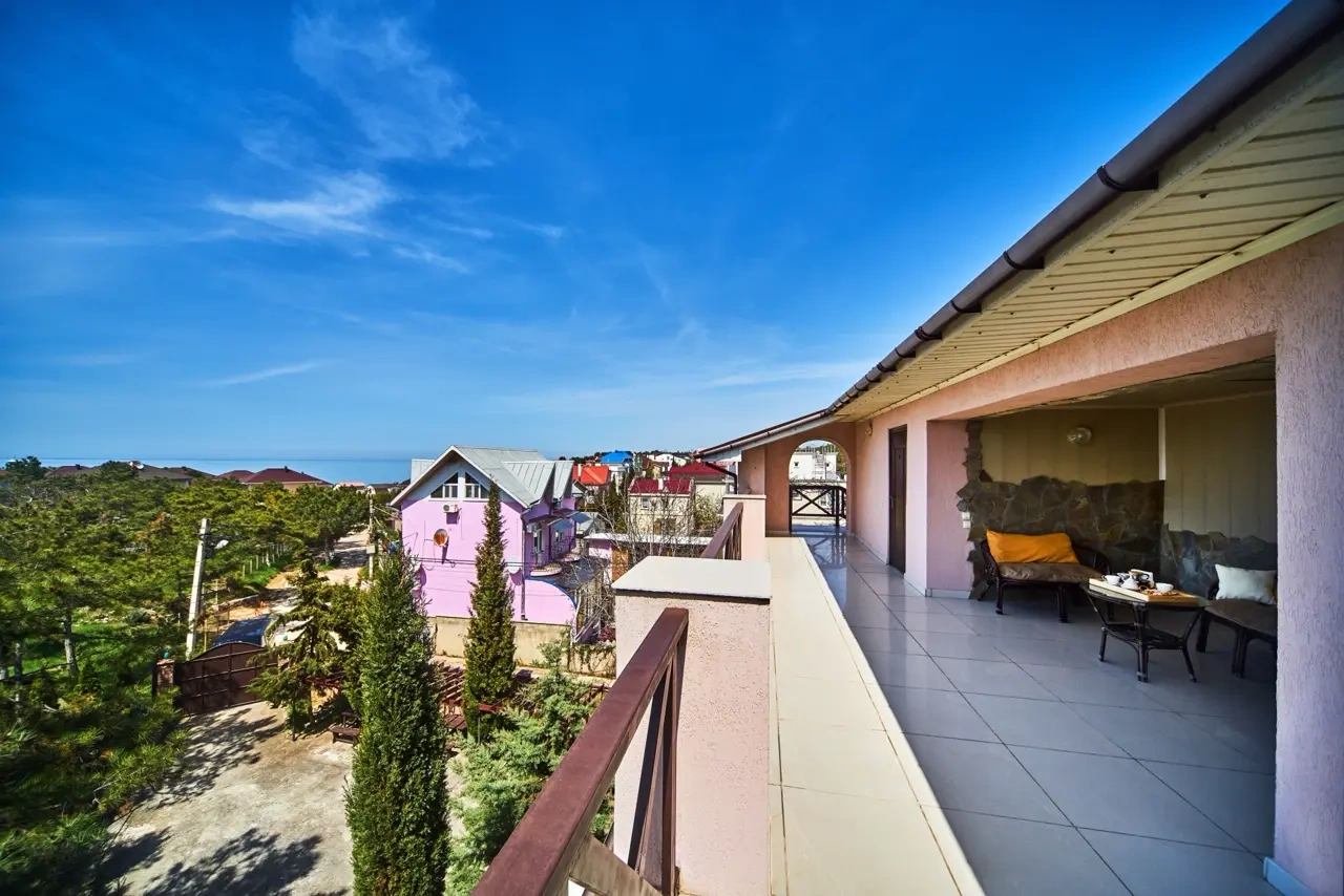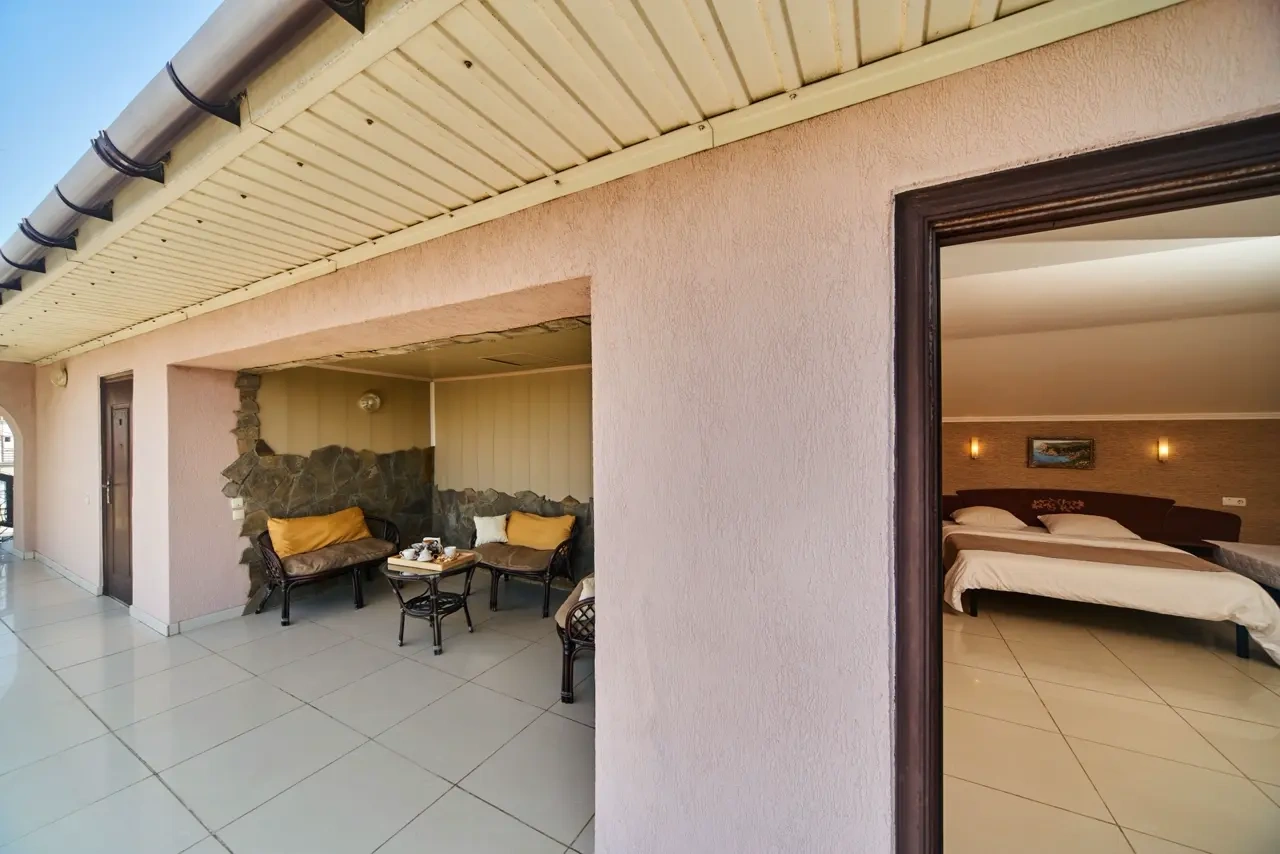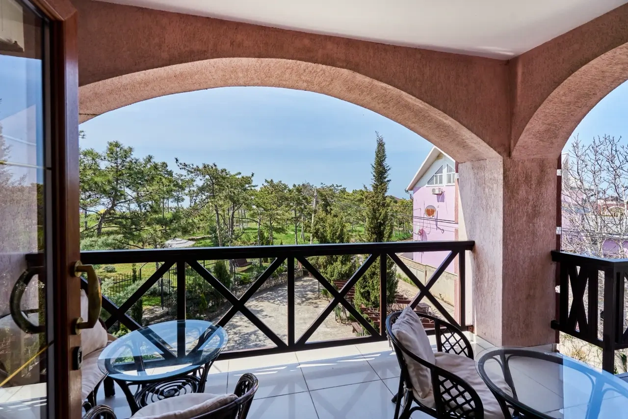 Номер Люкс с видом на море расположен на 4 этаже, выходит на отдельную террасу для двух номеров. Подходит для размещения 3 взрослых и ребёнка. Стоимость доп. места для ребёнка оплачивается на месте и составляет 350 руб. Включает в себя одну двуспальную и одну односпальную кровати, холодильник, телевизор, шкаф, сейф, кондиционер, туалет, душ, умывальник, фен , утюг, столовые приборы. В общей зоне помимо прочего расположена полностью оборудованная кухня со всеми удобствами для приготовления еды, зона барбекю, а также стиральная машина.