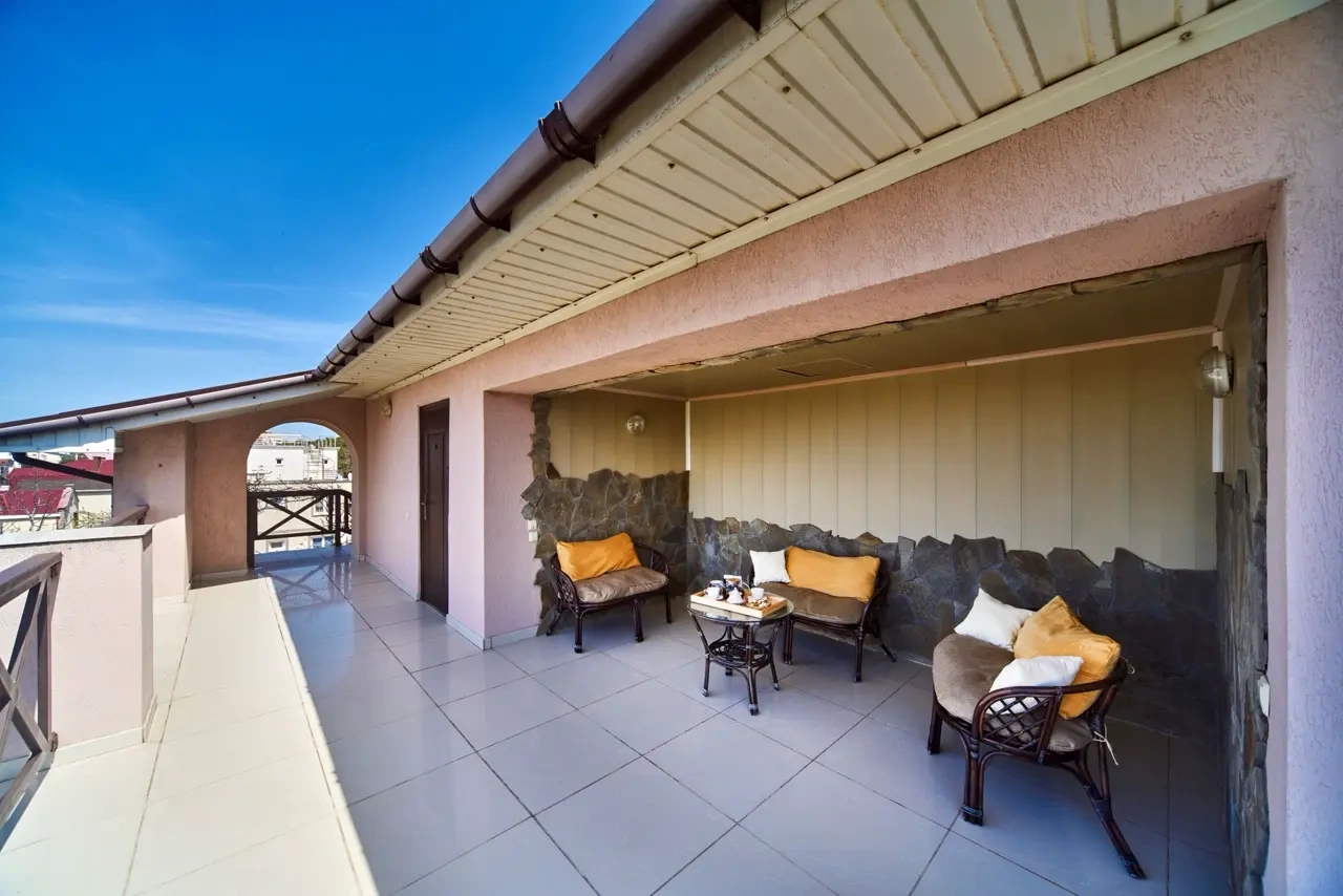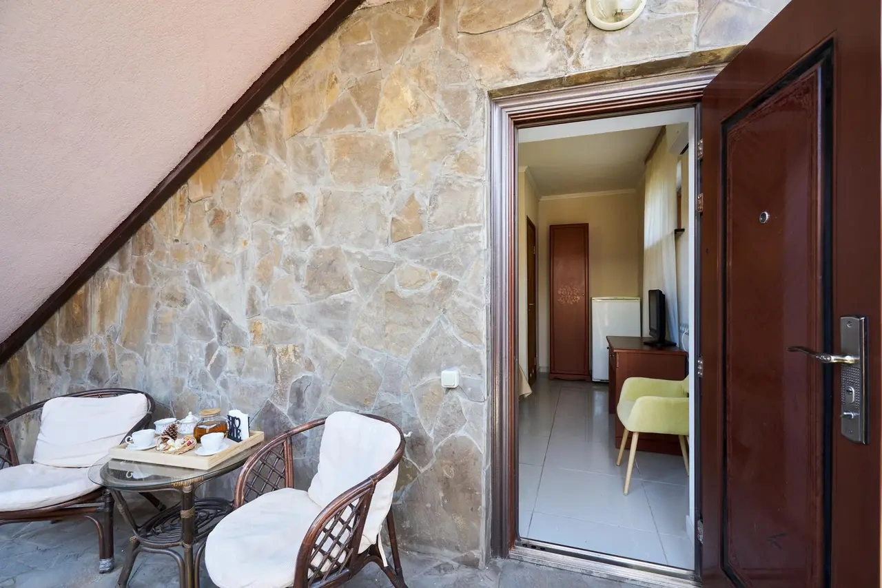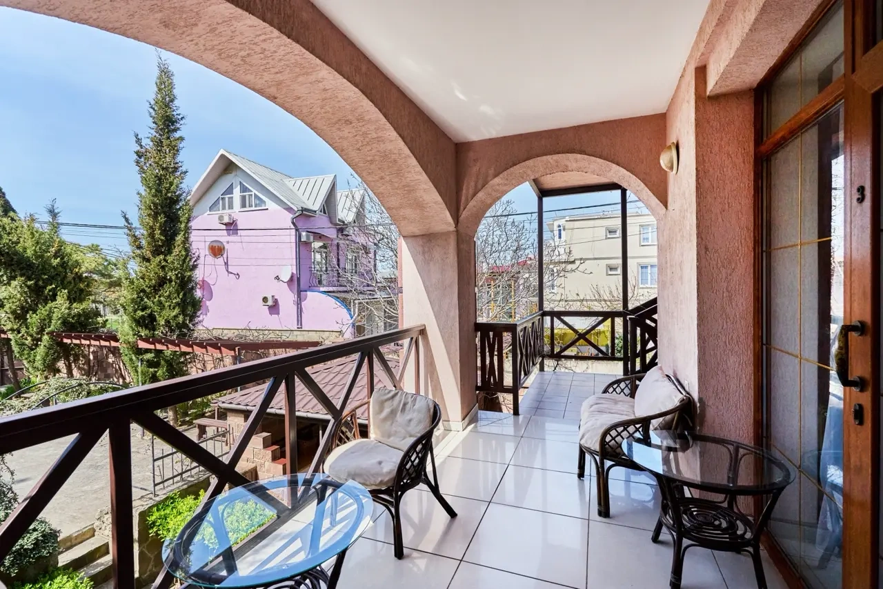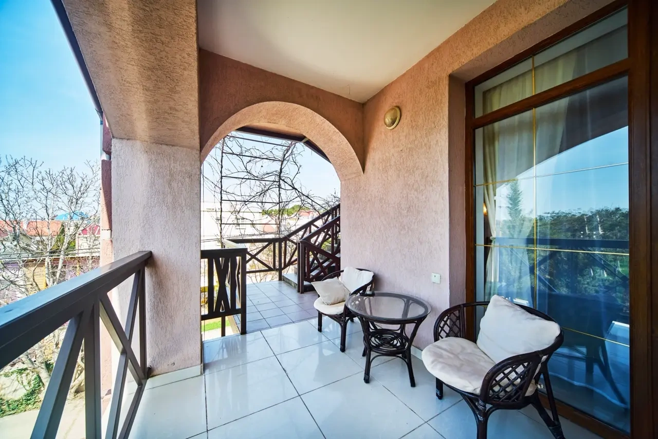 Номер комфорт расположен на 2 и 3 этажах, выходит на отдельную террасу для двух номеров. Включает в себя одну двуспальную и одну односпальную кровати, холодильник, телевизор, шкаф, сейф, кондиционер, туалет, душ, умывальник, фен , утюг, столовые приборы. В общей зоне помимо прочего расположена полностью оборудованная кухня со всеми удобствами для приготовления еды, зона барбекю, а также стиральная машина.