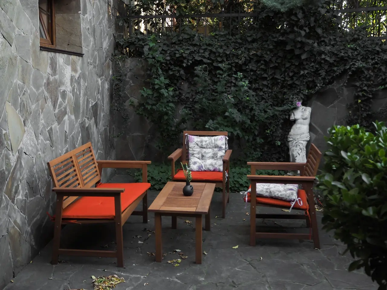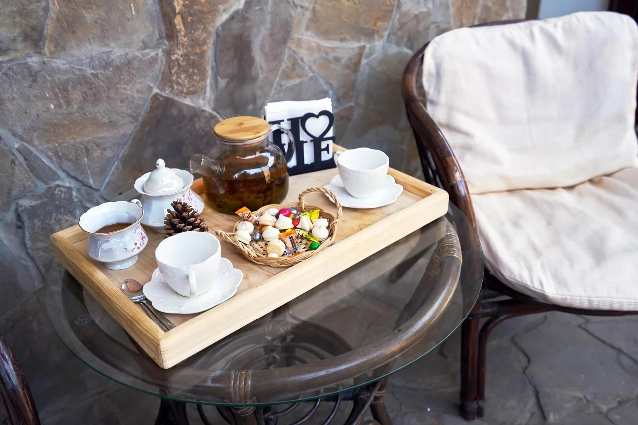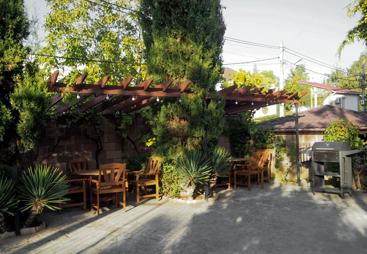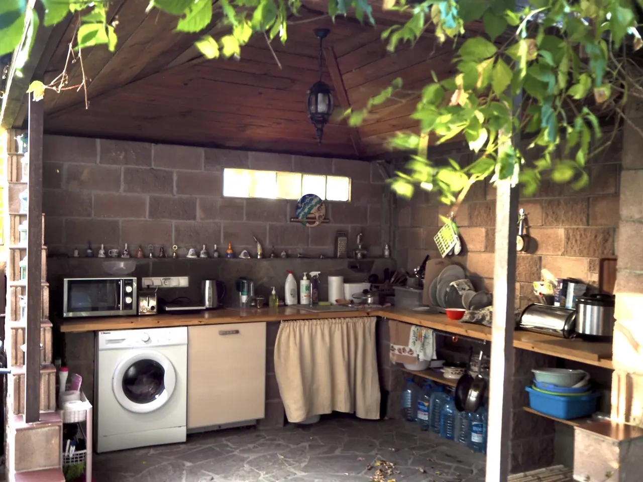 - Оборудованная летняя кухня с газовой плитой, микроволновой печью, стационарным камином-мангалом, мойкой, необходимым набором кухонного инвентаря для приготовления еды и барбекю