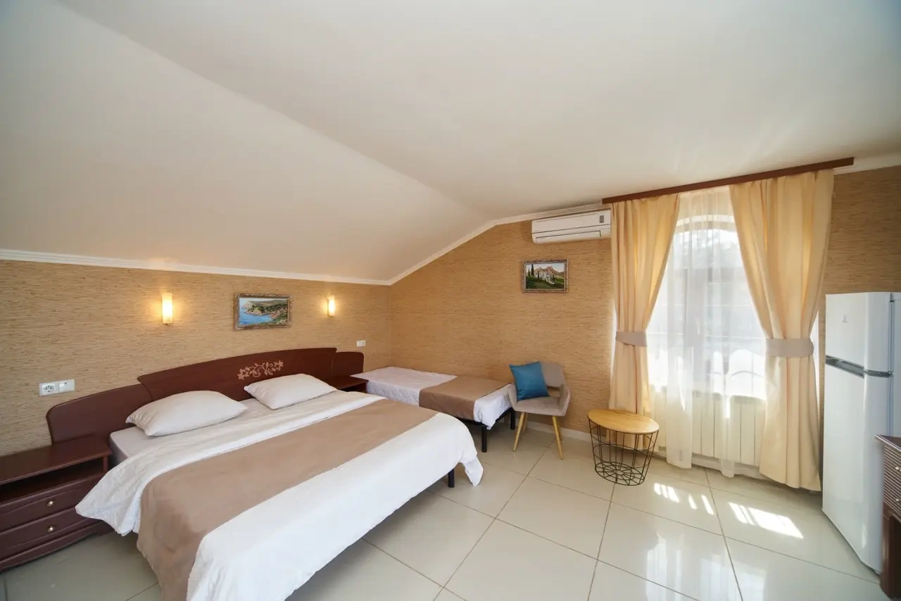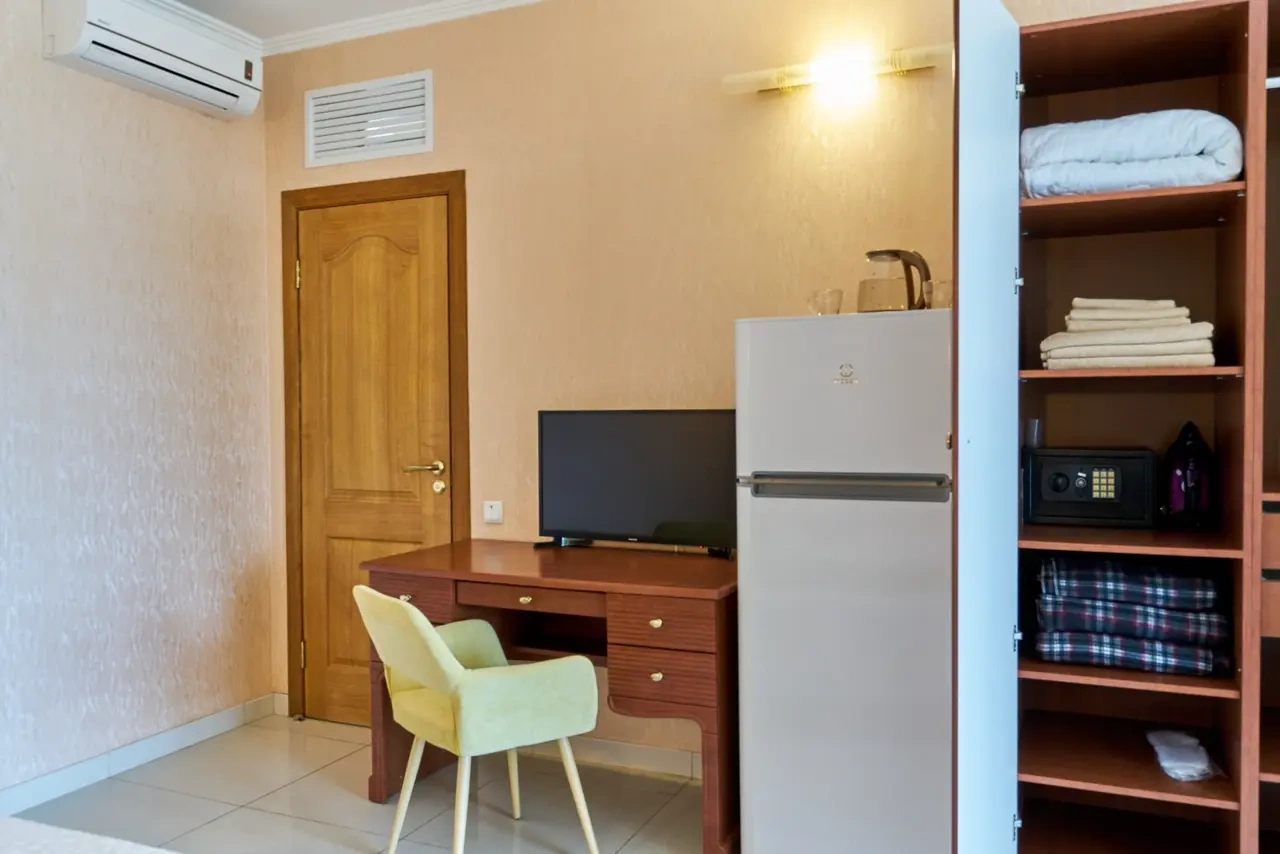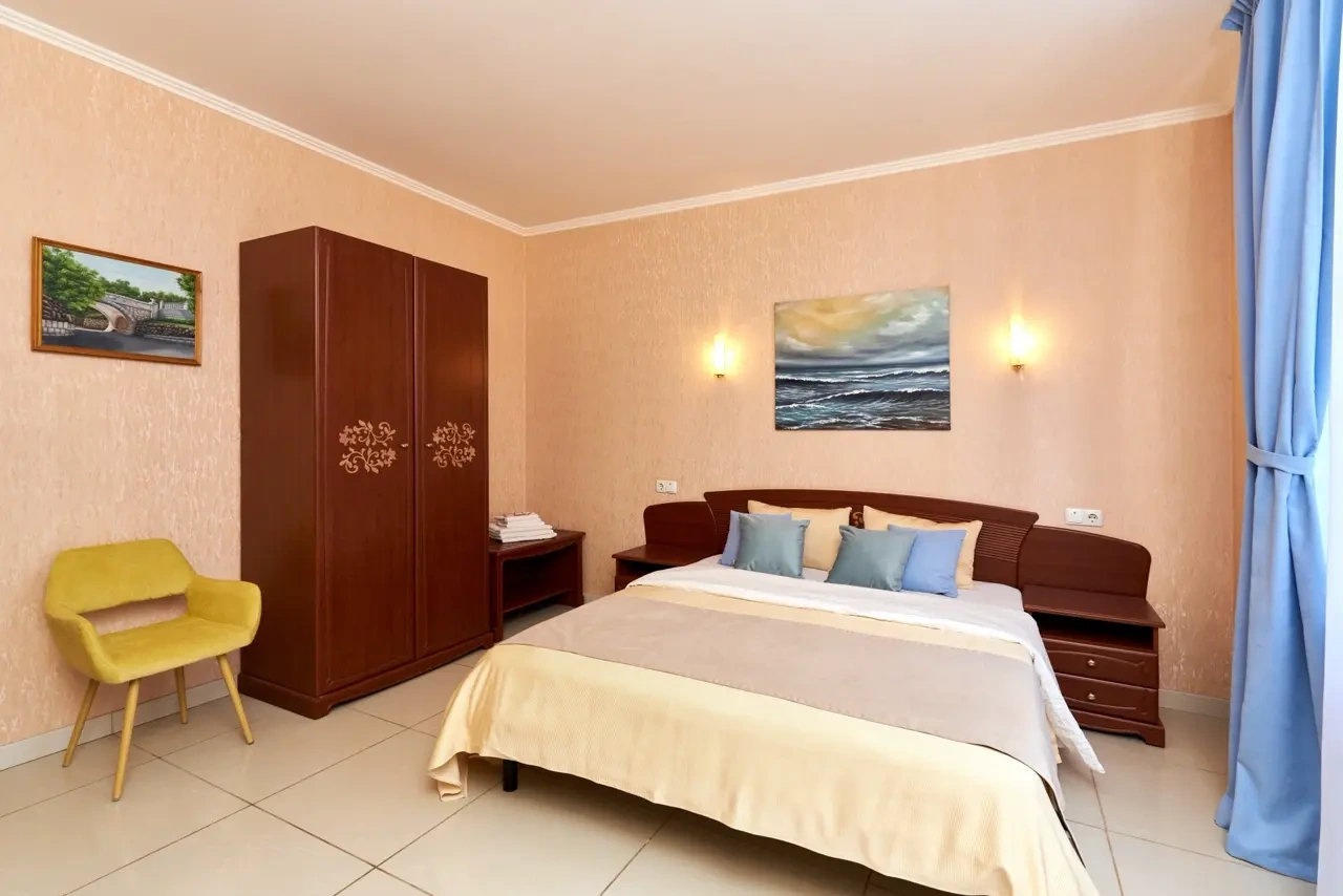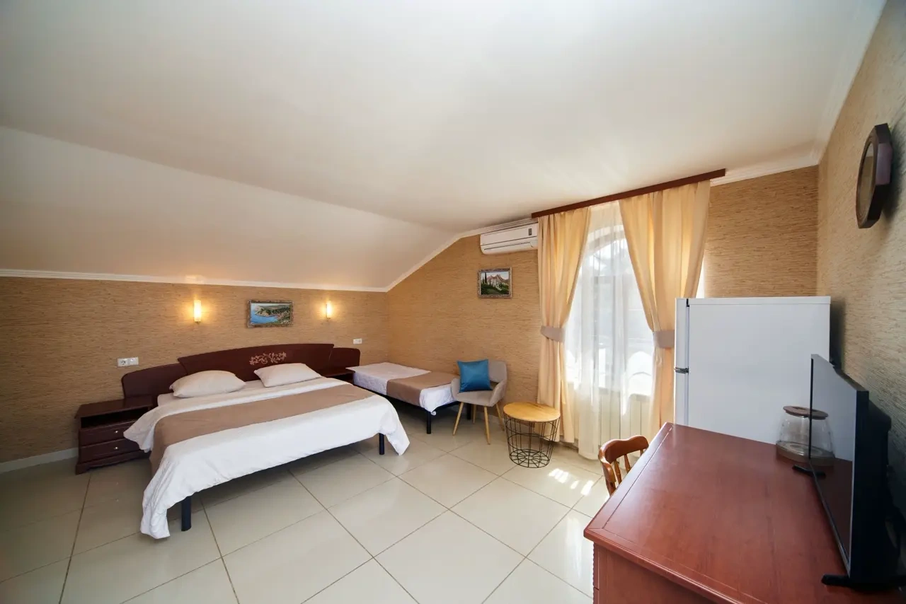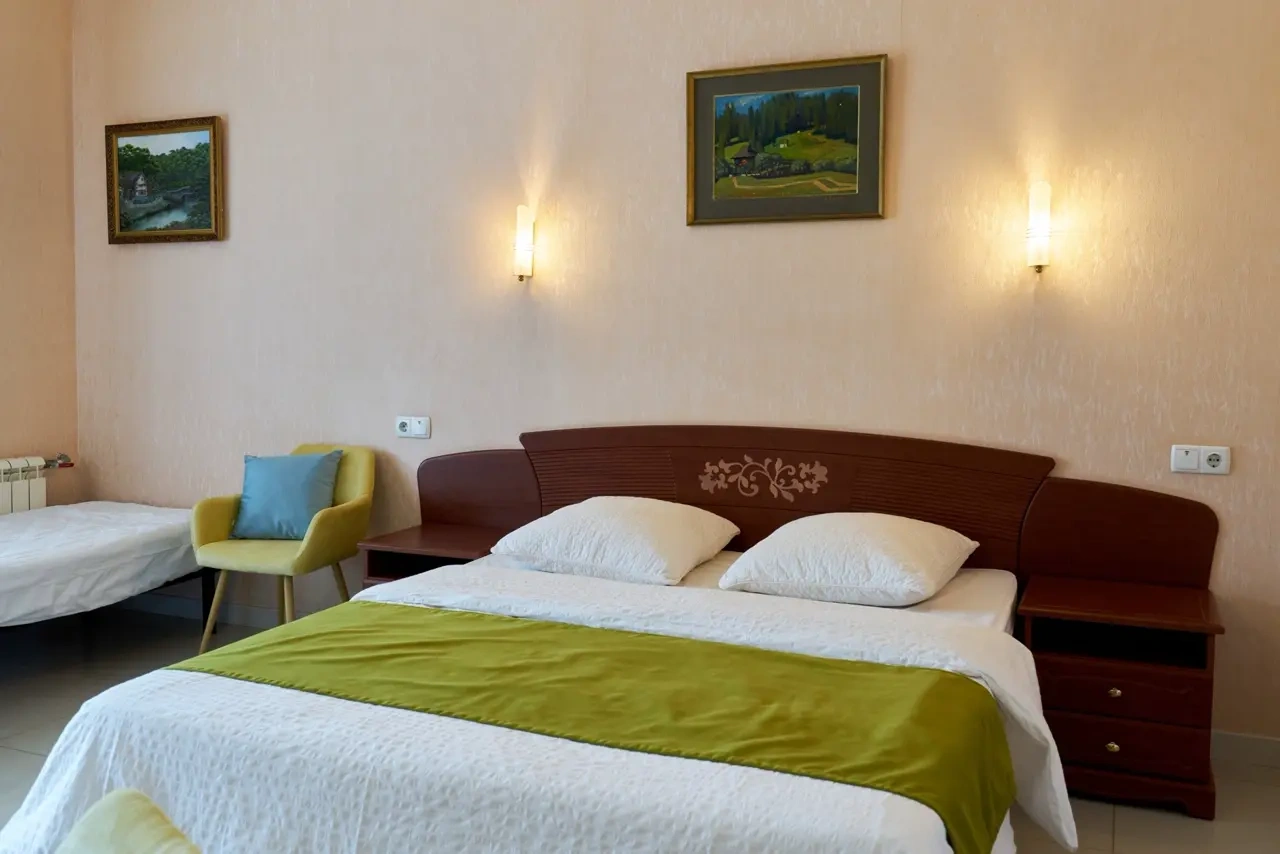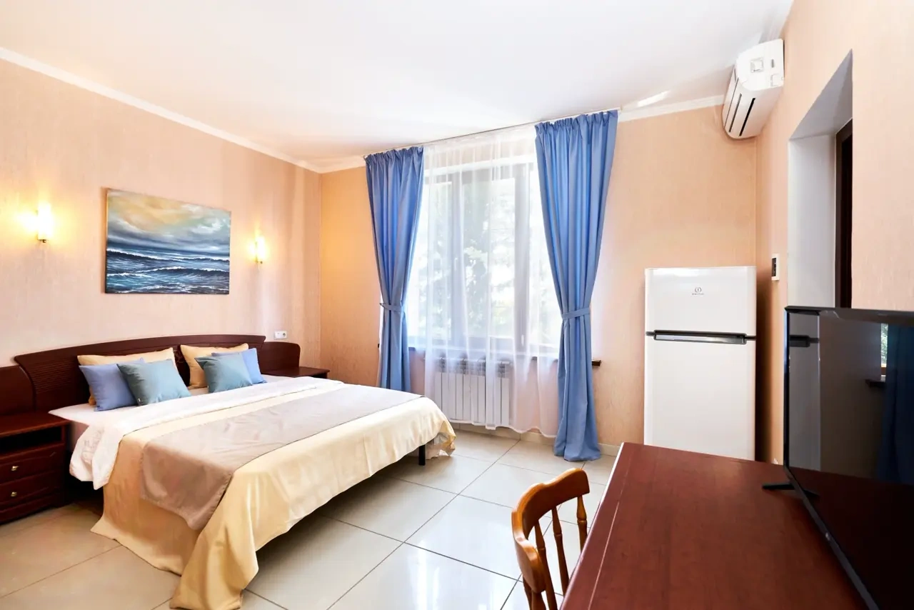 - Номера оснащены современной мебелью и техникой, имеется сейф, холодильник, набор посуды, отдельный с/узел и душевая кабина, начиная со 2-го этажа установлены кондиционеры, предусмотрена возможность размещения дополнительного места.