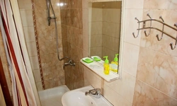 у нас было два 4-х местных номера на мансардном этаже. В одном из них был мизерный санузел со стеклянной дверью, что не очень удобно и приятно. Там было почти не развернуться. Утюг плохо гладил, но у меня был свой хороший. Ну и расположение - однозначно не всем подходит.
