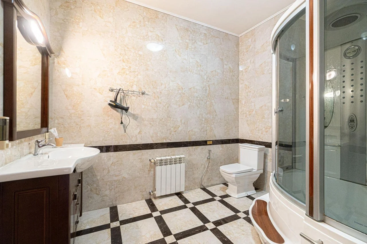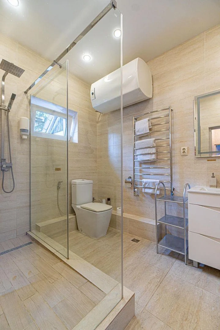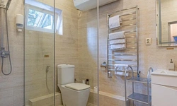 Вода в душе не уходила, кондиционер надо спросить как разобраться с ним, вообще не минус, но подъем по ступенькам не простой, это просто для информации.