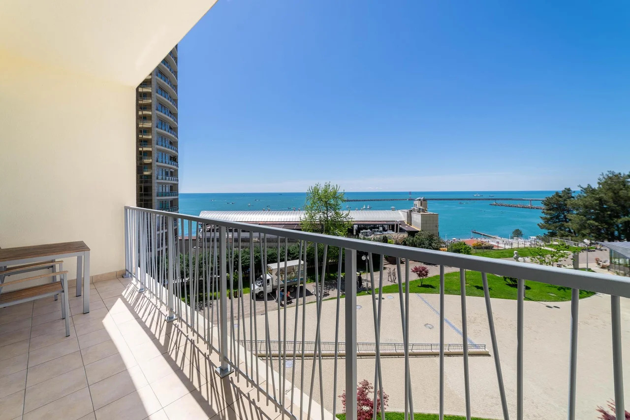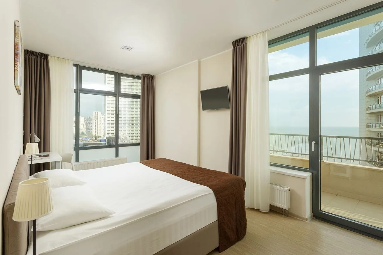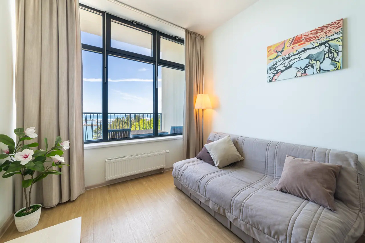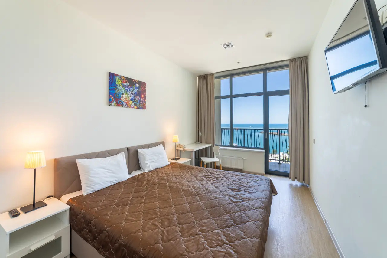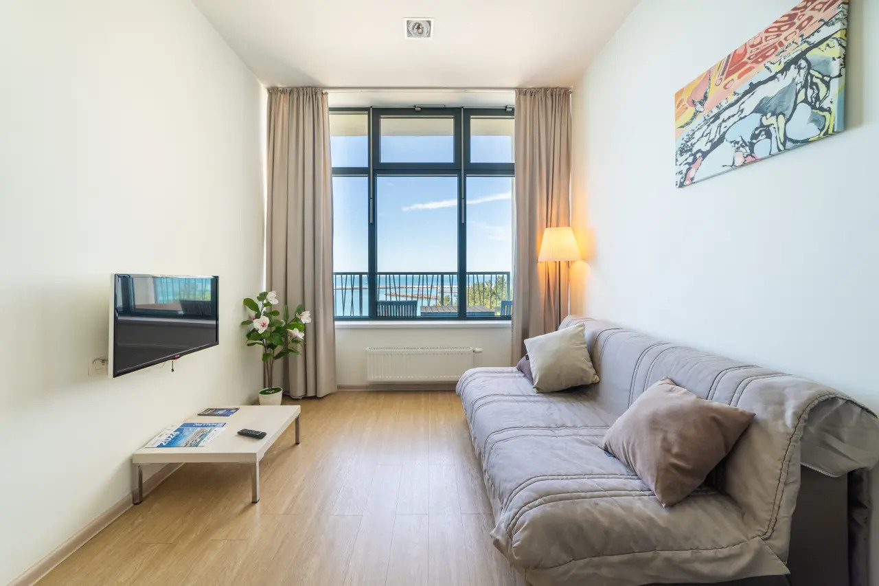 Место расположения супер. В апартаментах все необходимое есть из мебели и бытовой техники. Фактически - 2 комнаты, балкон с видом на море.