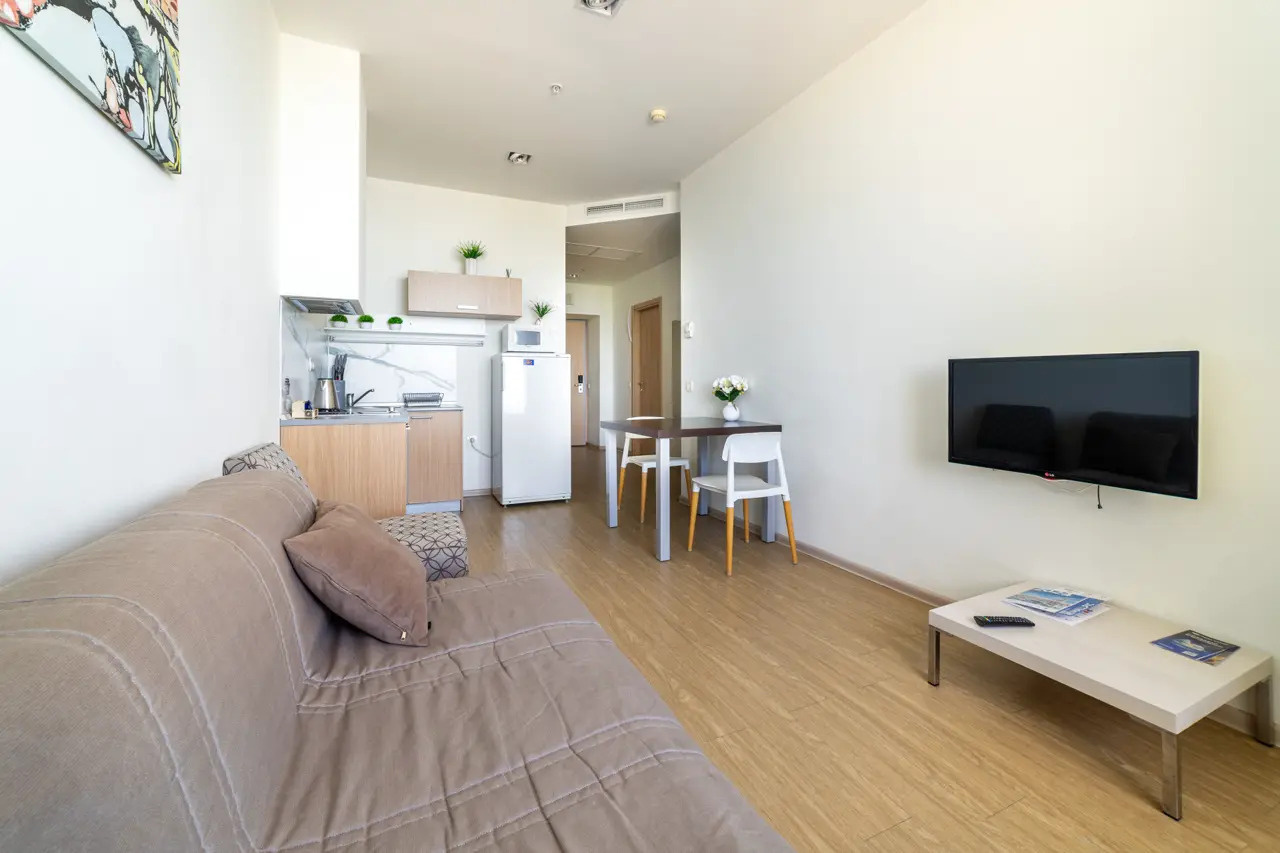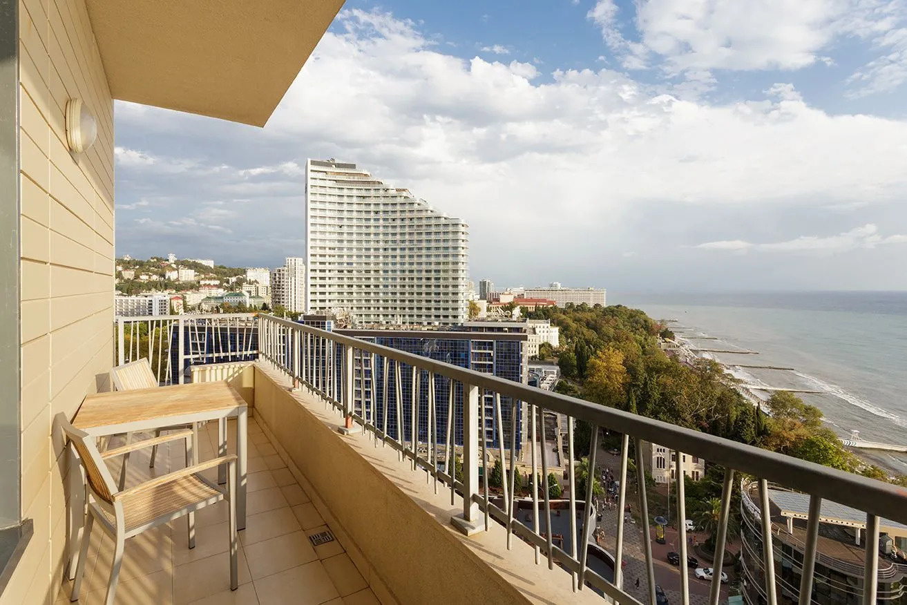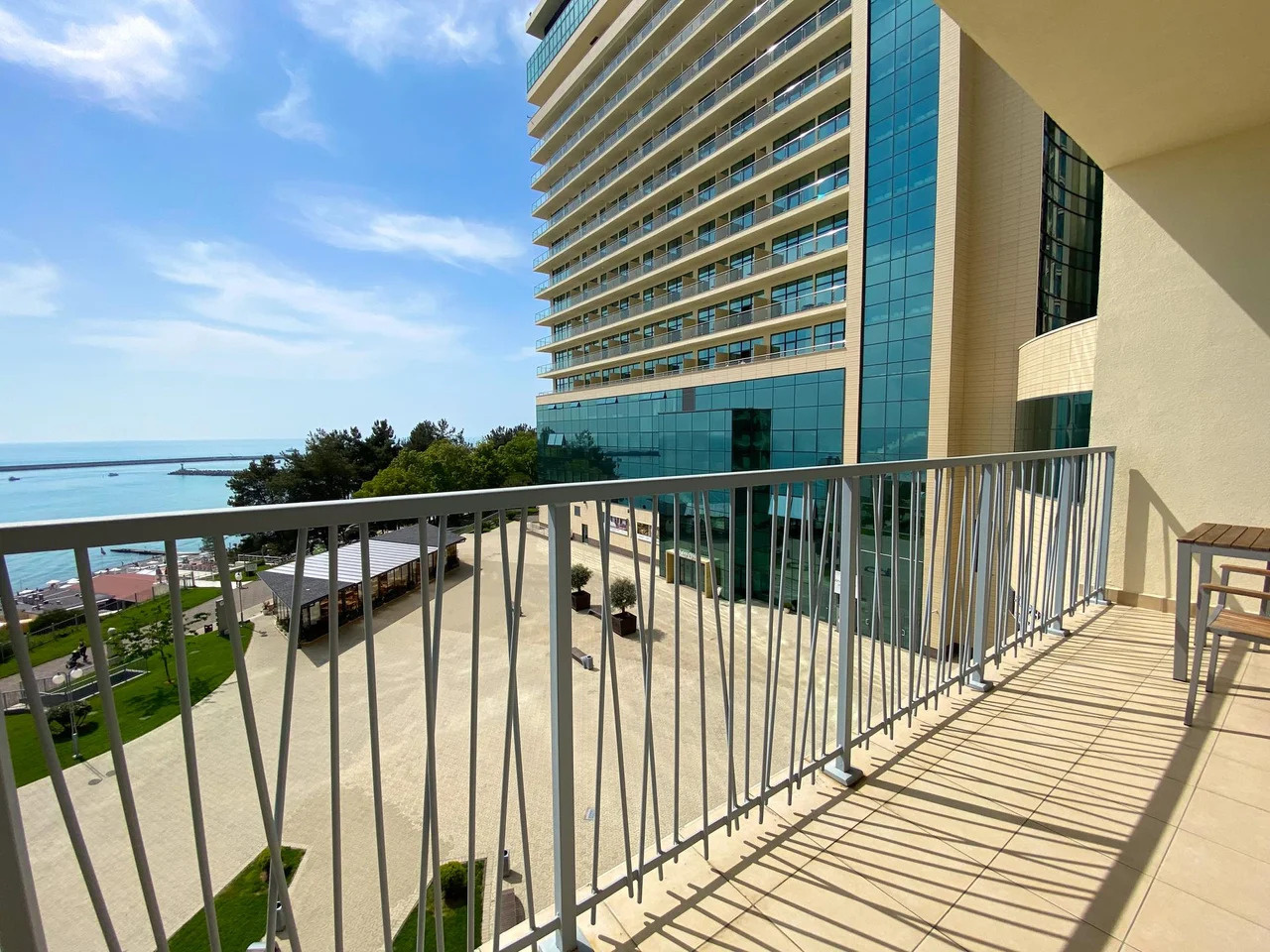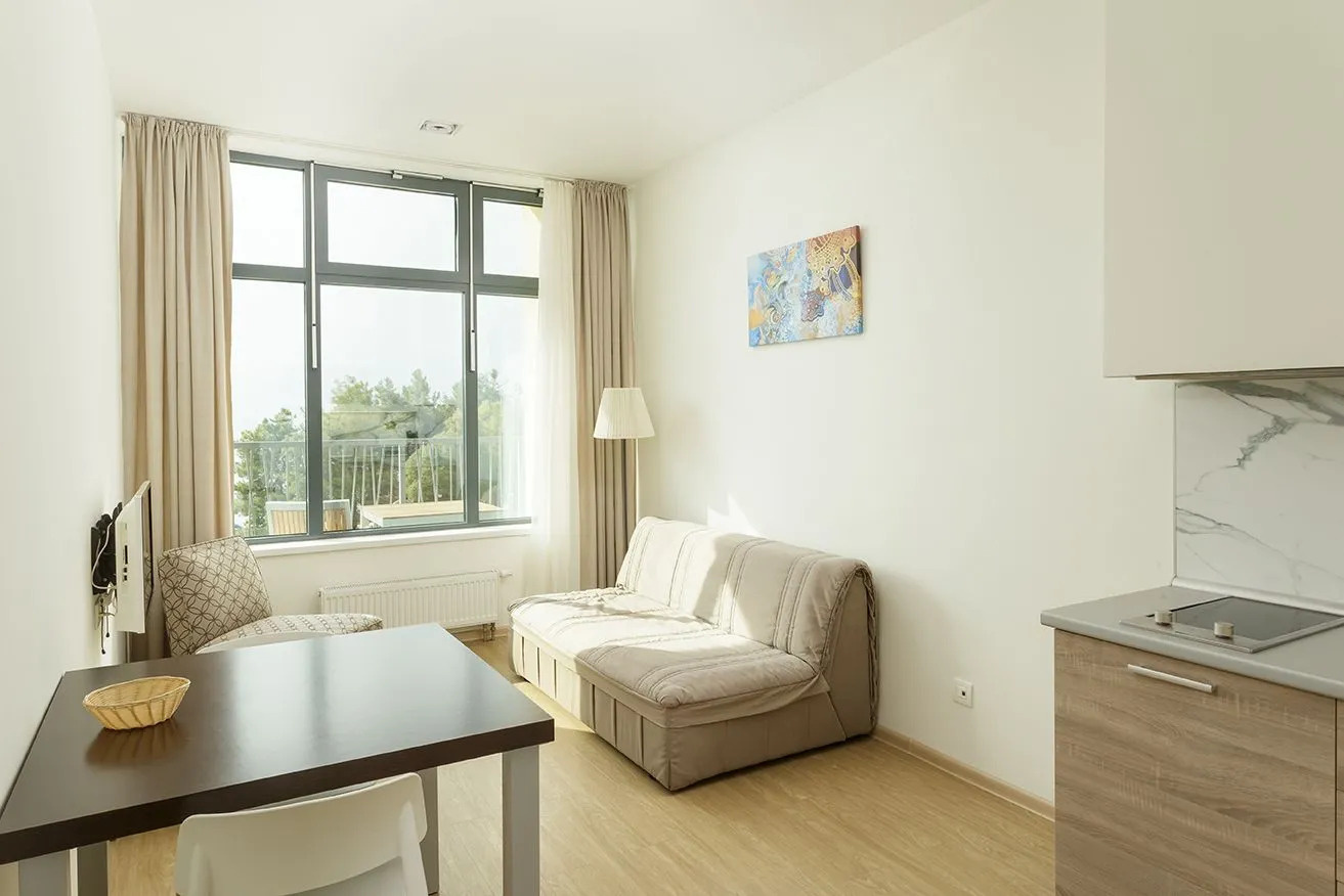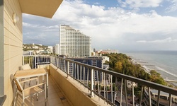 Место расположения супер. В апартаментах все необходимое есть из мебели и бытовой техники. Фактически - 2 комнаты, балкон с видом на море.
