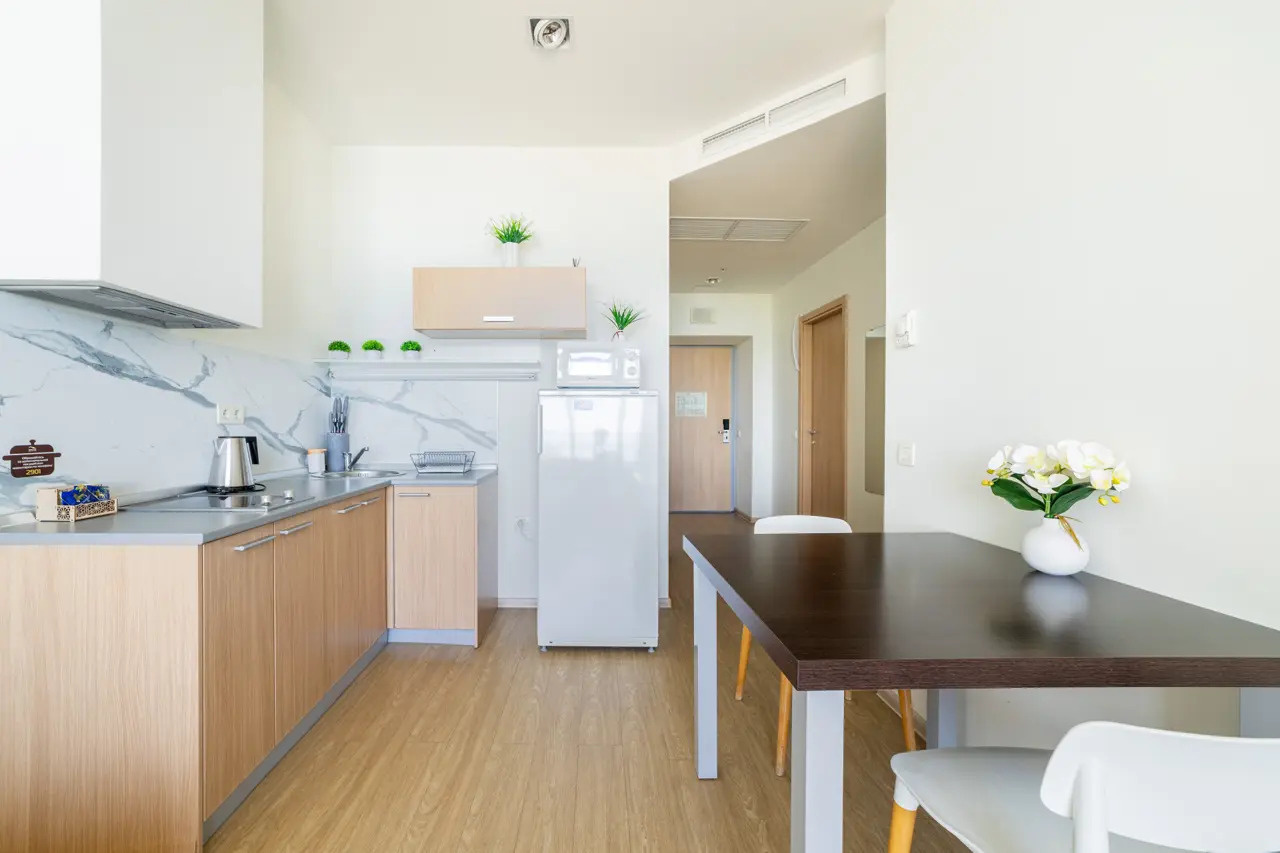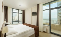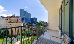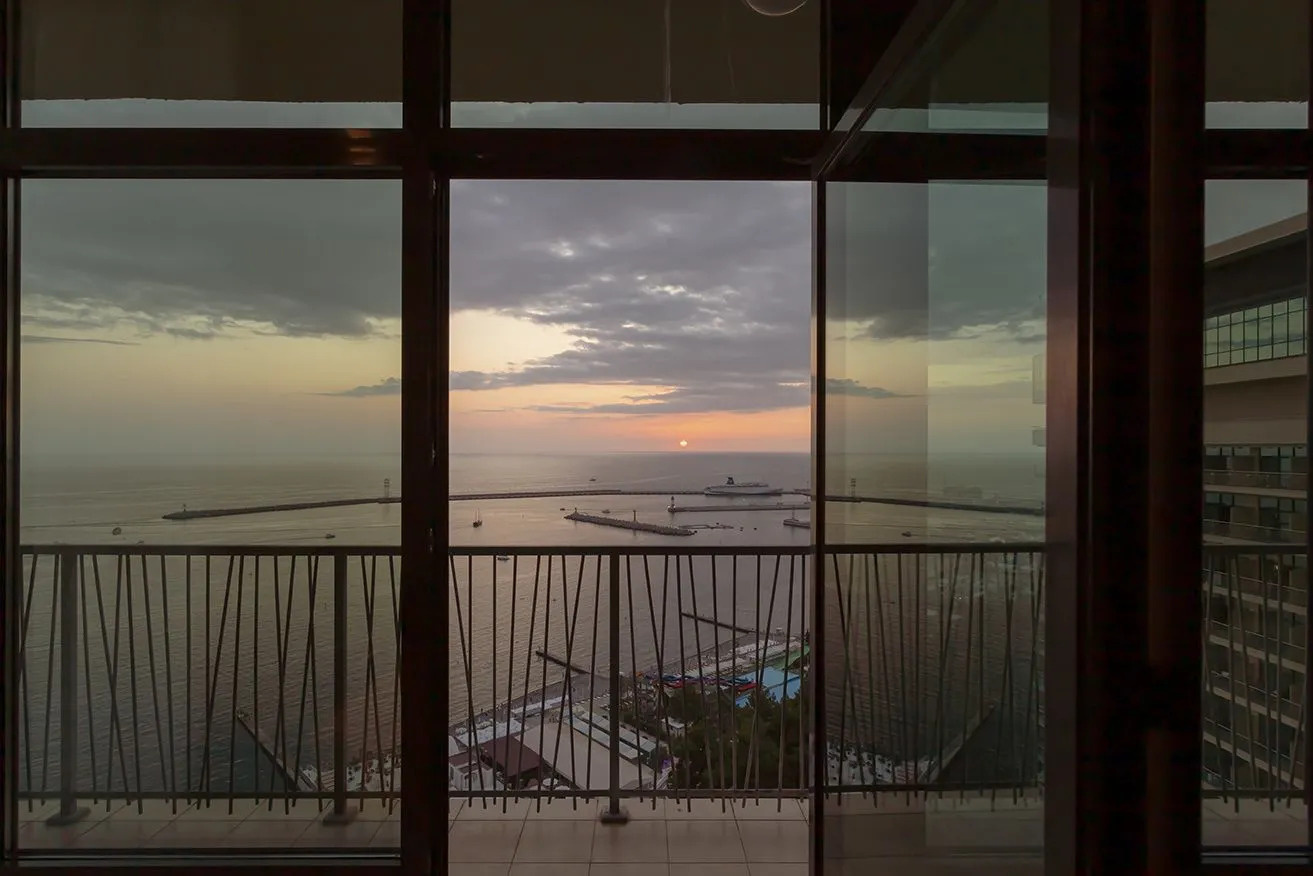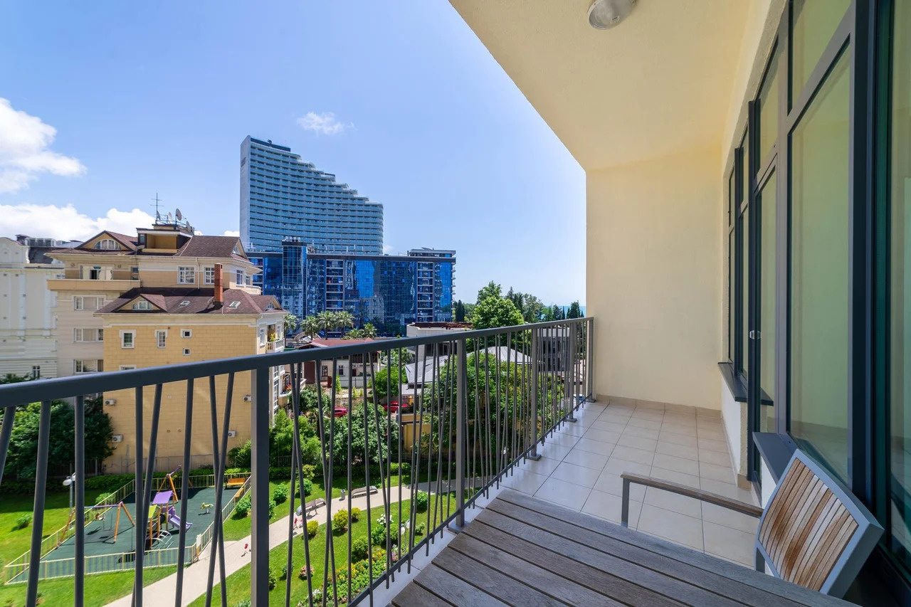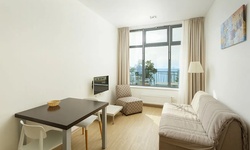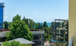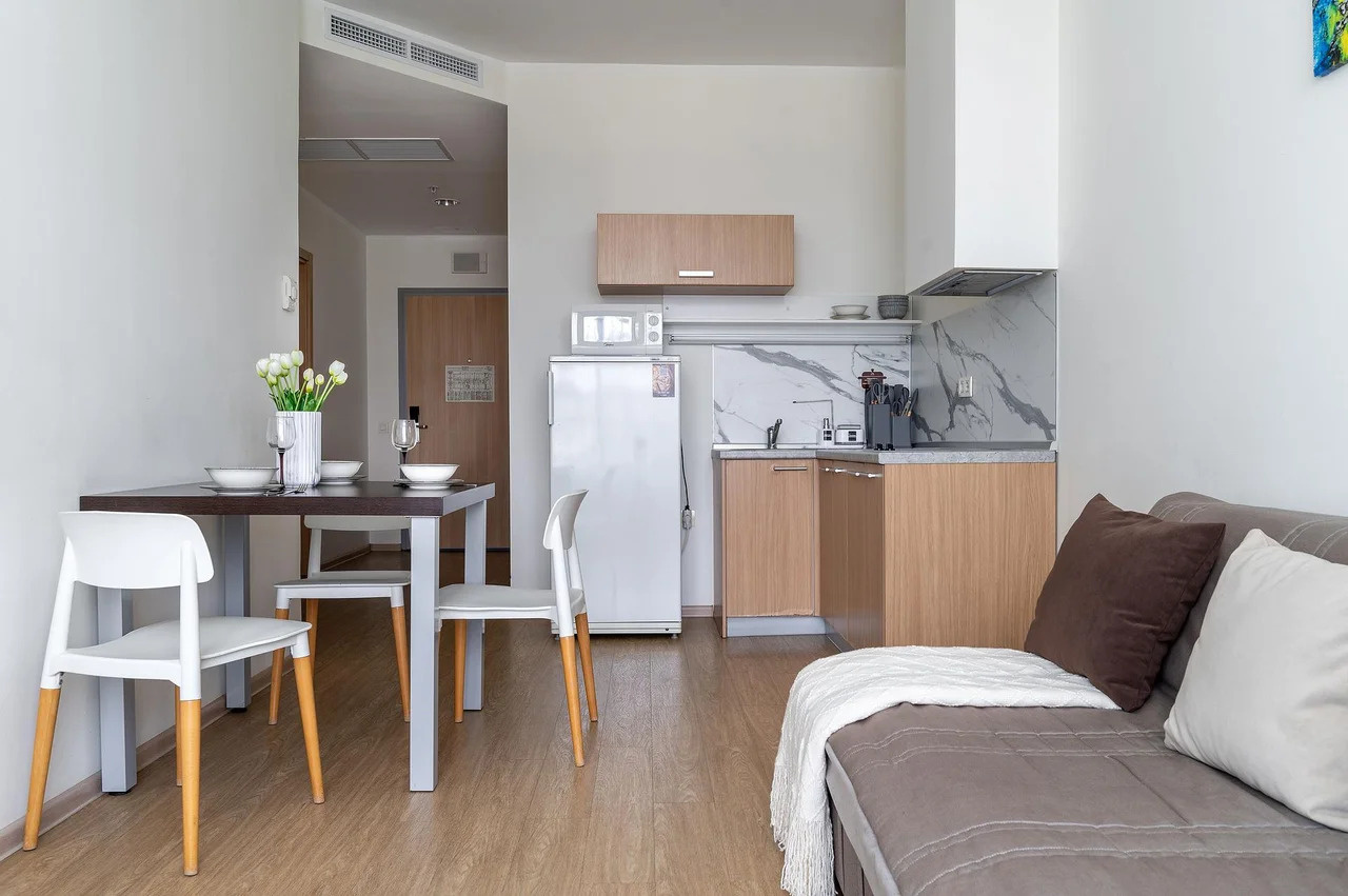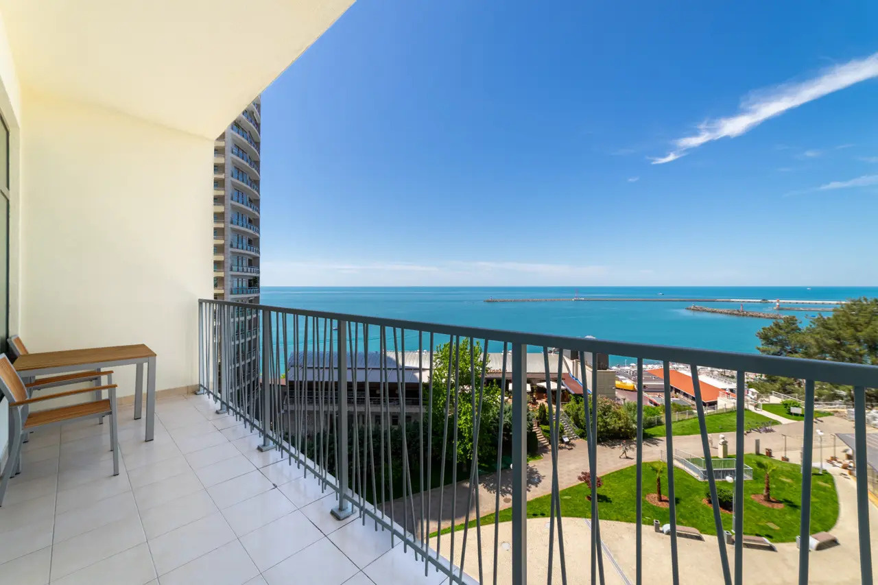 Место расположения супер. В апартаментах все необходимое есть из мебели и бытовой техники. Фактически - 2 комнаты, балкон с видом на море.