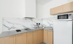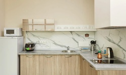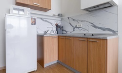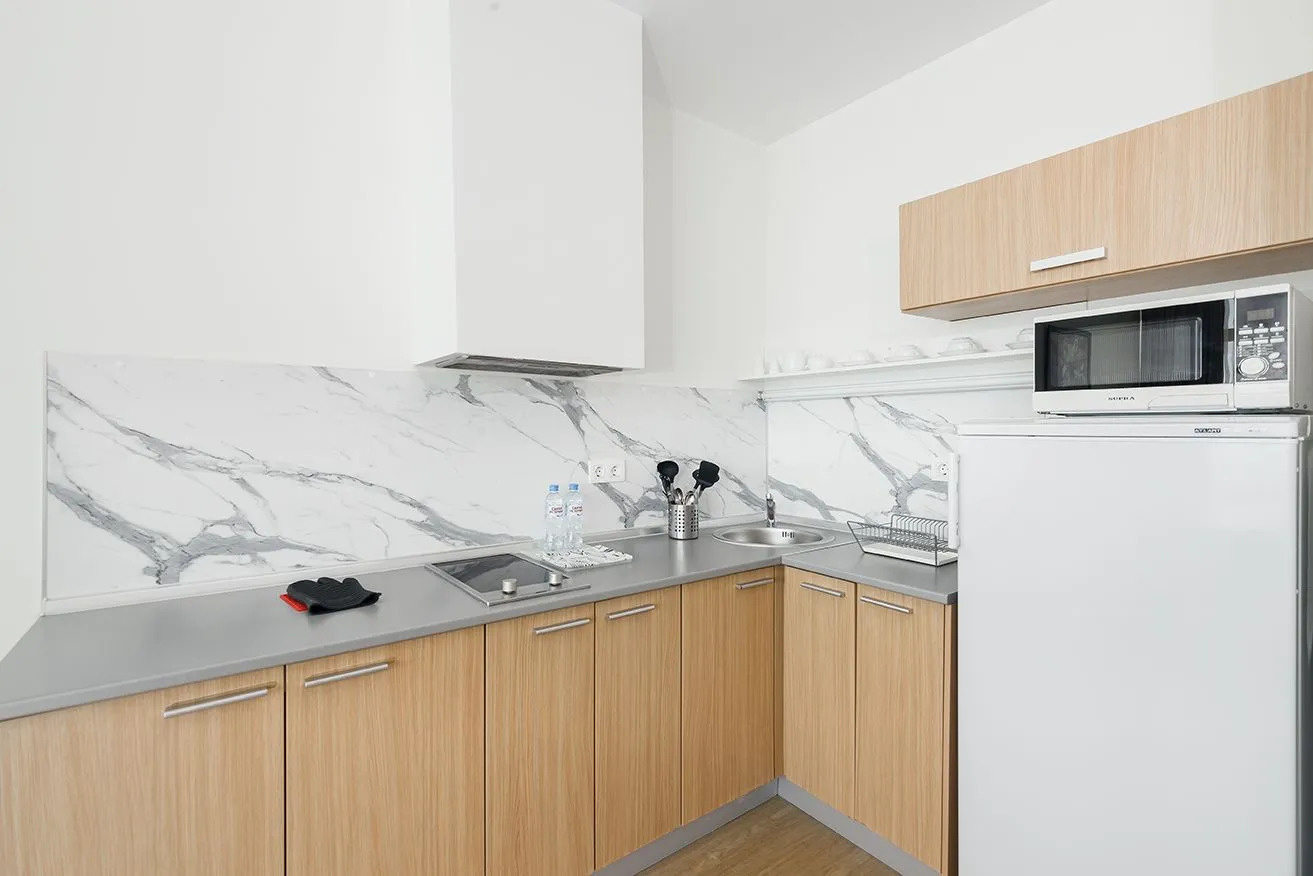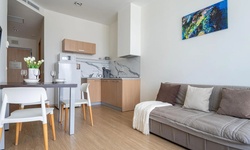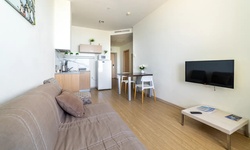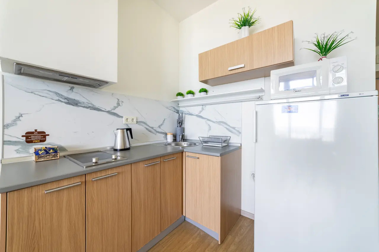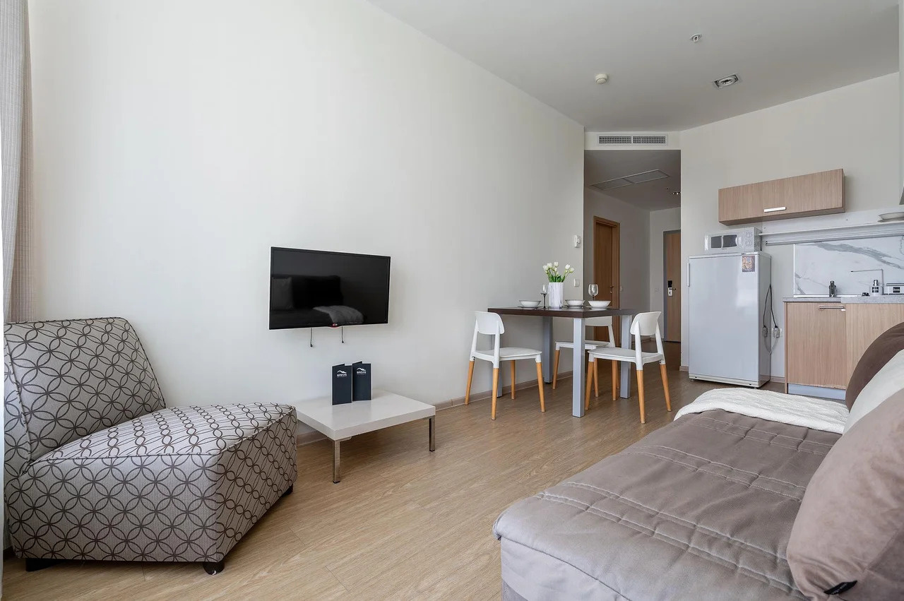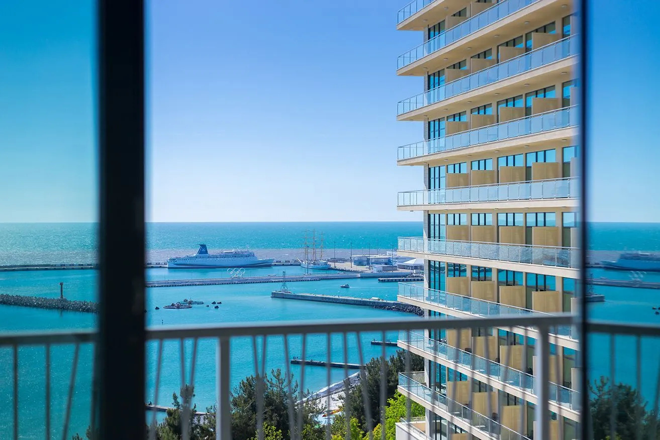 Место расположения супер. В апартаментах все необходимое есть из мебели и бытовой техники. Фактически - 2 комнаты, балкон с видом на море.