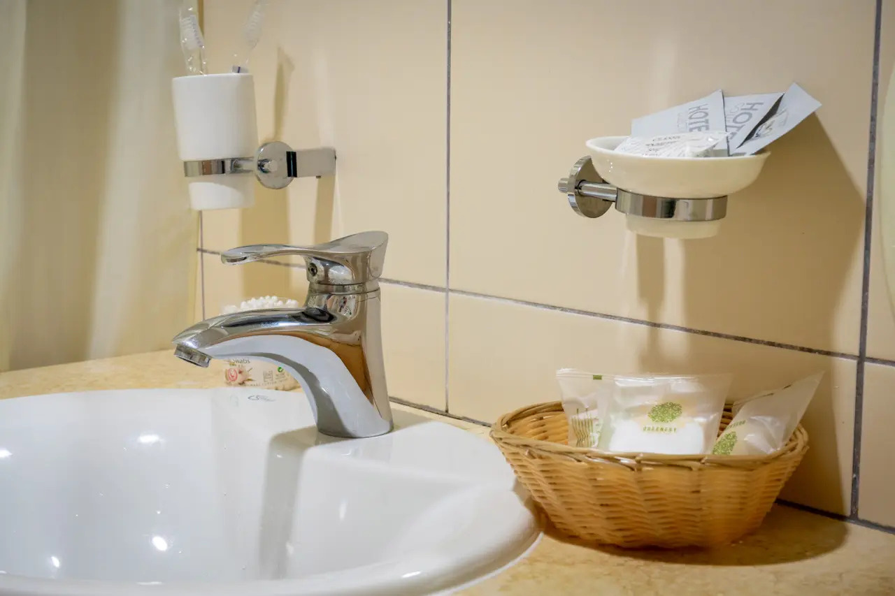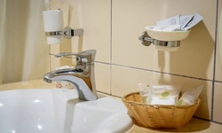 Нет халата, тапочек, из ванных принадлежностей -только жидкое мыло. Номер очень аскетичный, ремонт староват